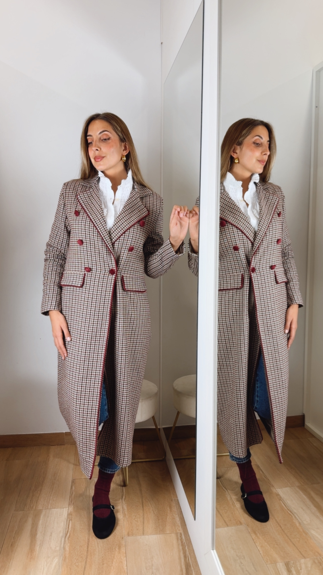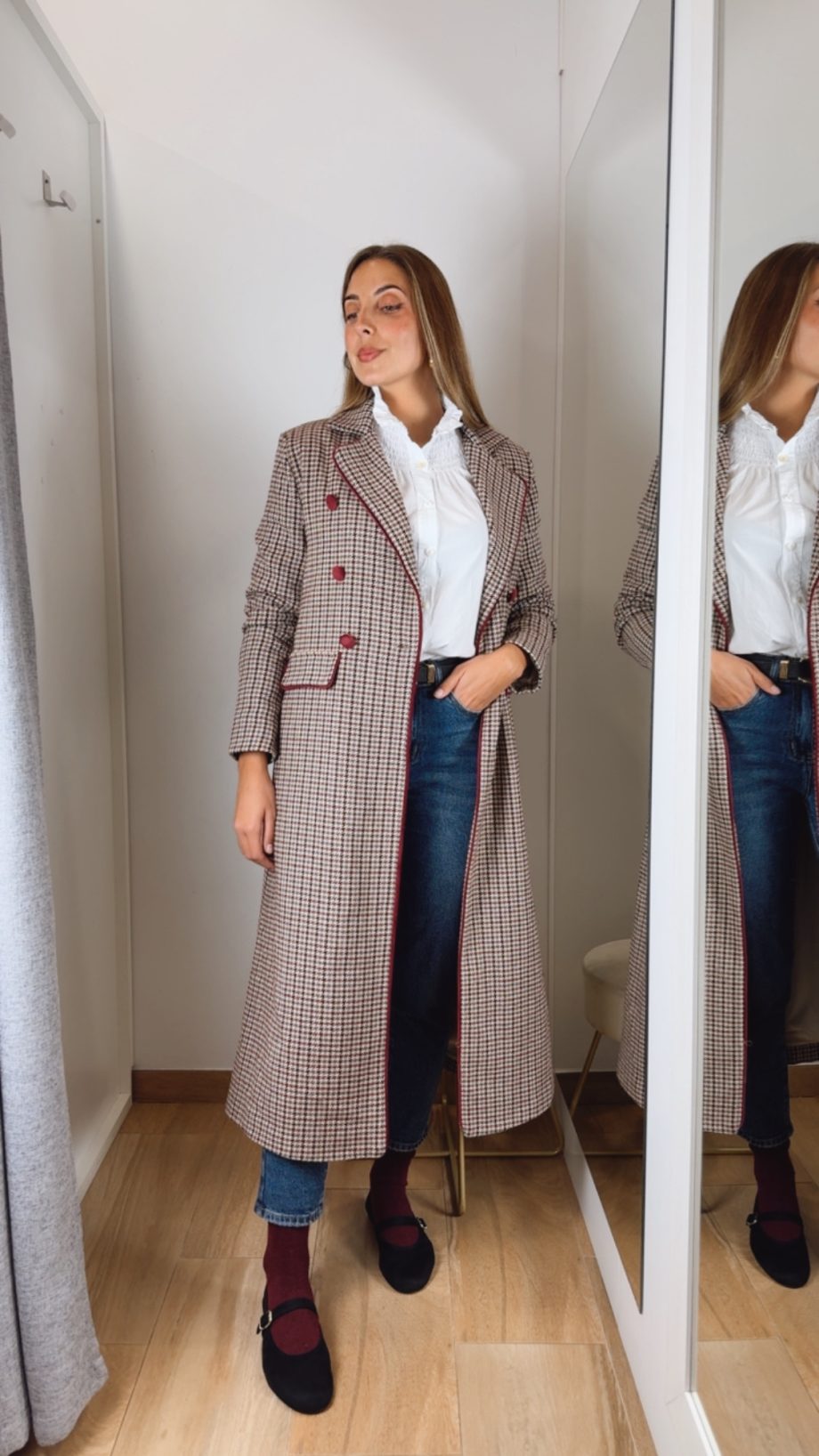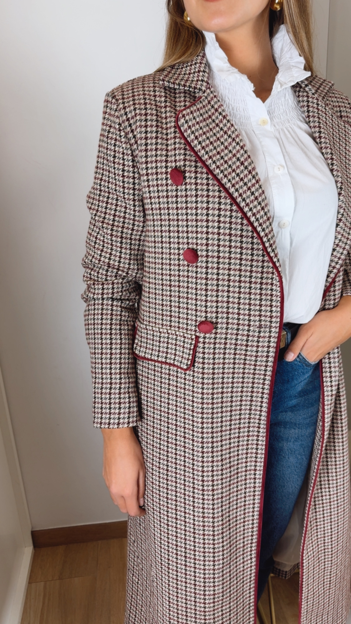 Abrigo en pata de gallo en un tejido de paño totalmente forrado manga larga lleva el detalle del vivo y los botones en terciopelo Burdeos. Falso bolsillo y solapa