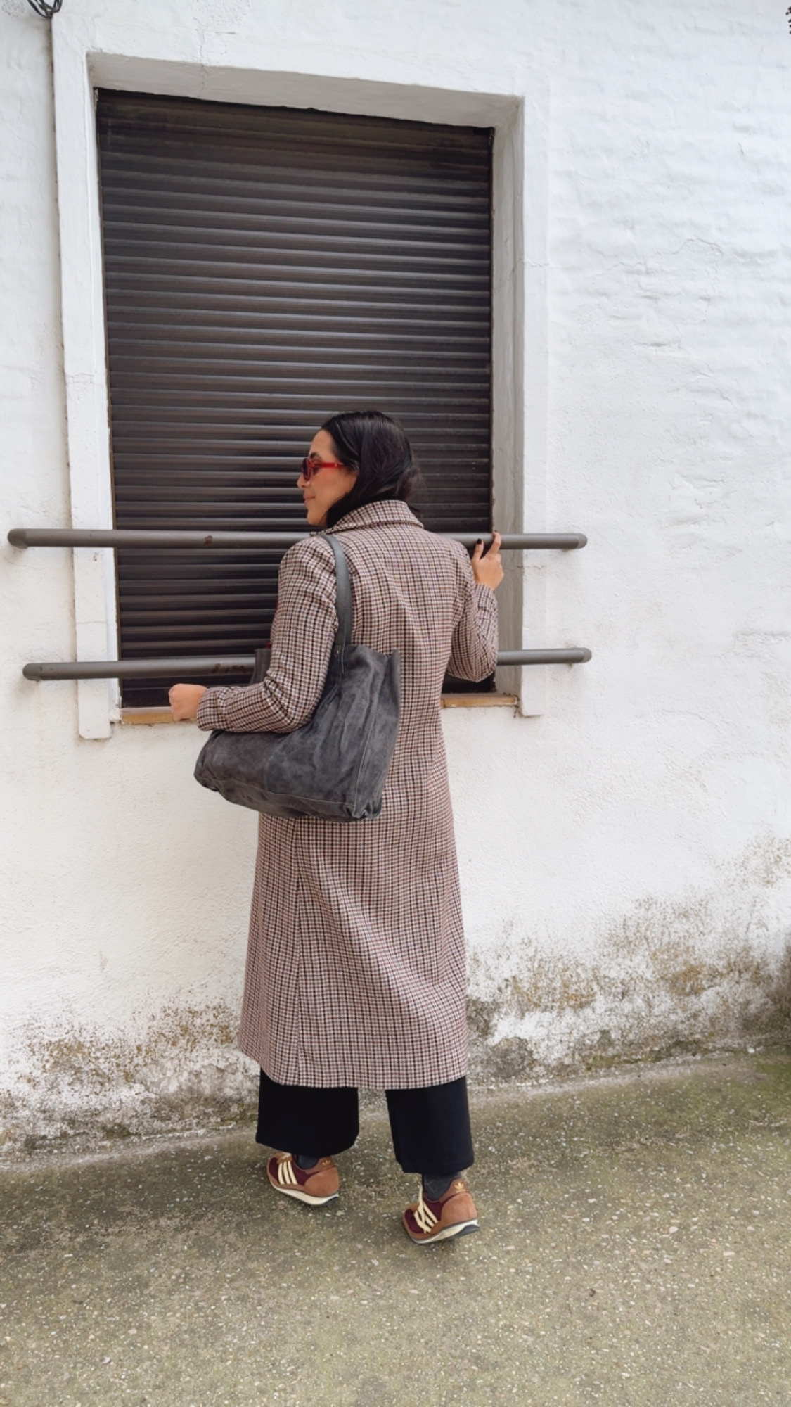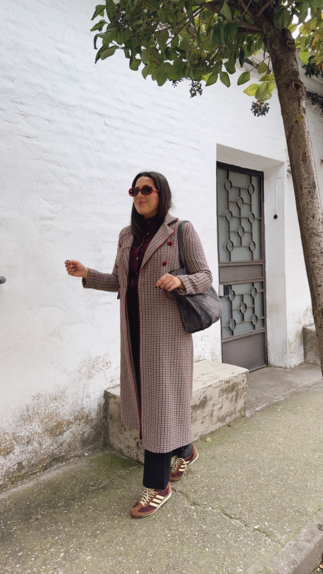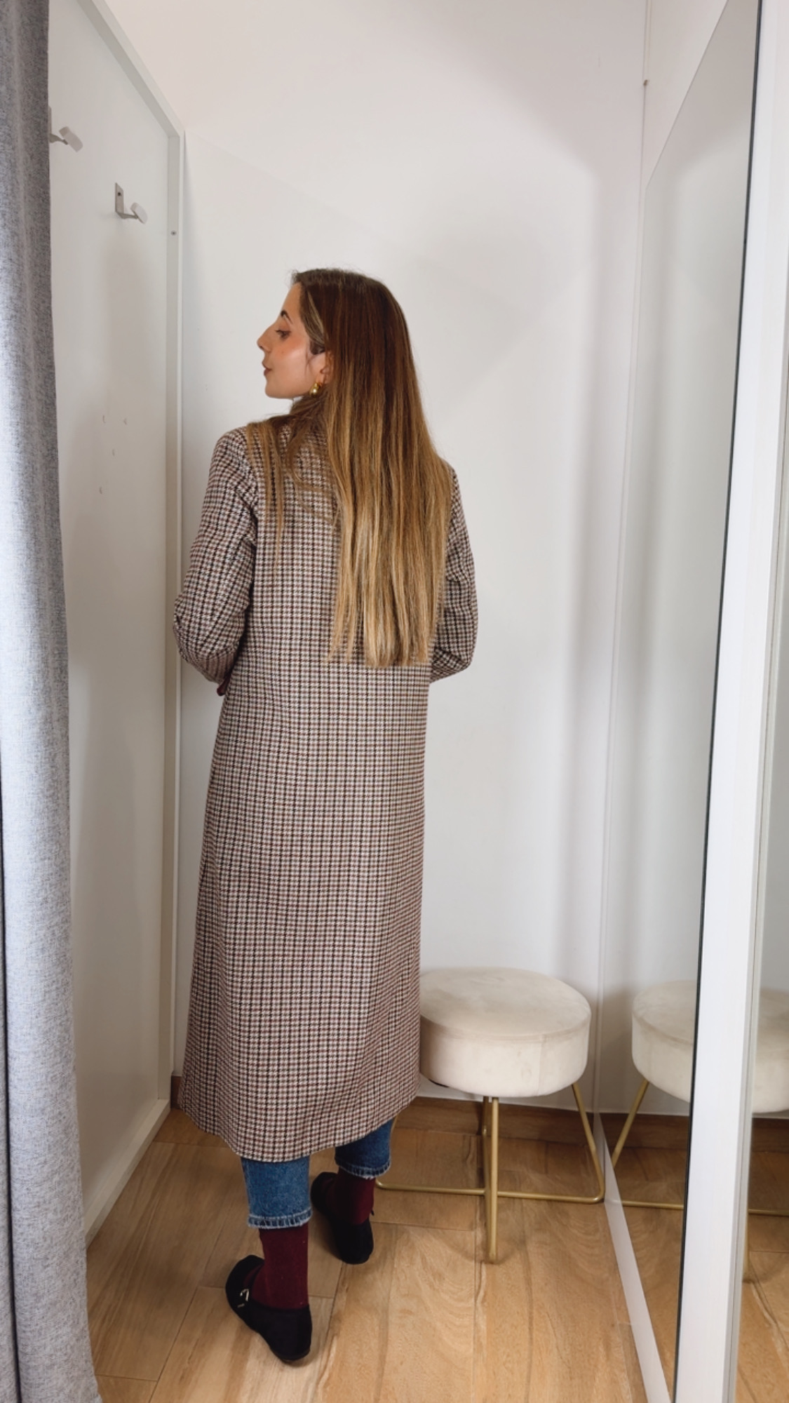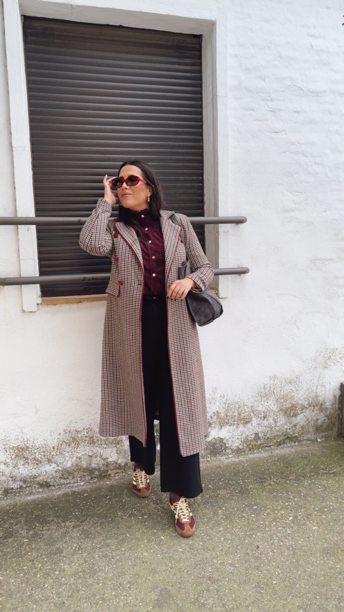 Abrigo en pata de gallo en un tejido de paño totalmente forrado manga larga lleva el detalle del vivo y los botones en terciopelo Burdeos. Falso bolsillo y solapa