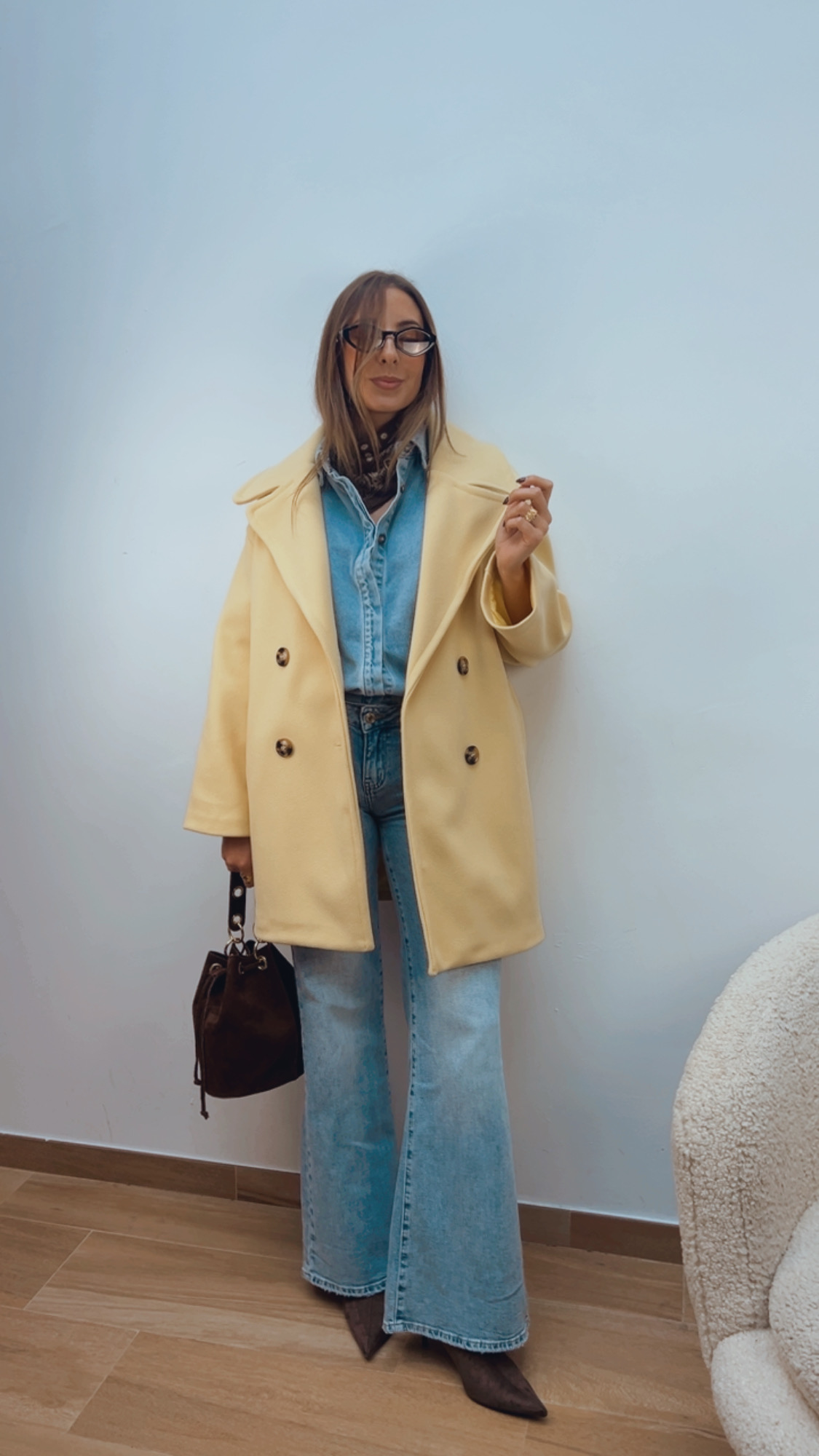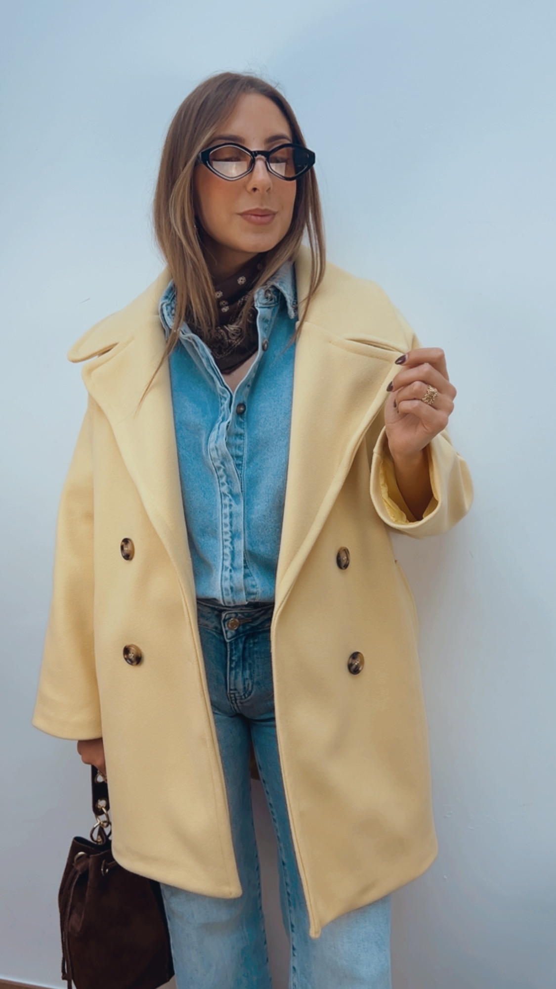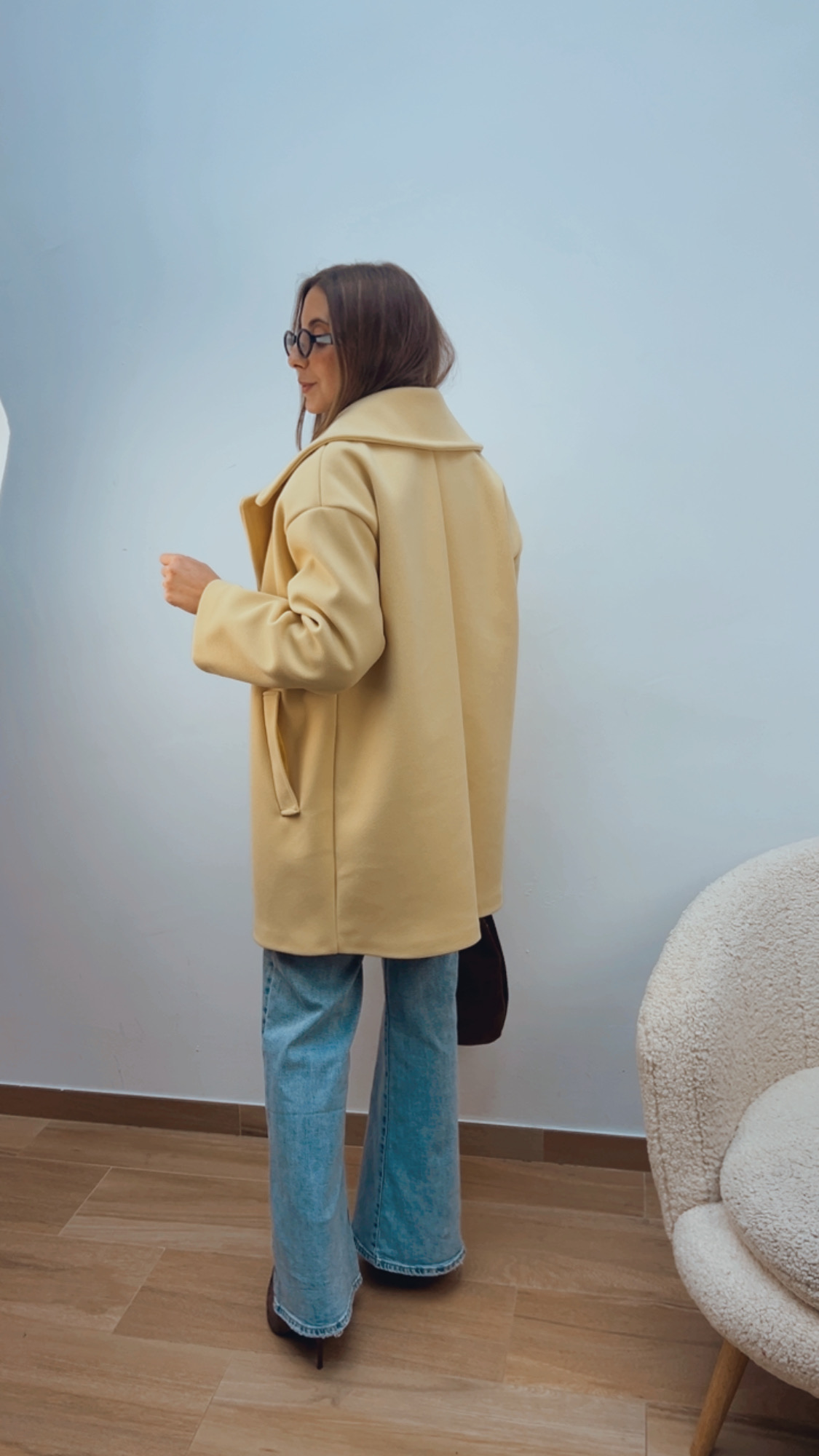 Abrigo de paño en color amarillo pastel, lleva bolsillos y es de manga larga. Tiene un tacto súper suave y agradable, el interior va totalmente forrado.