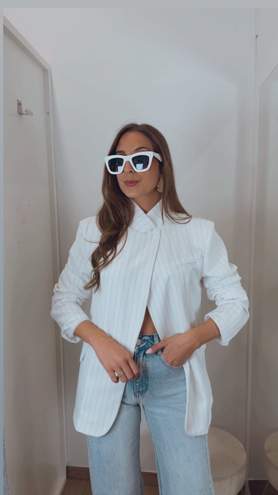 Blazer en color blanco con rayas negras, de diseño cruzado y totalmente forrada, con manga larga y tejido tipo crepé que aporta un acabado elegante. Puede llevarse también como blazer normal, doblando la solapa hacia atrás, lo que la hace muy versátil.