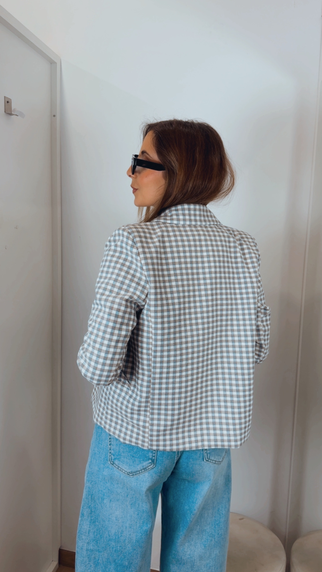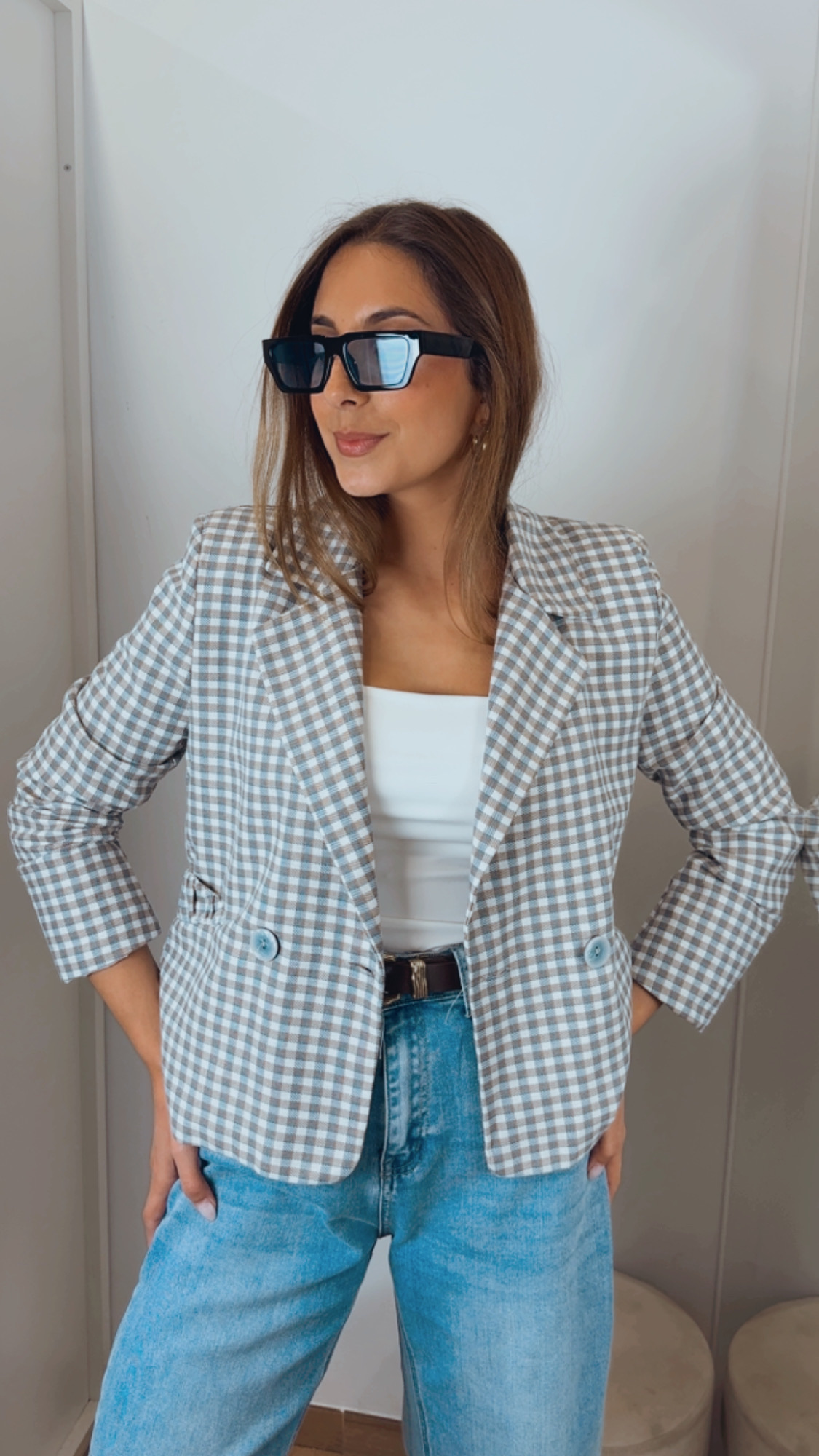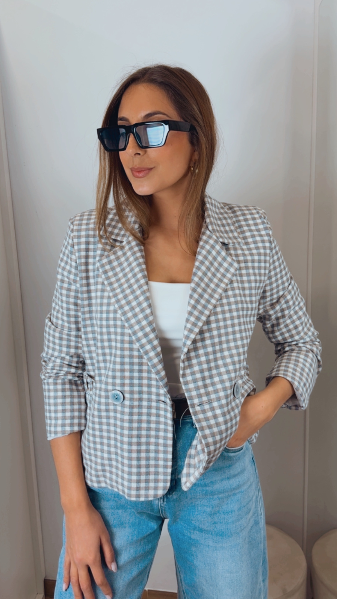 Blazer de cuadros en tonos azul, camel y crudo, perfecta para completar cualquier look de primavera.