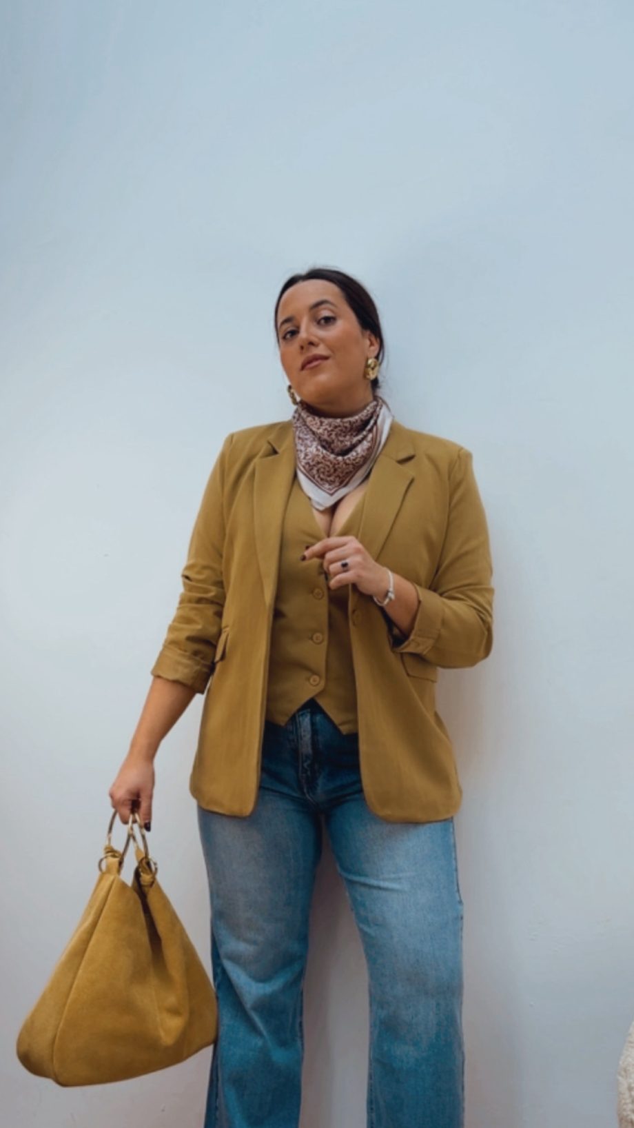 Blazer entallada en color verde oliva, totalmente forrada. Es de manga larga y se abrocha con botón.