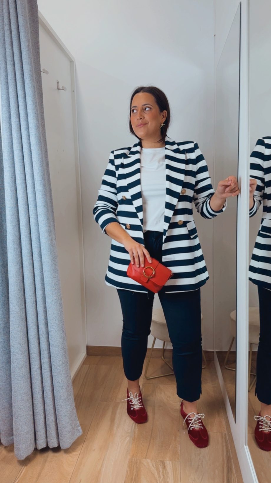 Blazer de raya marinera en azul marino y blanco, un clásico elegante y fácil de combinar. Diseño cruzado, manga larga e interior forrado, con botones dorados que aportan un toque sofisticado. Incluye bolsillos y permite ajustar el cruce según cómo se abroche.