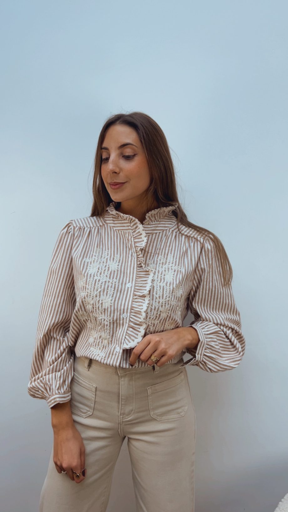 Blusa abotonada hasta abajo con detalle de pasamanería en la parte del pecho y del cuello, el fondo es en camel y rayas en crudo, con los bordados en crudo. Es de manga larga y lleva botón al final de la manga.