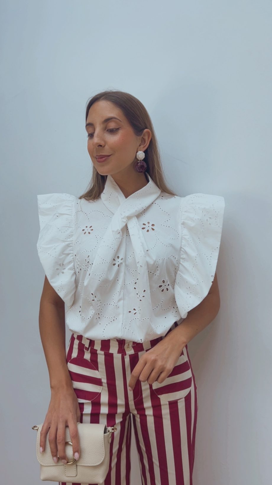 Blusa blanca troquelada con diseño cruzado en el cuello, muy elegante y femenino. Destaca por su tejido calado y el detalle de volantes en las mangas, que aportan movimiento y un acabado especial.