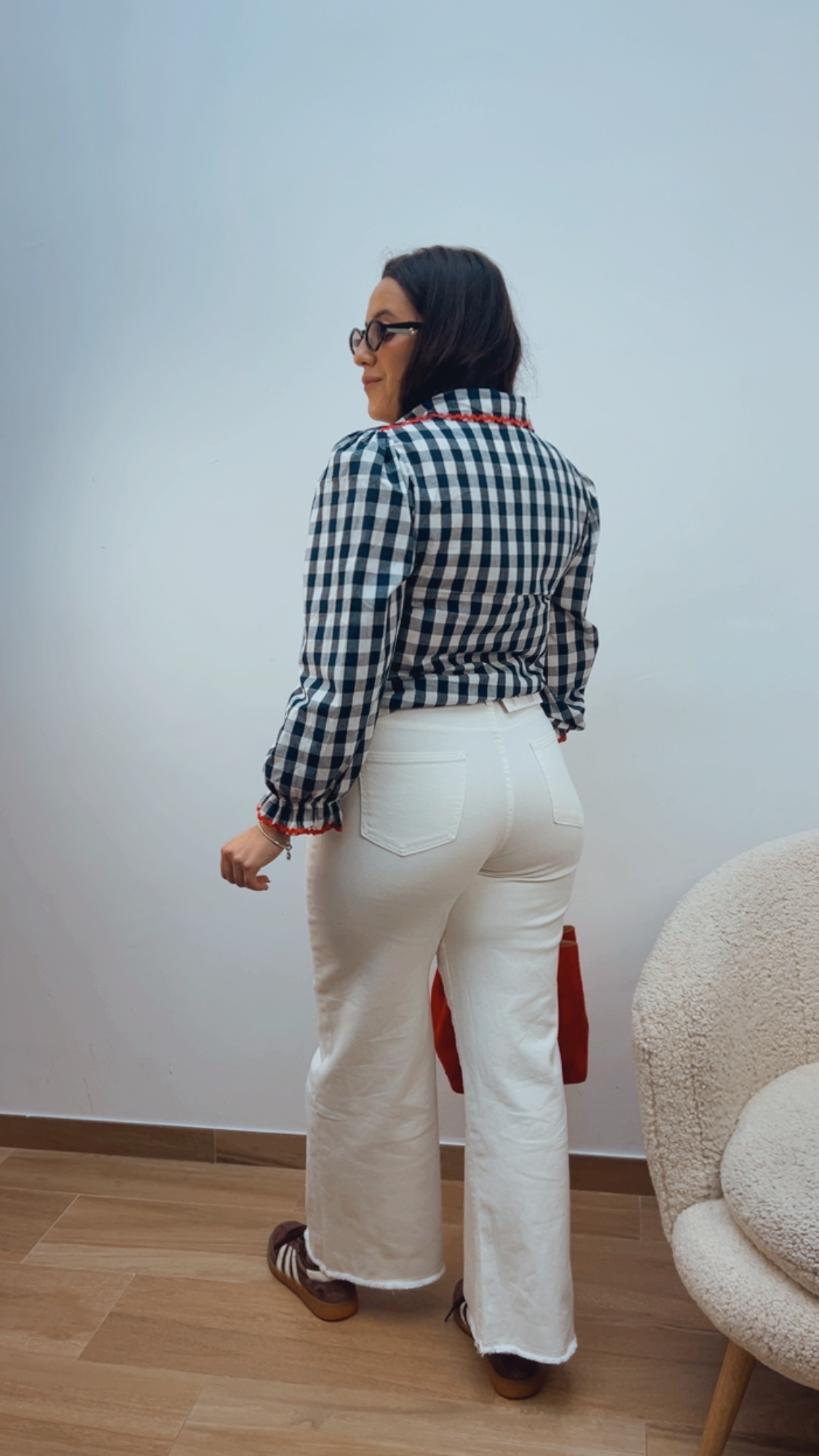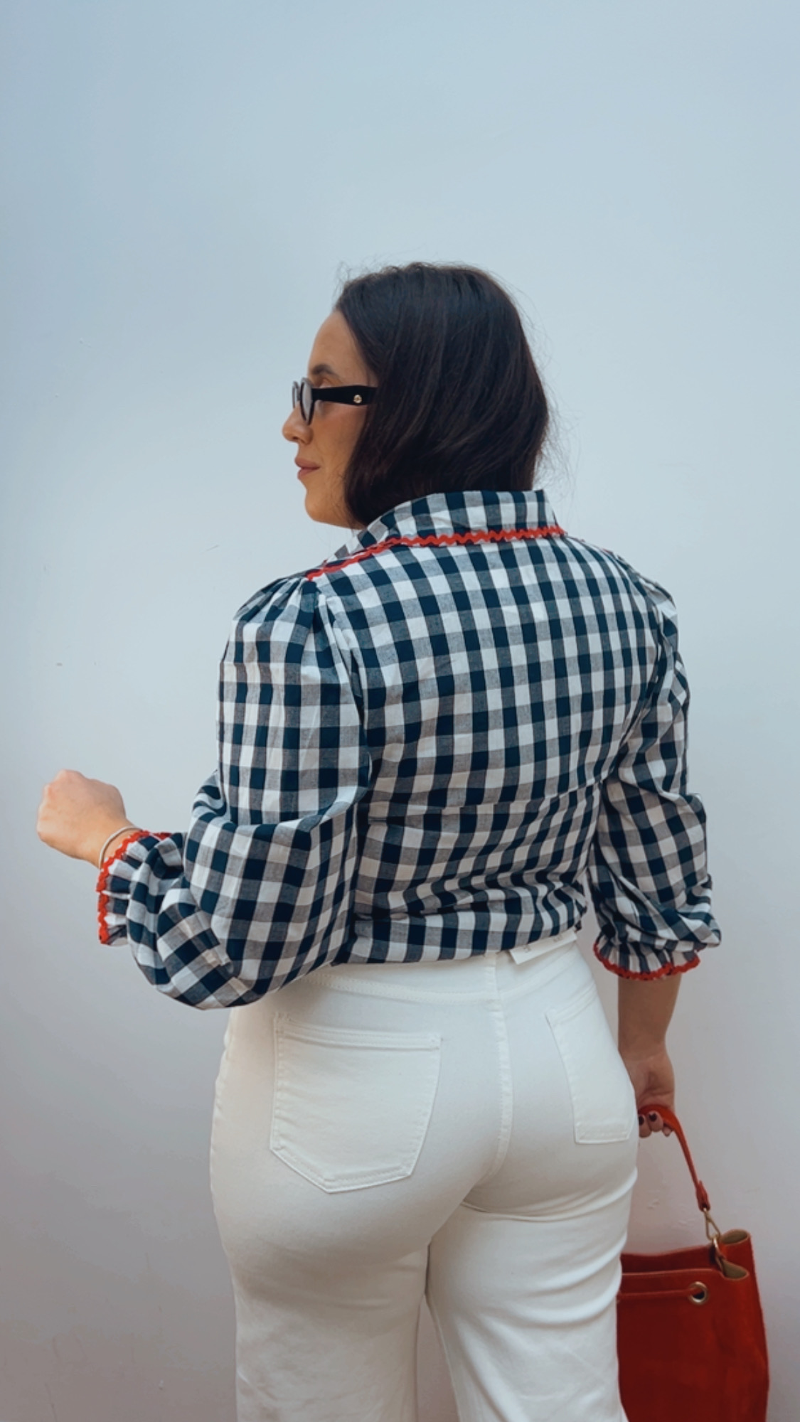 Camisa de manga larga con detalle de la goma en el final del puño, lo que lo hace tipo abullonada. Va abotonada hasta abajo, perfecta para las mamás que en el pecho. El cuello es camisero y lleva el detalle de la pasamanería en color coral.
