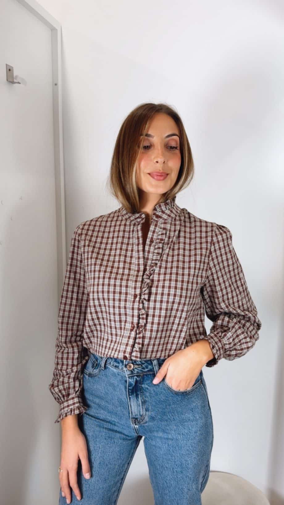 Blusa cuello Mao con detalle de volante en el cuello y en la parte del pecho hasta abajo. Los puños también llevan un detalle de volante y botones forrados.
