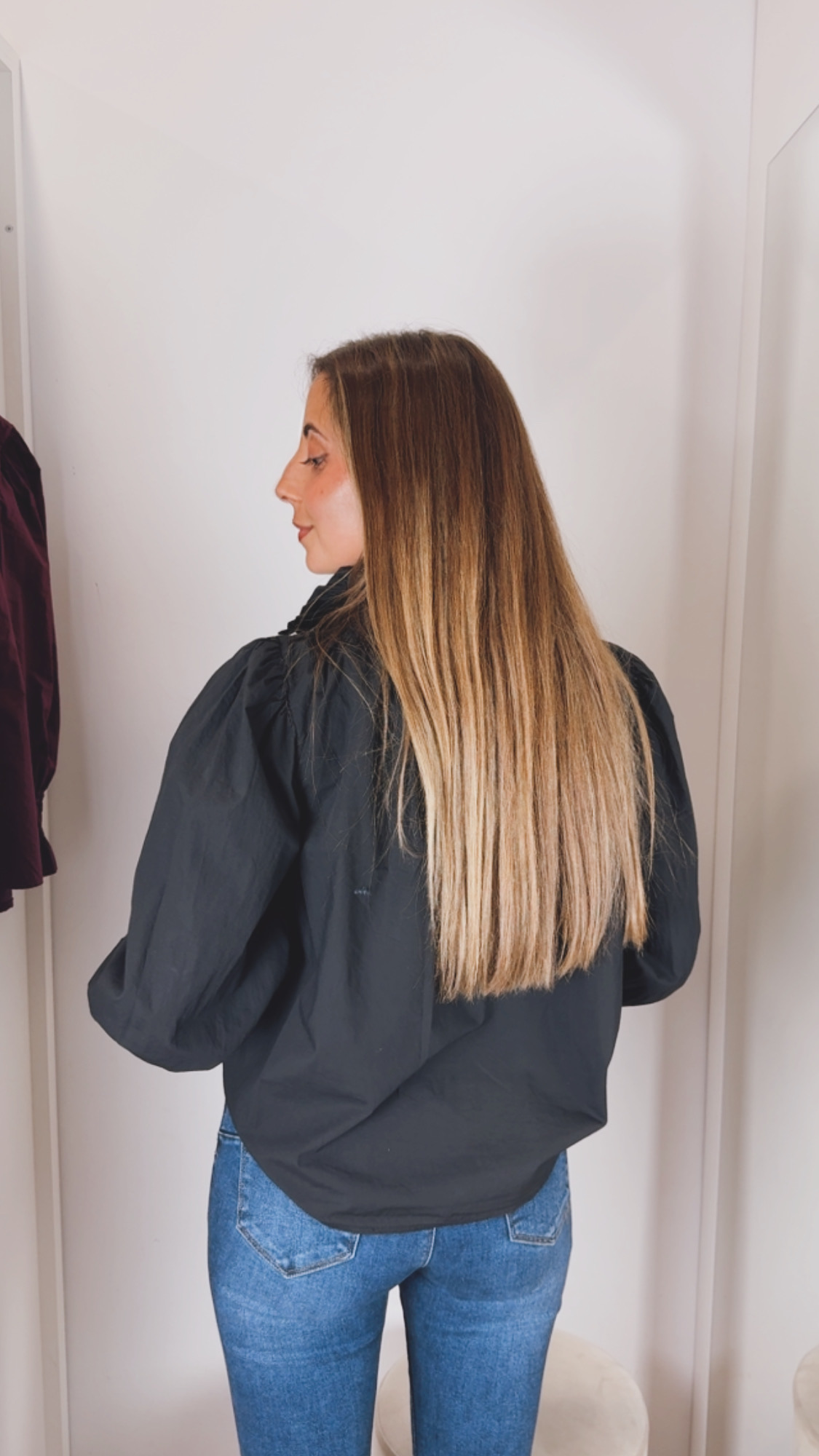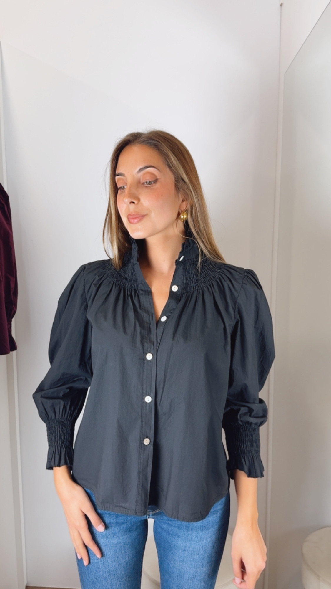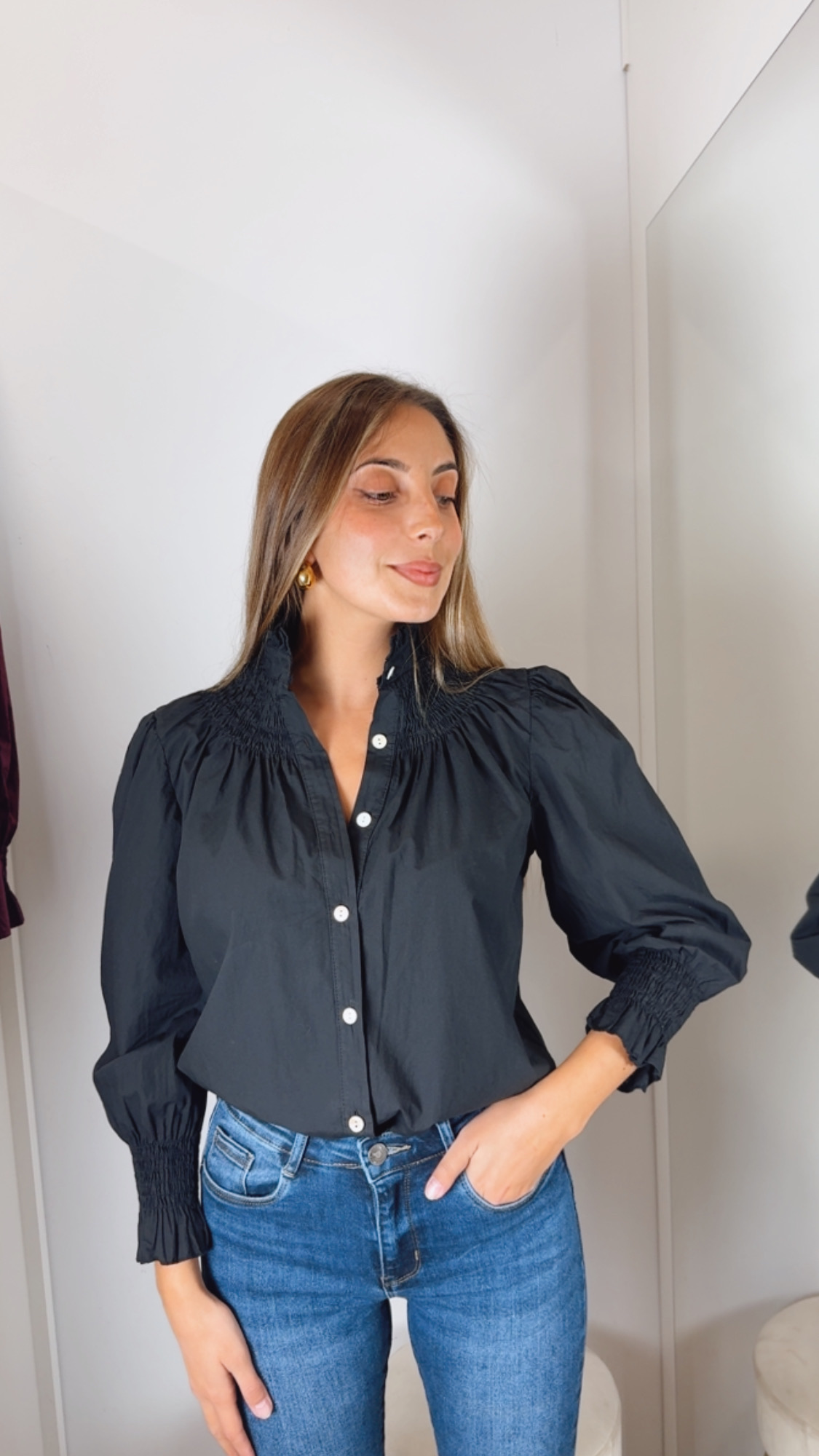 Camisa abotonada hasta abajo con detalle de panel de abeja en el cuello.