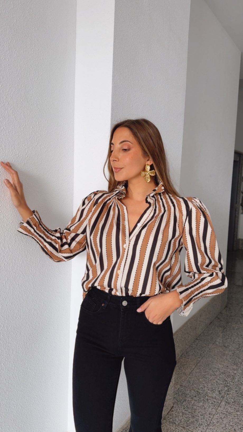 Blusa  con detalle de panel de abeja en el cuello y puños