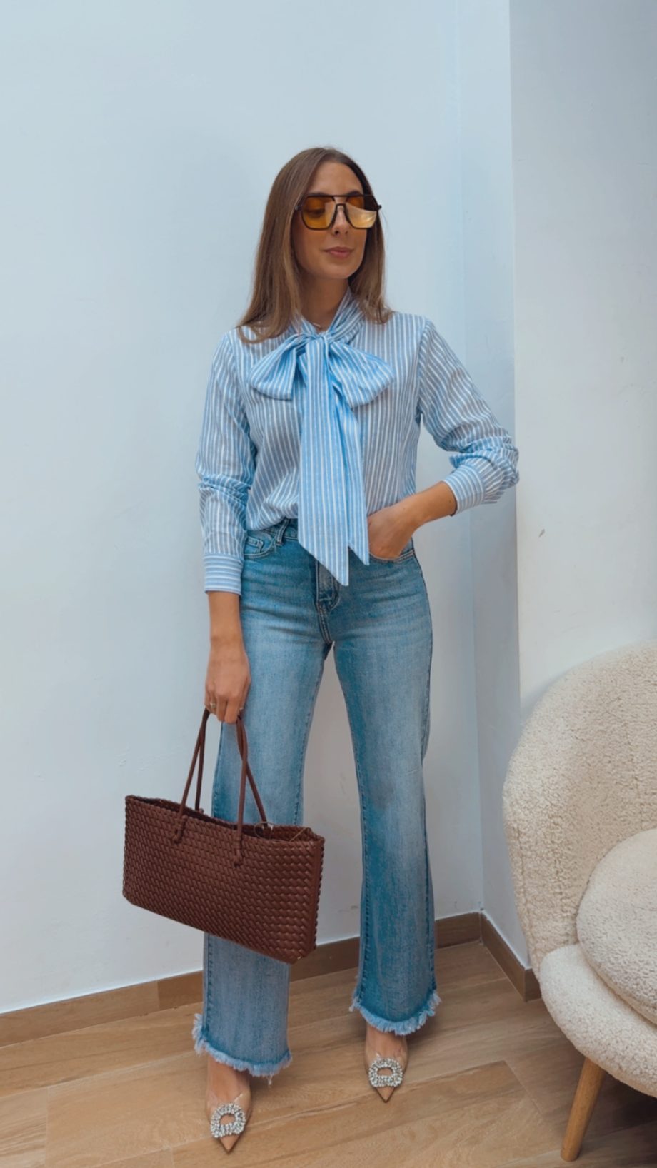 Blusa lazada en color azul celeste con la raya en color blanco. Lleva detrás de la lazada va abotonada hasta abajo en el final del puño y también lleva botón.
