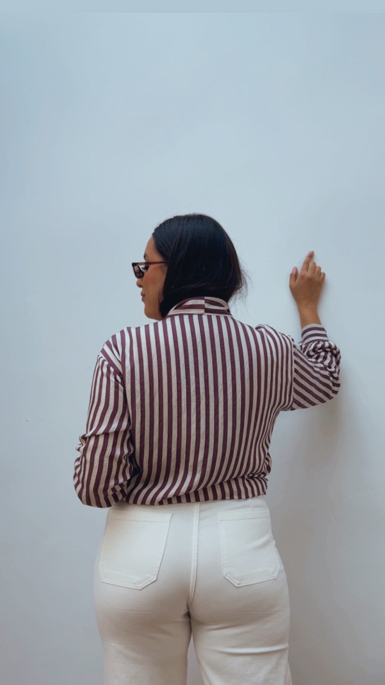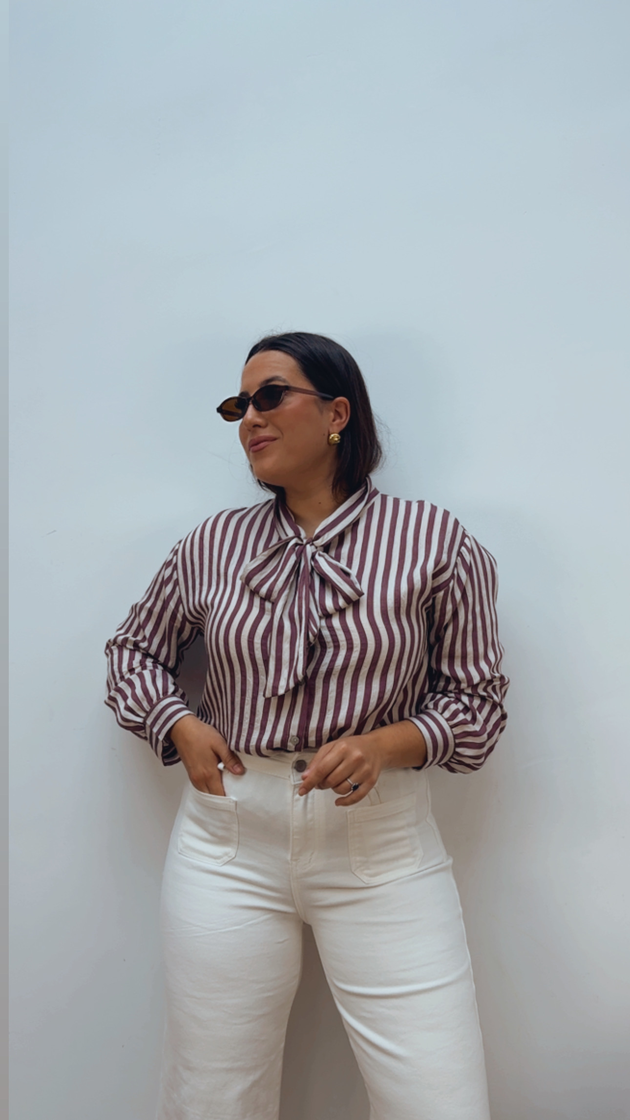 Sofisticada blusa de lazo en rayas burdeos y color crudo, perfecta para aportar elegancia y calidez a tus looks. De manga larga y abotonada hasta abajo, permite llevarla cerrada o con un escote más relajado.