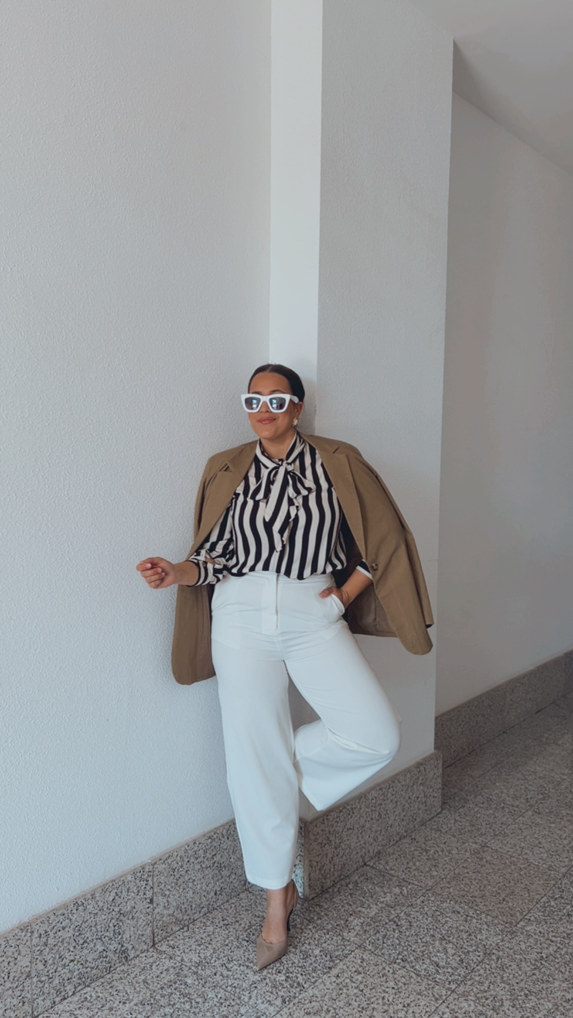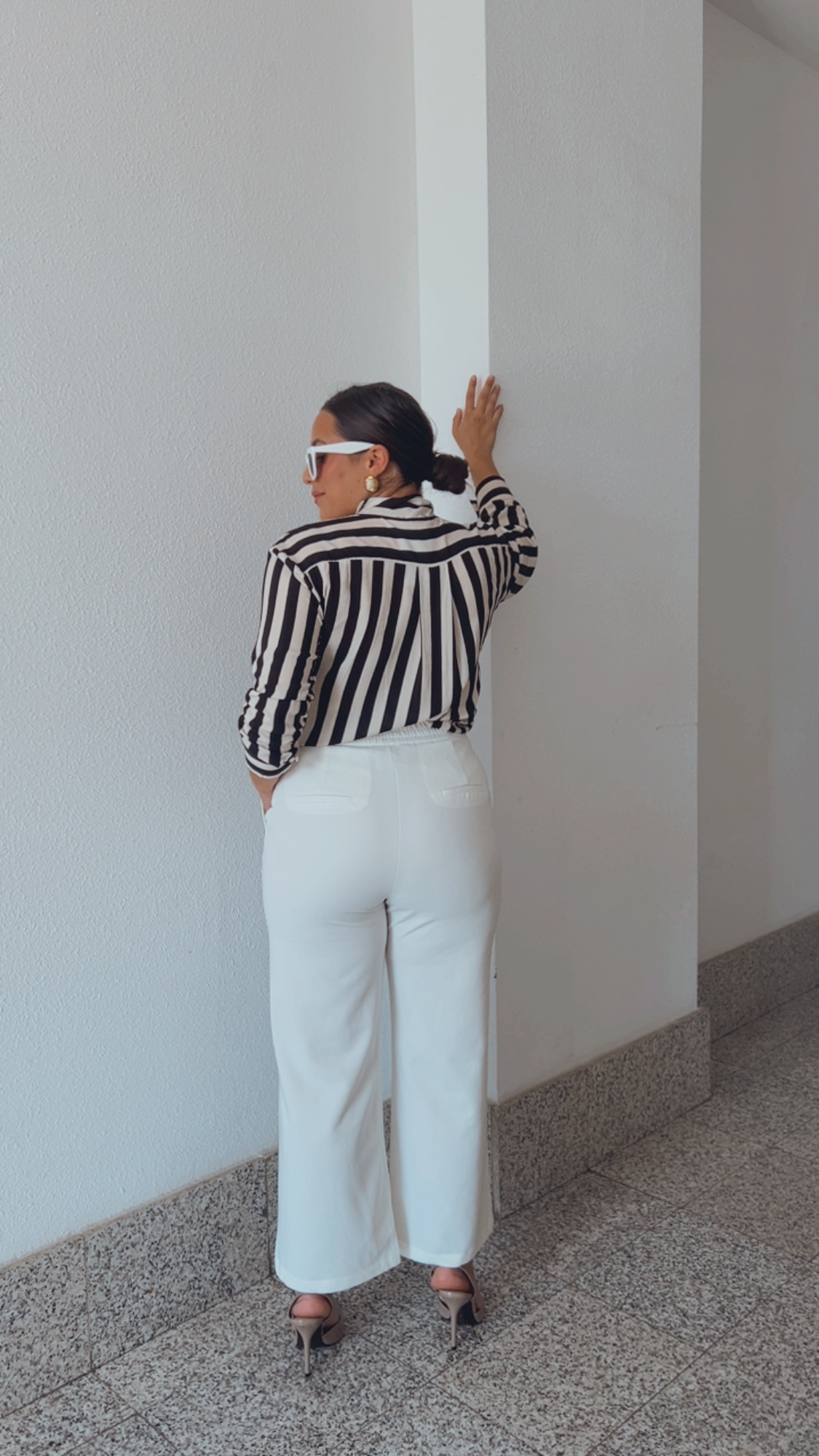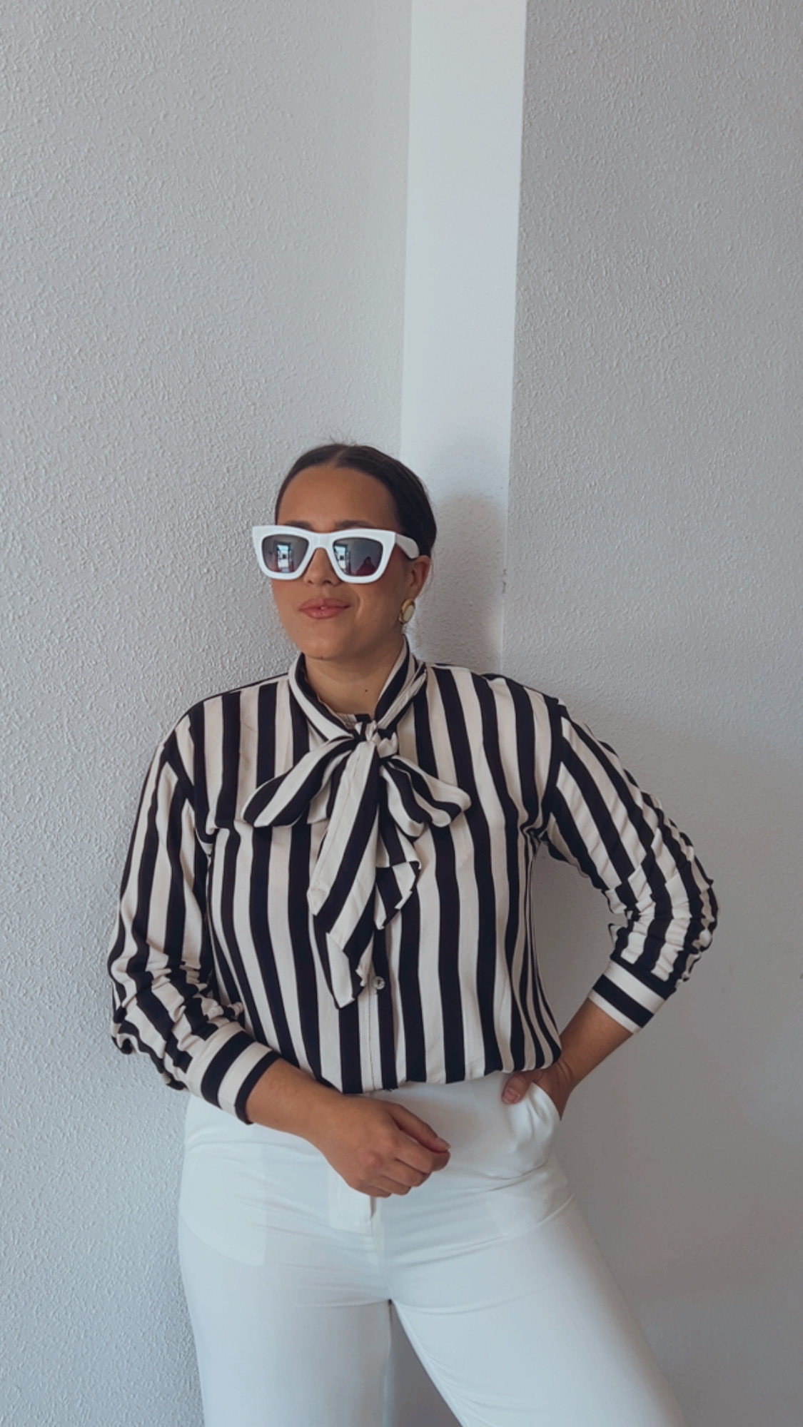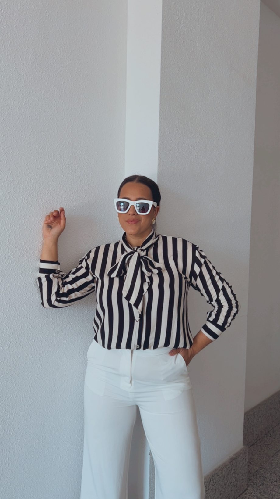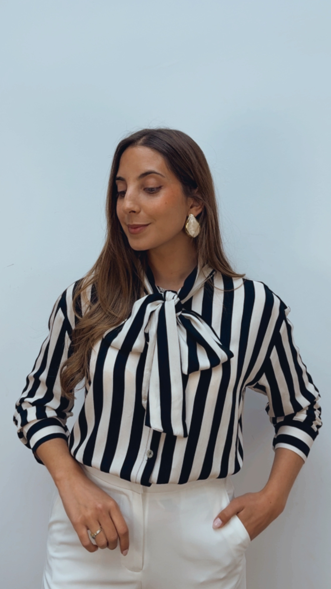 Blusa de rayas en crudo y negro, con detalle de lazada en el cuello que aporta un toque elegante y femenino. Va abotonada y el puño también lleva cierre con botón, cuidando cada detalle.