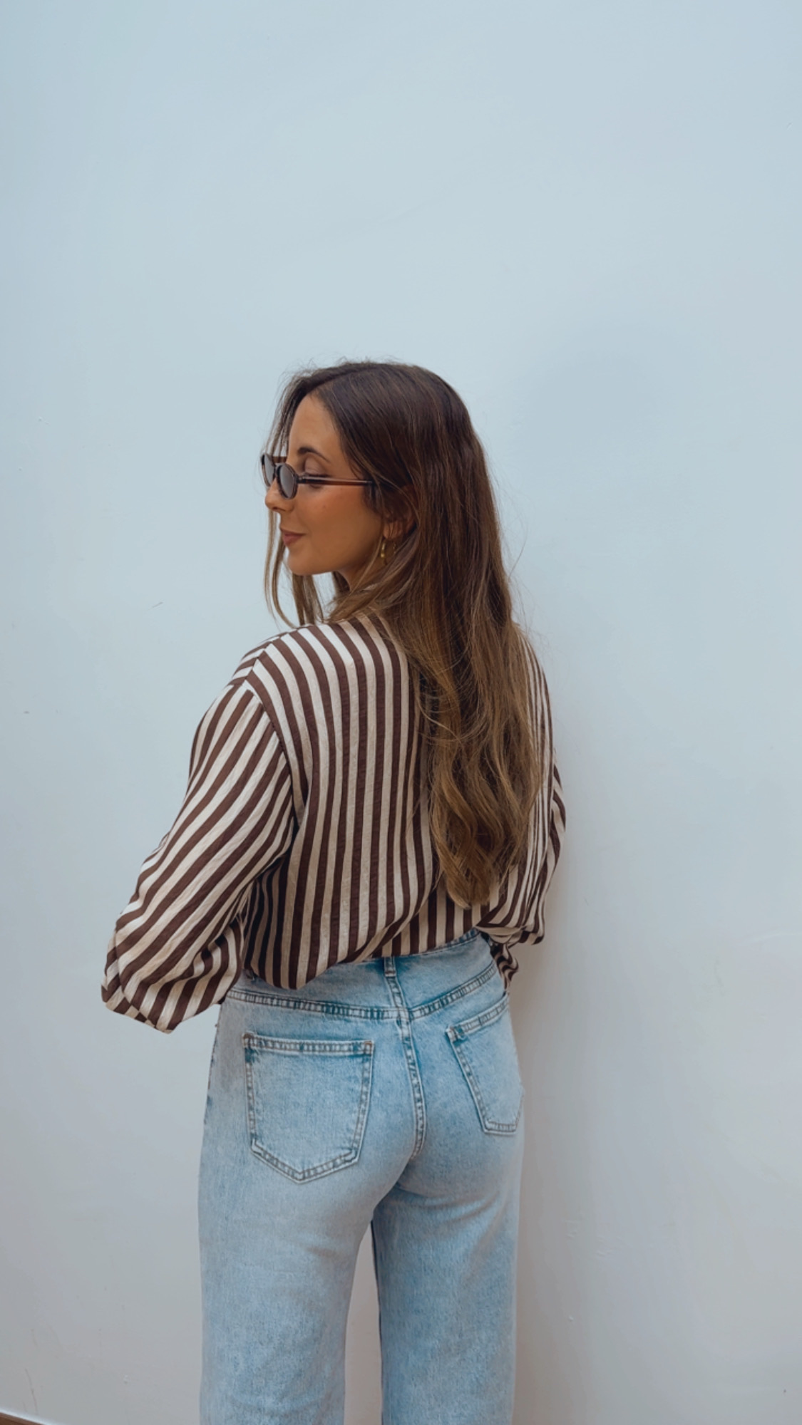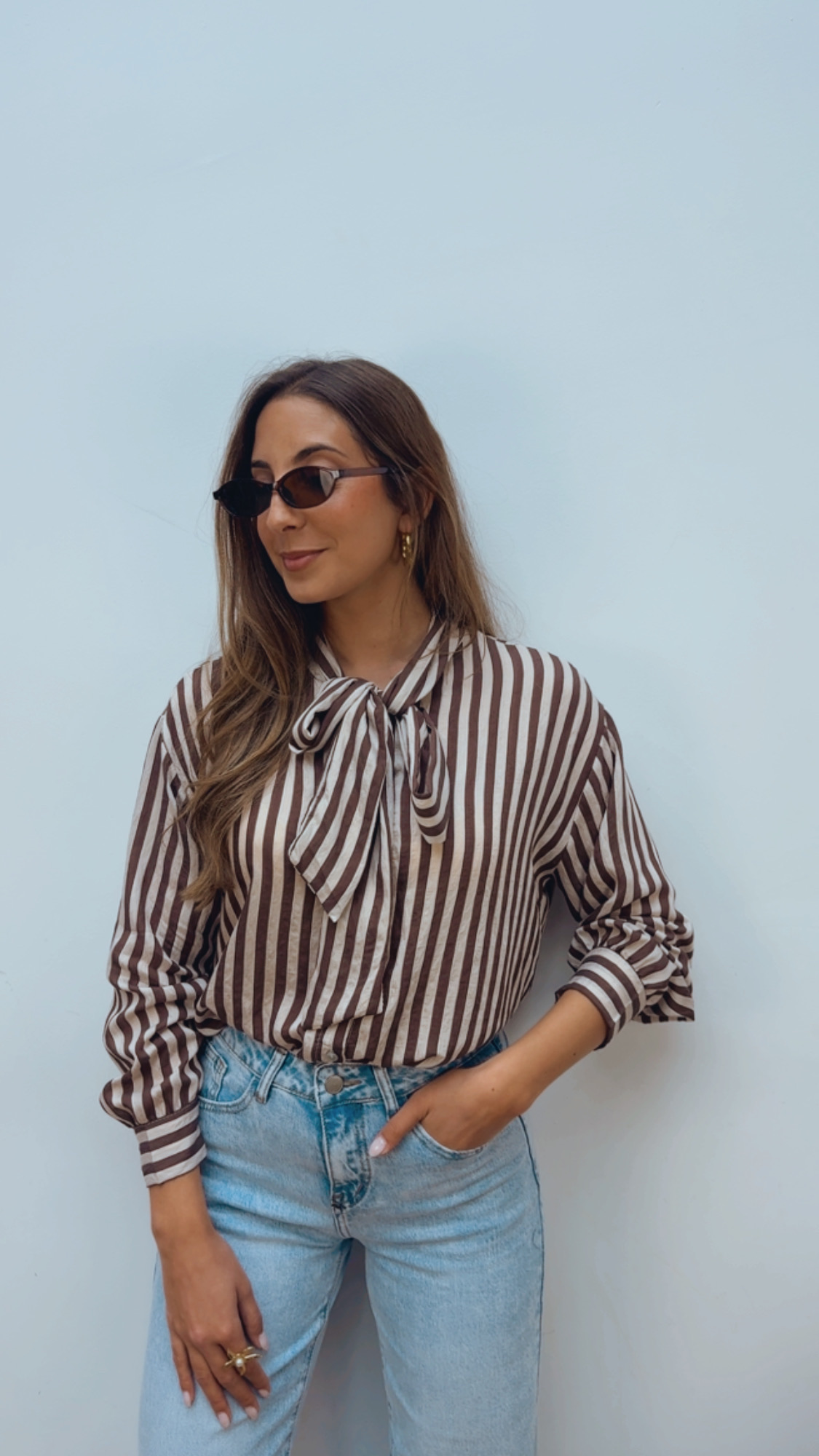 Sofisticada blusa de lazo en rayas marrón chocolate y color crudo, perfecta para aportar elegancia y calidez a tus looks. De manga larga y abotonada hasta abajo, permite llevarla cerrada o con un escote más relajado.