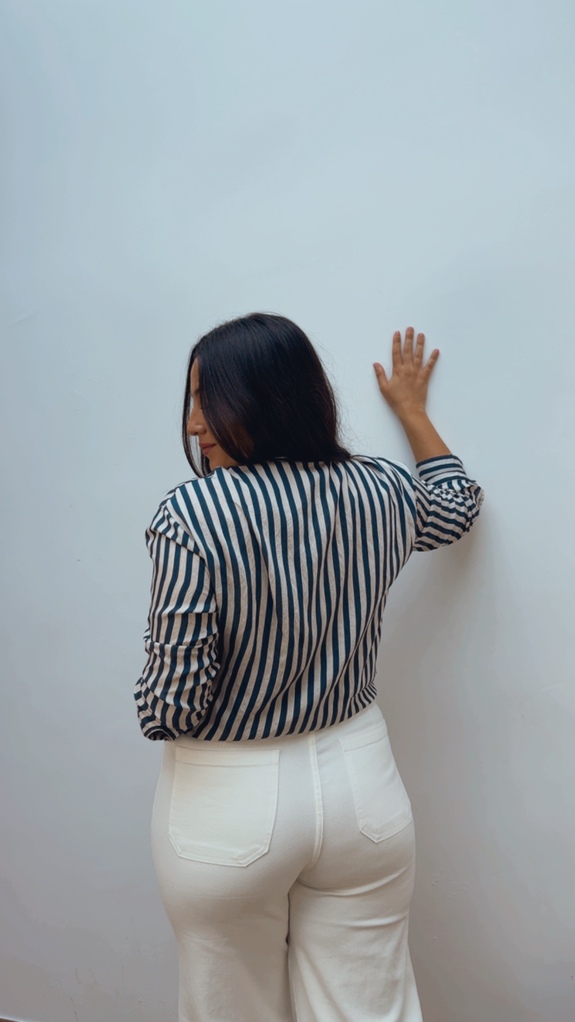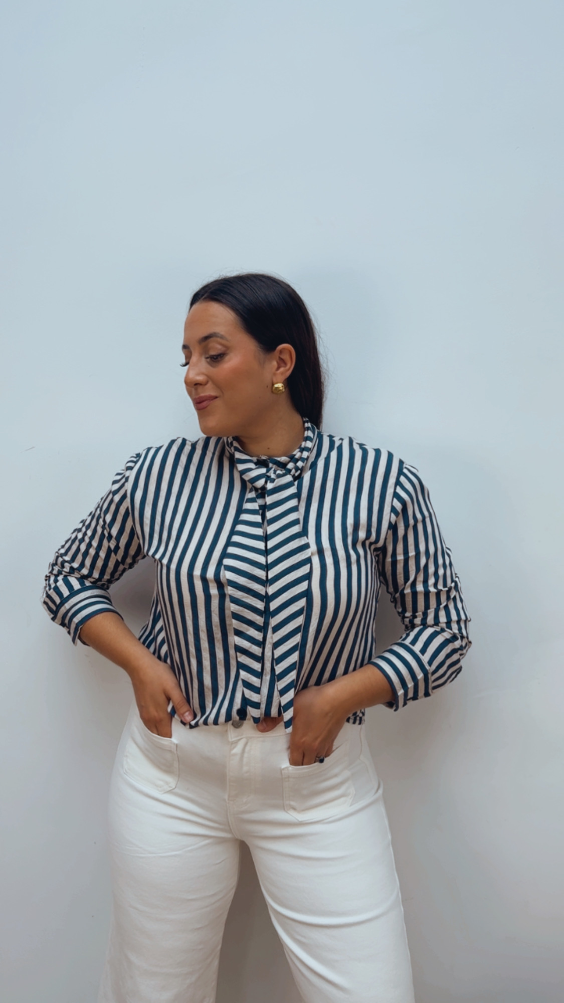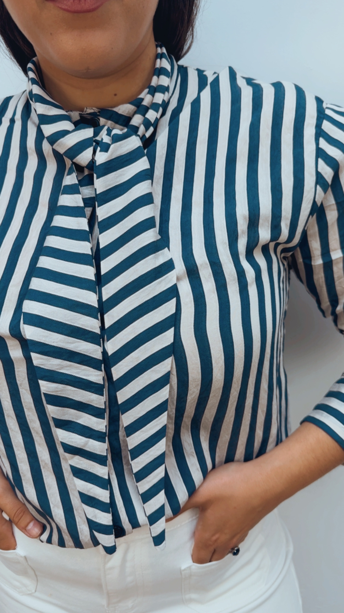 Elegante blusa de lazo en azul marino y color crudo, una prenda sofisticada y muy versátil. De manga larga y abotonada hasta abajo, permite llevarla cerrada o ligeramente abierta según el estilo que busques.