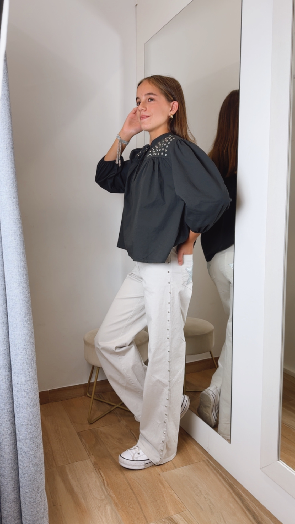 Blusa en color gris antracita con el detalle de las tachas en el pecho en color plateado y la lazada. Al final de la manga lleva goma, el largo de la manga no llega a ser larga hasta abajo.