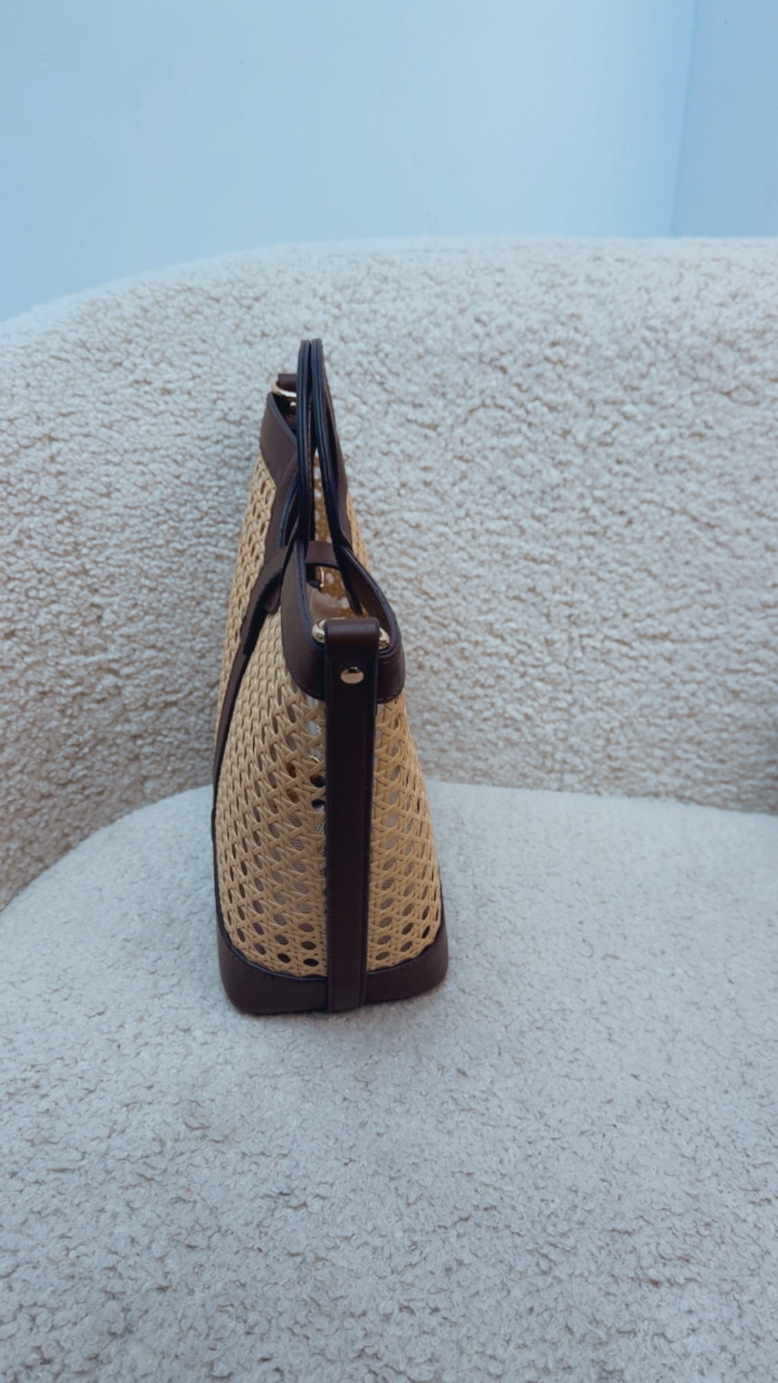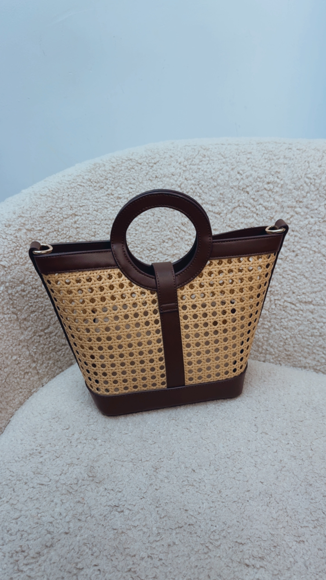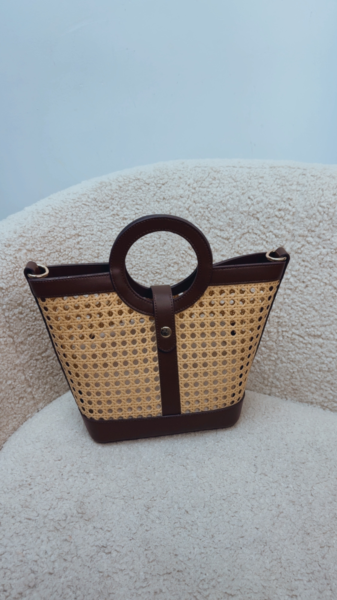 Bolso enrejillado en color chocolate , lleva botón para poder cerrar ,dentro un saquito para que todo vaya guardado en el interior y lleva la correa del mismo tejido en color chocolate para poder colgar o cruzar.