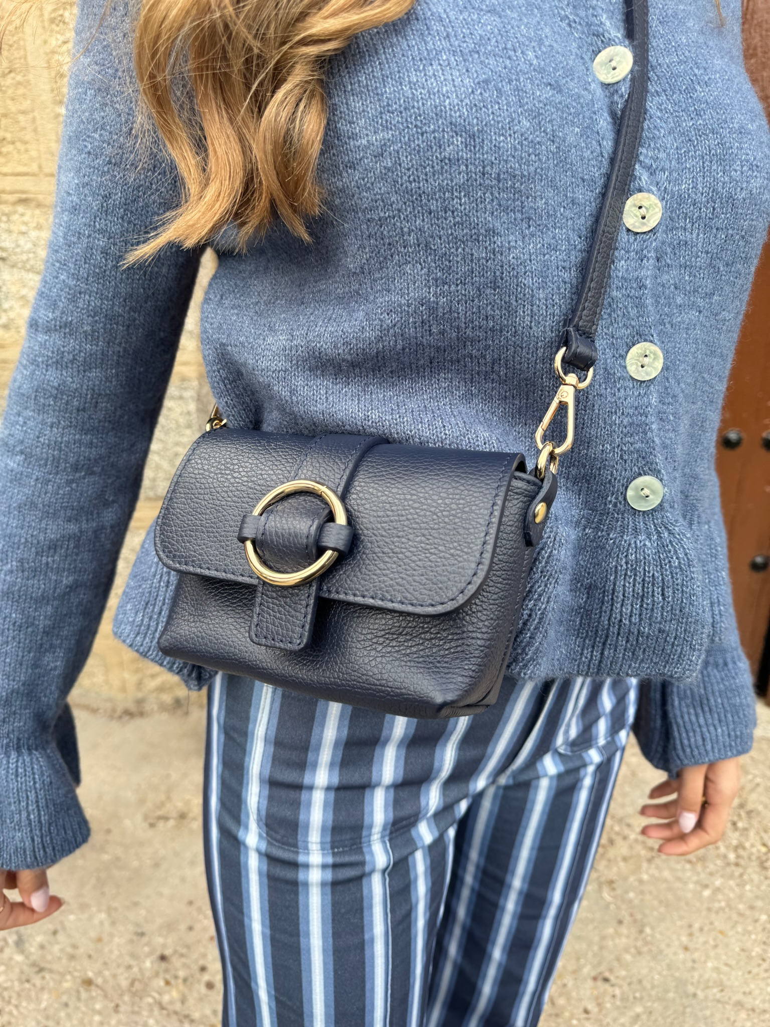 Bolso de piel en color marino lleva asa larga para cruzar también lo puede llevar en la mano, porque la asa larga se quita y se pone lleva el detalle del círculo dorado