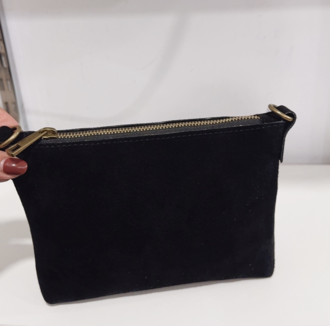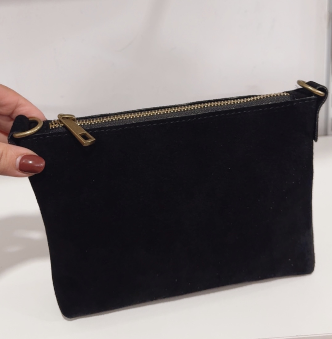 Bolso de piel ante en color negro, lleva cremallera y lleva asa corta y larga para poder cruzar del mismo material. La cremallera es en color dorado .