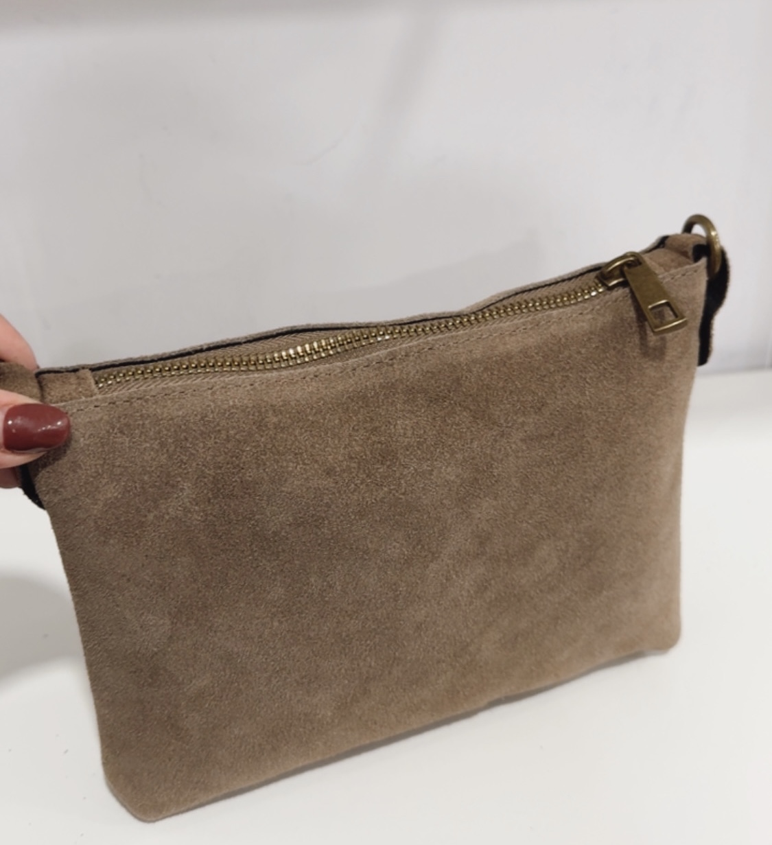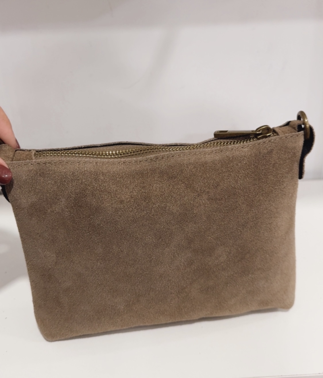 Bolso de piel ante en color topo , lleva cremallera y lleva asa corta y larga para poder cruzar del mismo material. La cremallera es en color dorado .