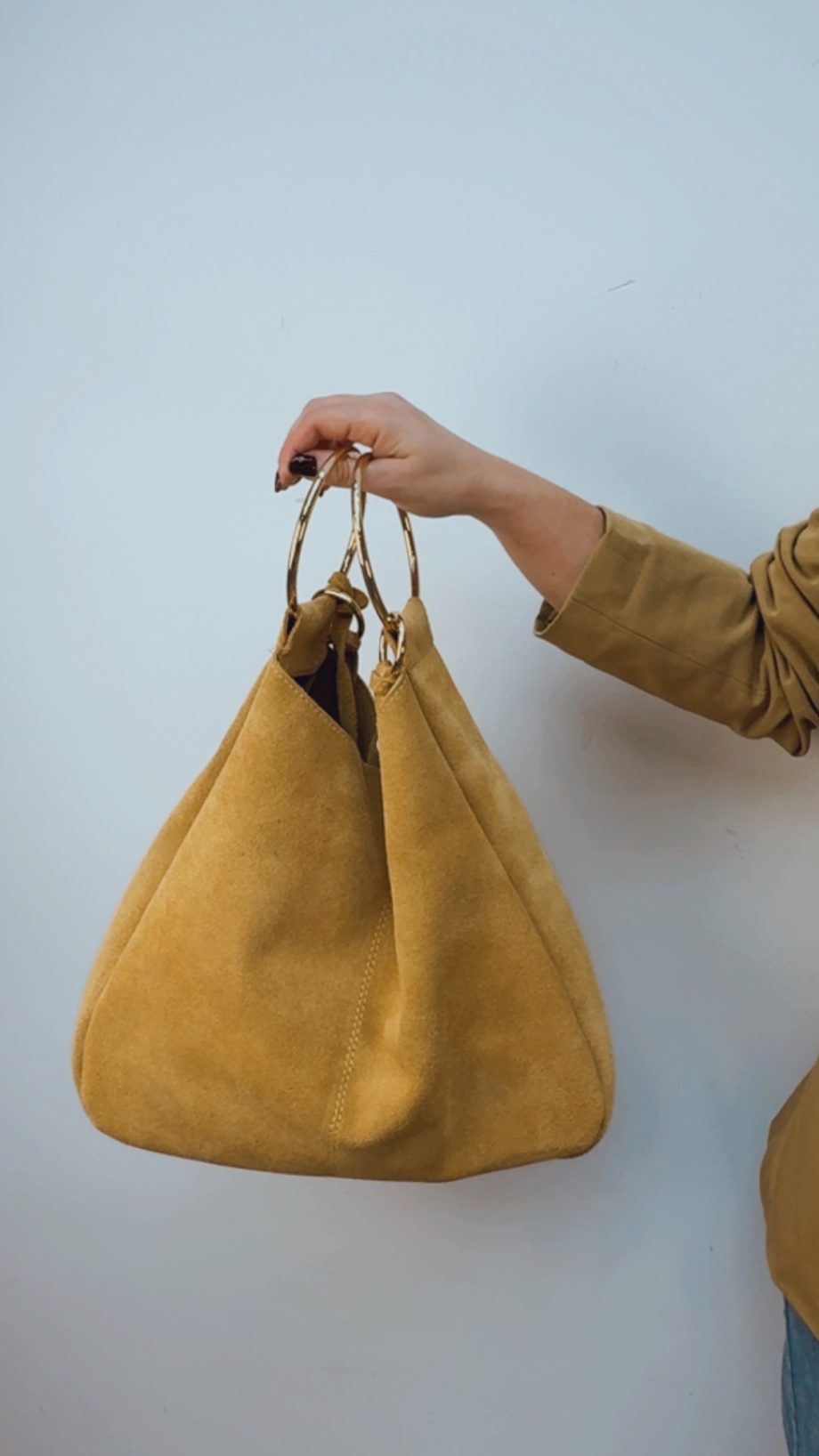Lleva un asa larga y un monedero interior. Las asas de mano son doradas.