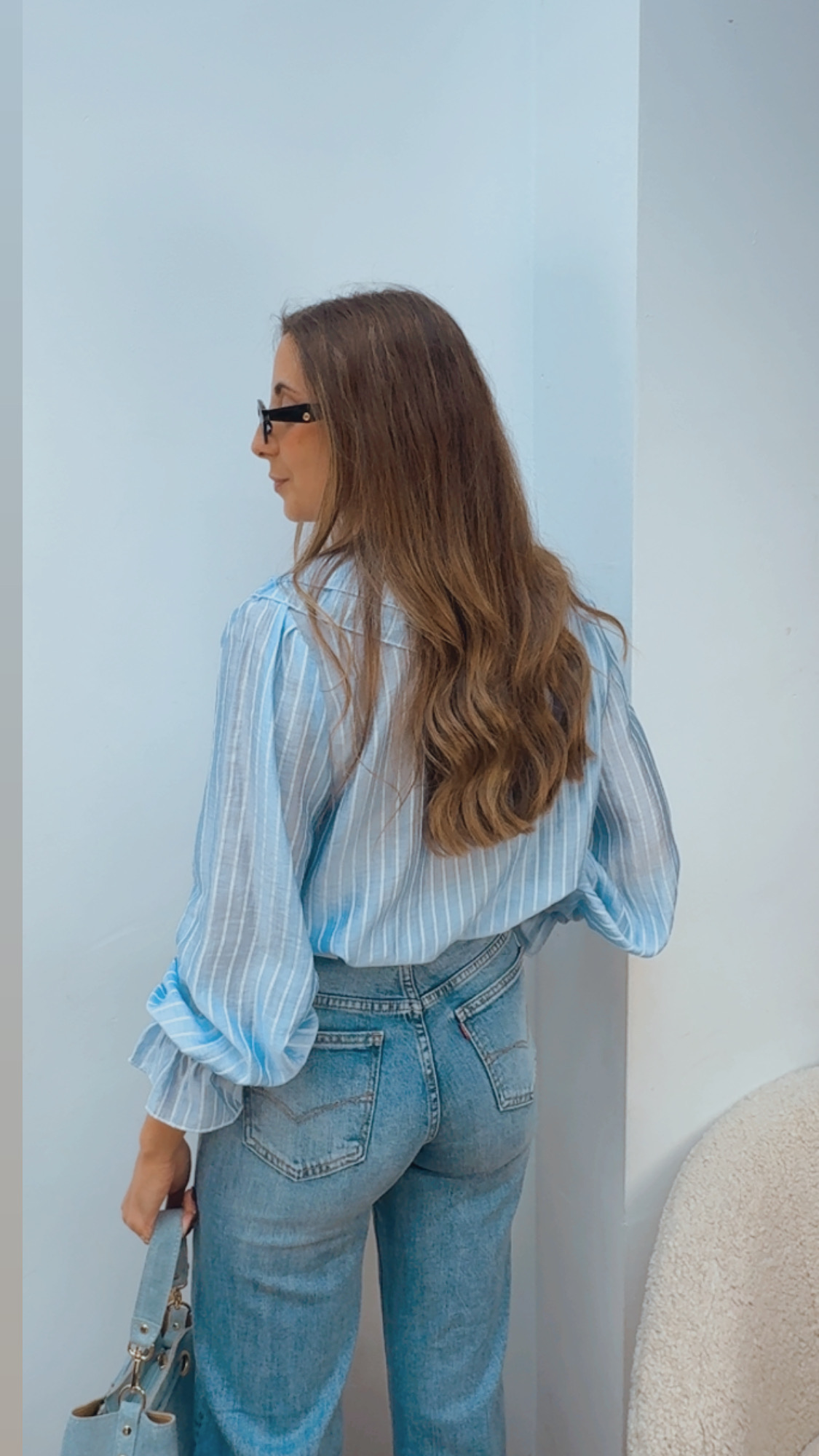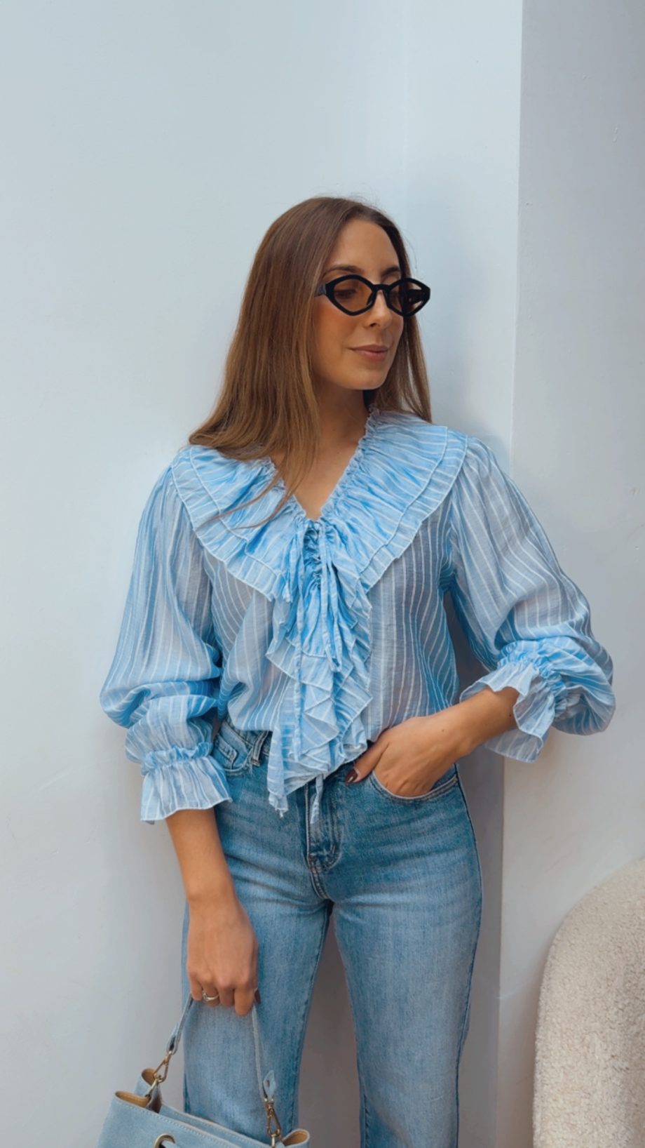 Camisa de manga larga, semi transparente, en color azul cielo lleva una raya muy finita en color blanco. La parte del pecho de delante va cerrada y lleva una lazada al final del pico.