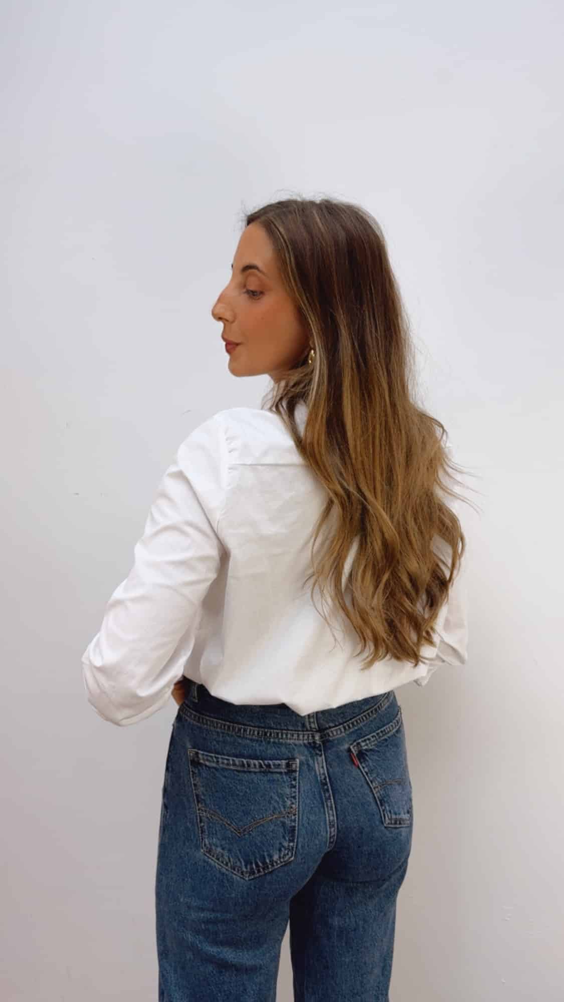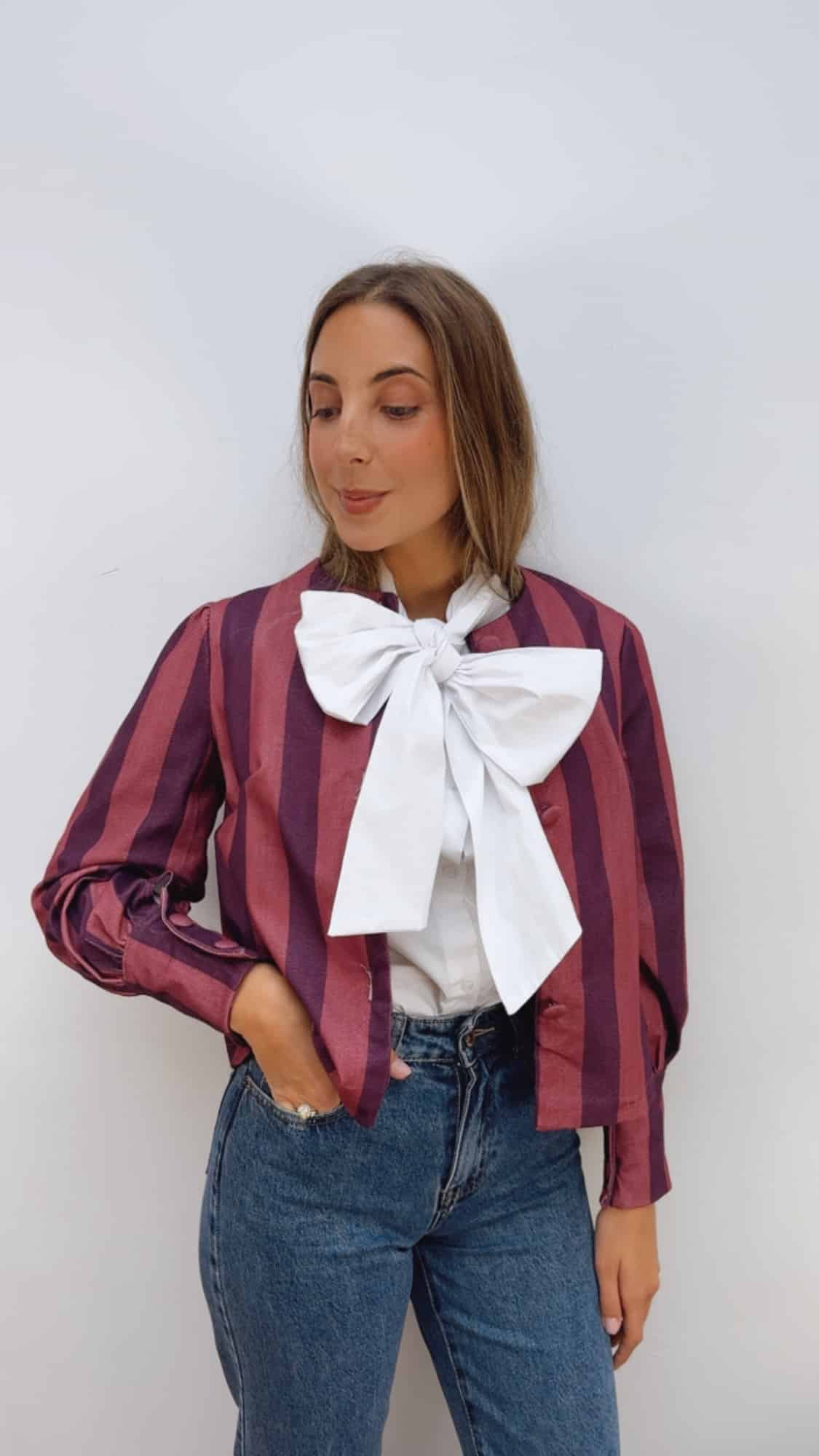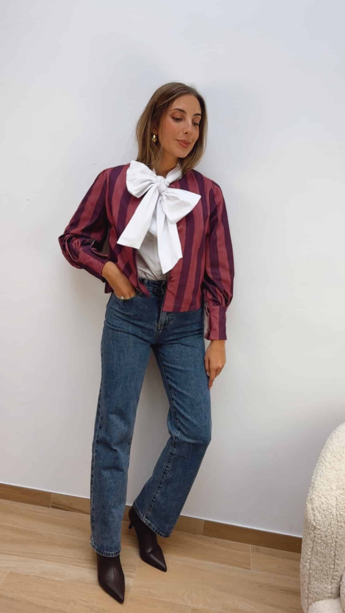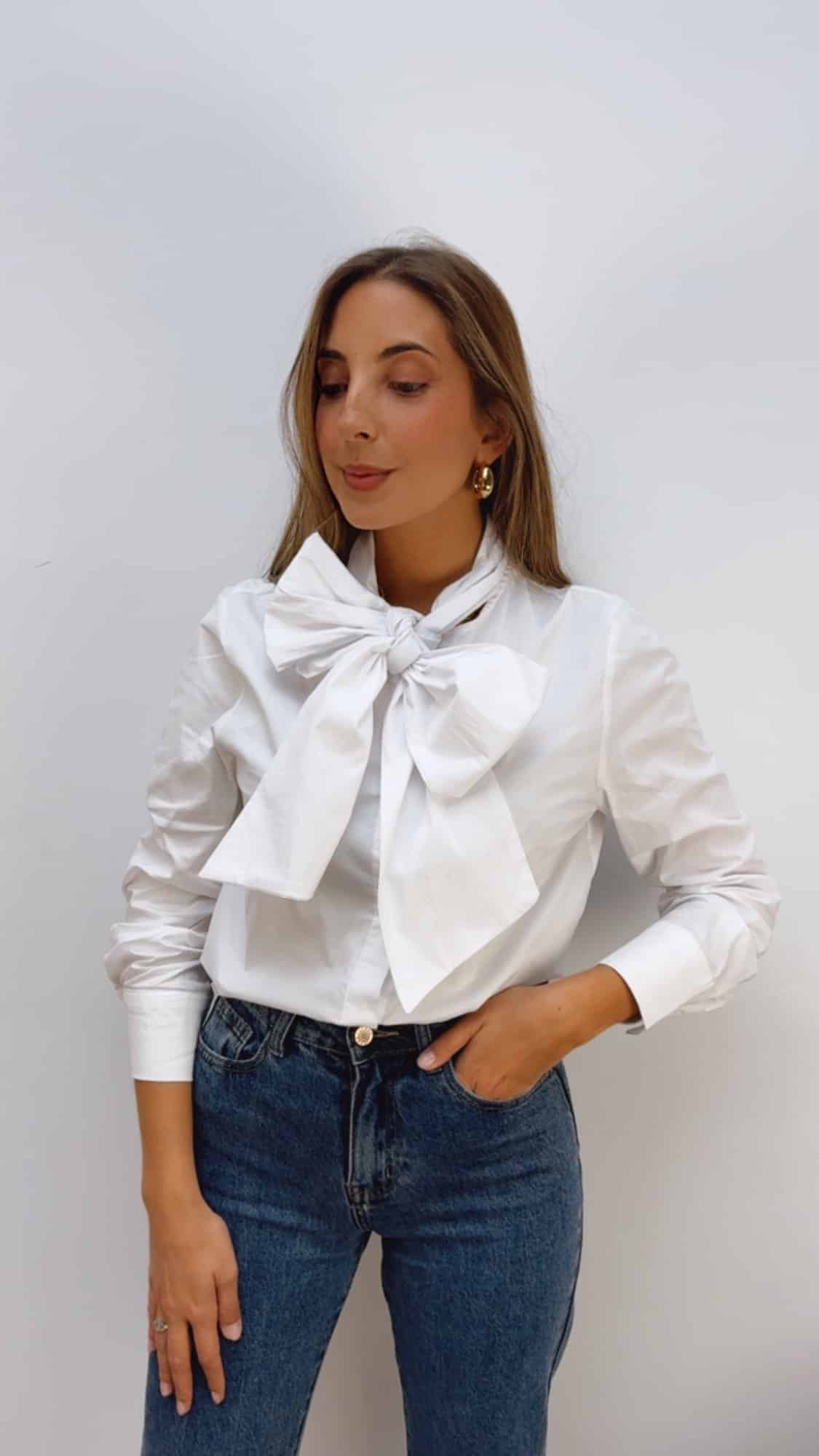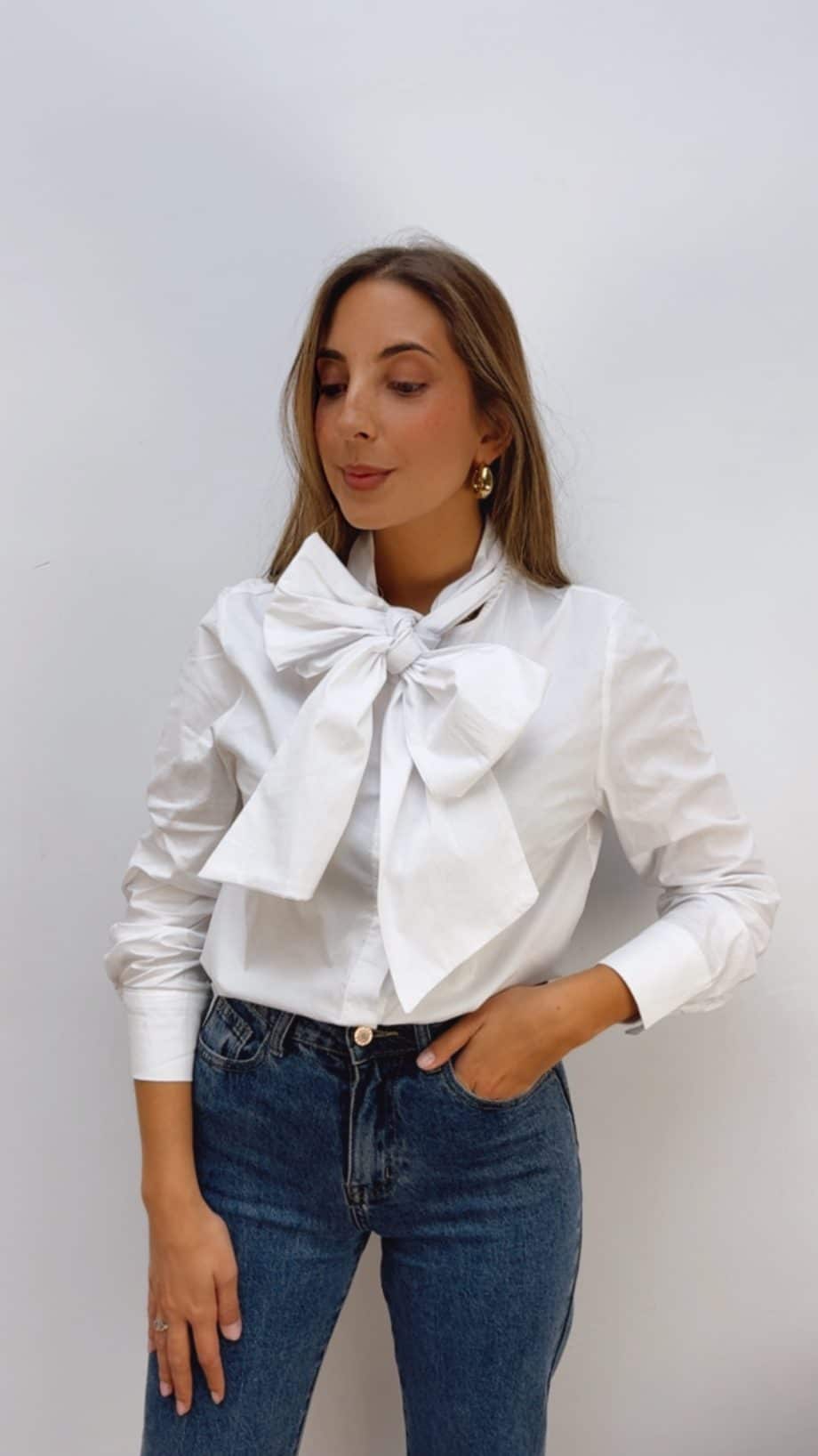 Camisa abotonada hasta abajo con cuello redondo y detalle de lazada incorporada.