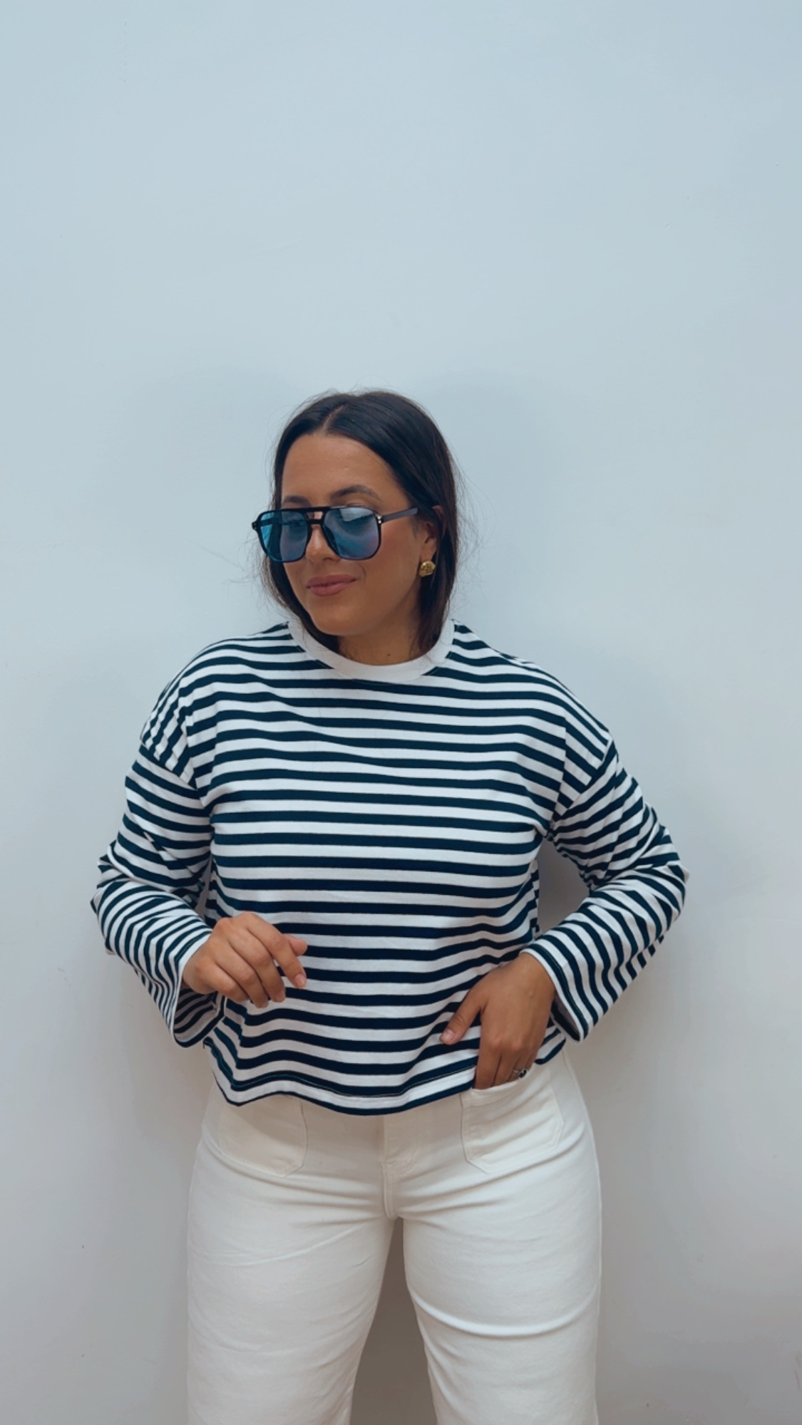 Camiseta de cuello redondo y manga larga, confeccionada en un tejido de alta calidad y tacto súper suave. Su diseño de rayas azul marino y blancas la convierte en un básico atemporal, perfecto para cualquier temporada.