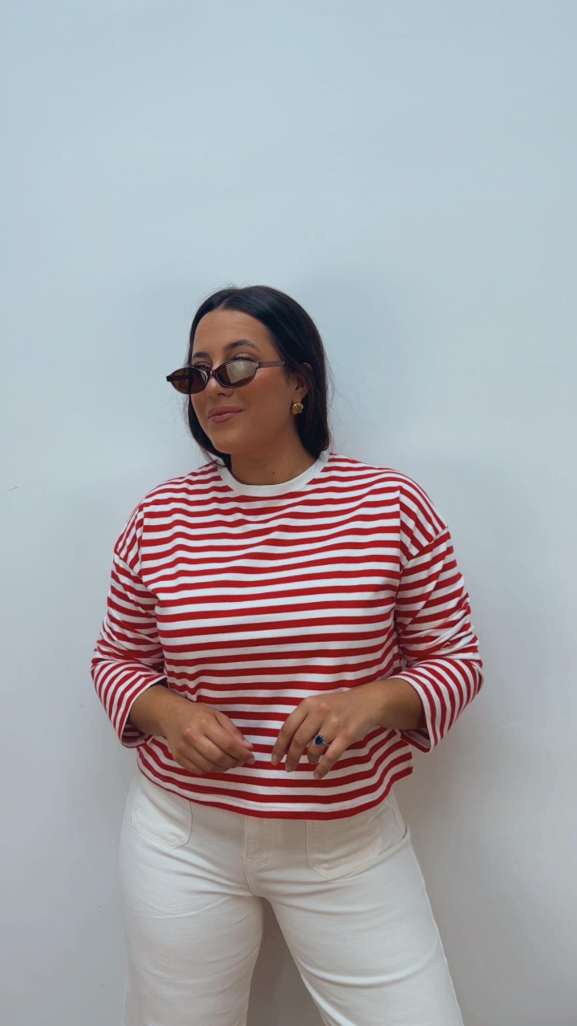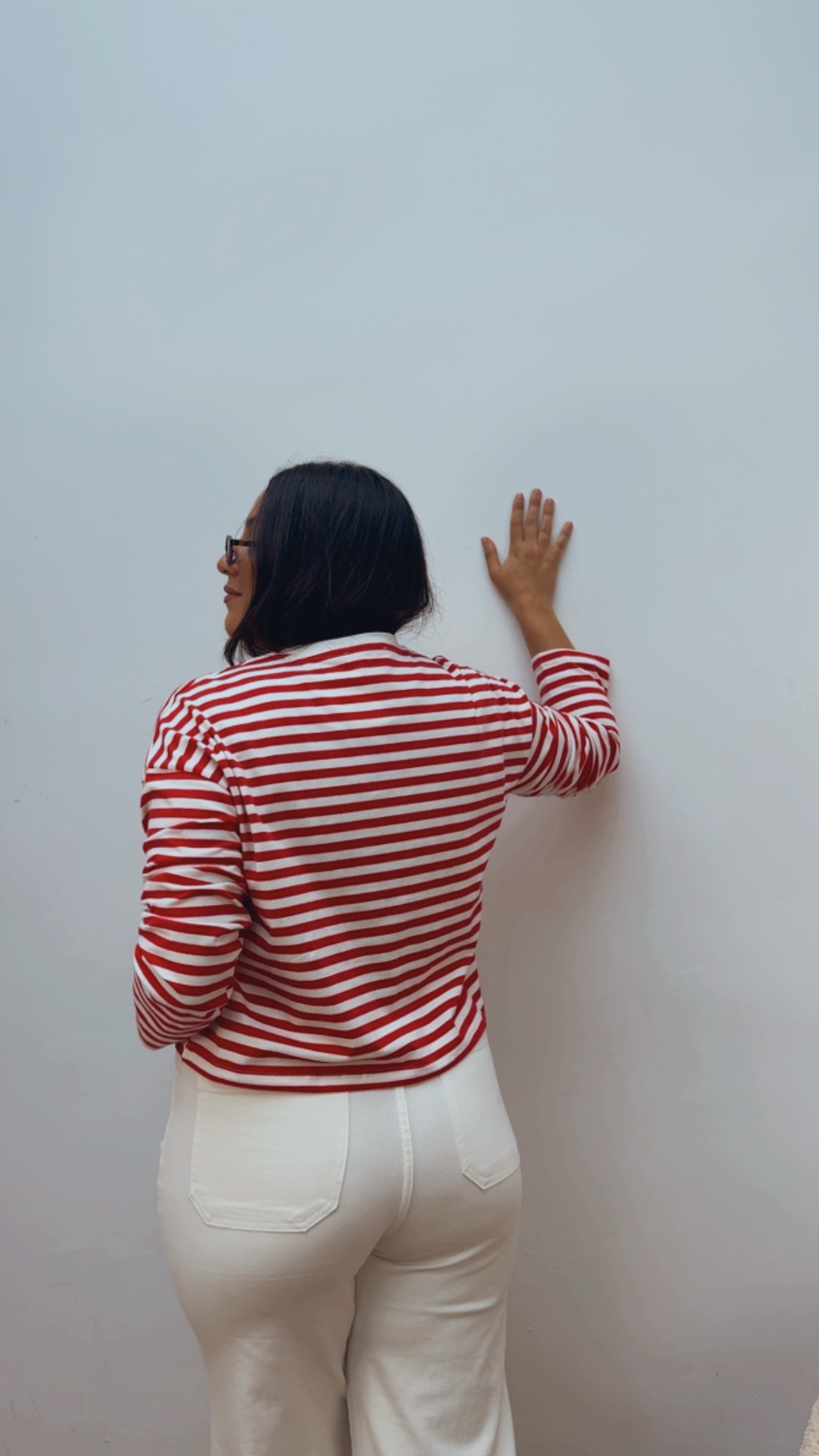 Camiseta de cuello redondo y manga larga, confeccionada en un tejido de alta calidad y tacto súper suave. Su diseño de rayas rojas y blancas la convierte en un básico atemporal, perfecto para cualquier temporada.