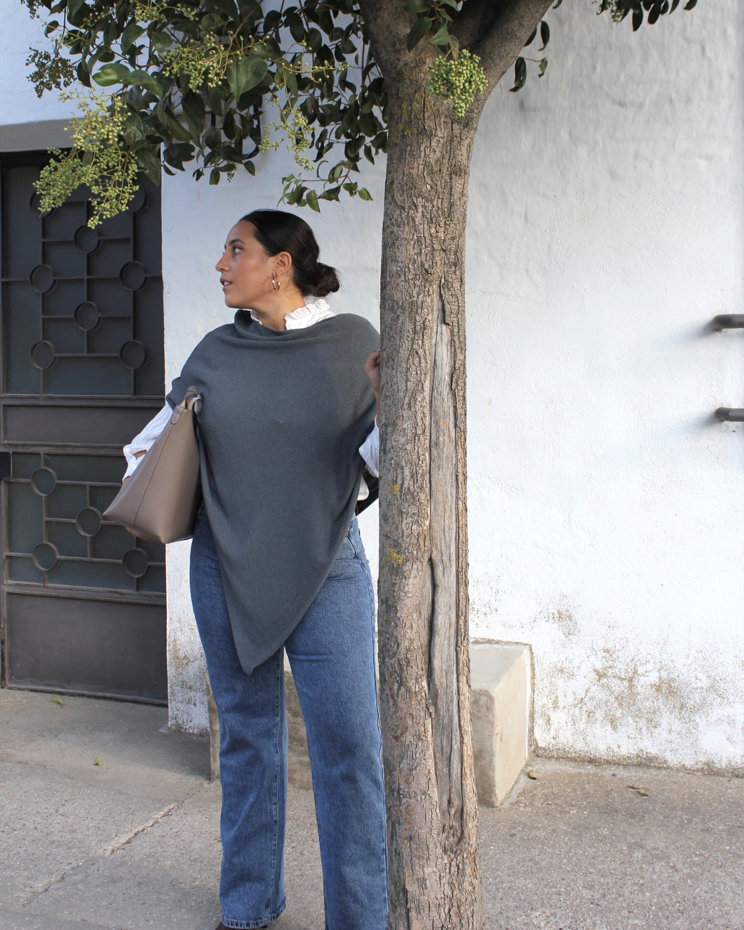 capa a pico por delante y por detrás en color gris es de punto tiene un punto tipo perlé que no hace bolas .