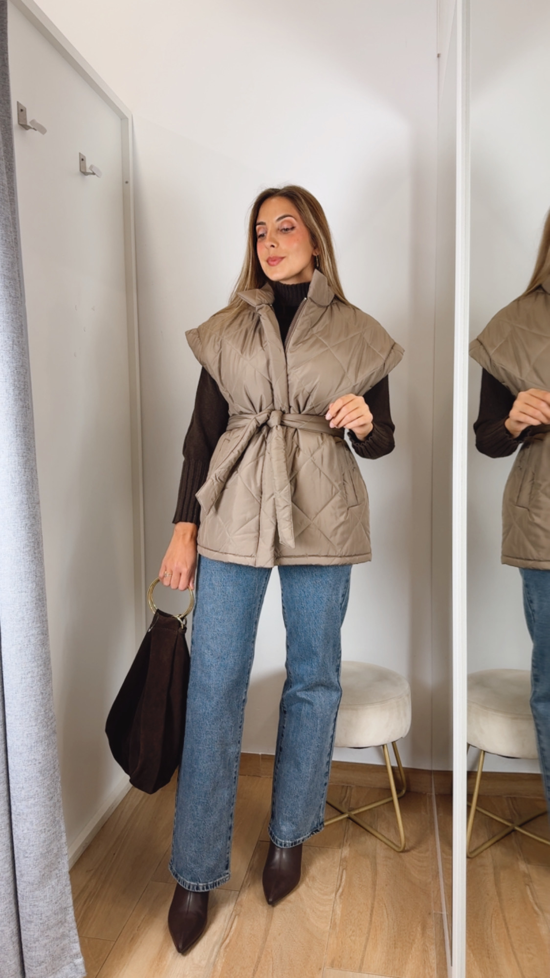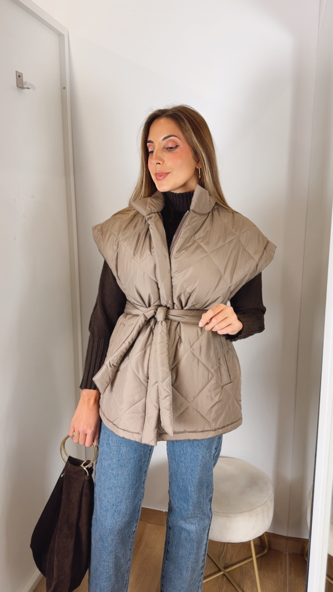 Chaleco color topo acolchado. Lleva cremallera para cerrar y bolsillos verdaderos. El cinturón del mismo tejido que el chaleco.