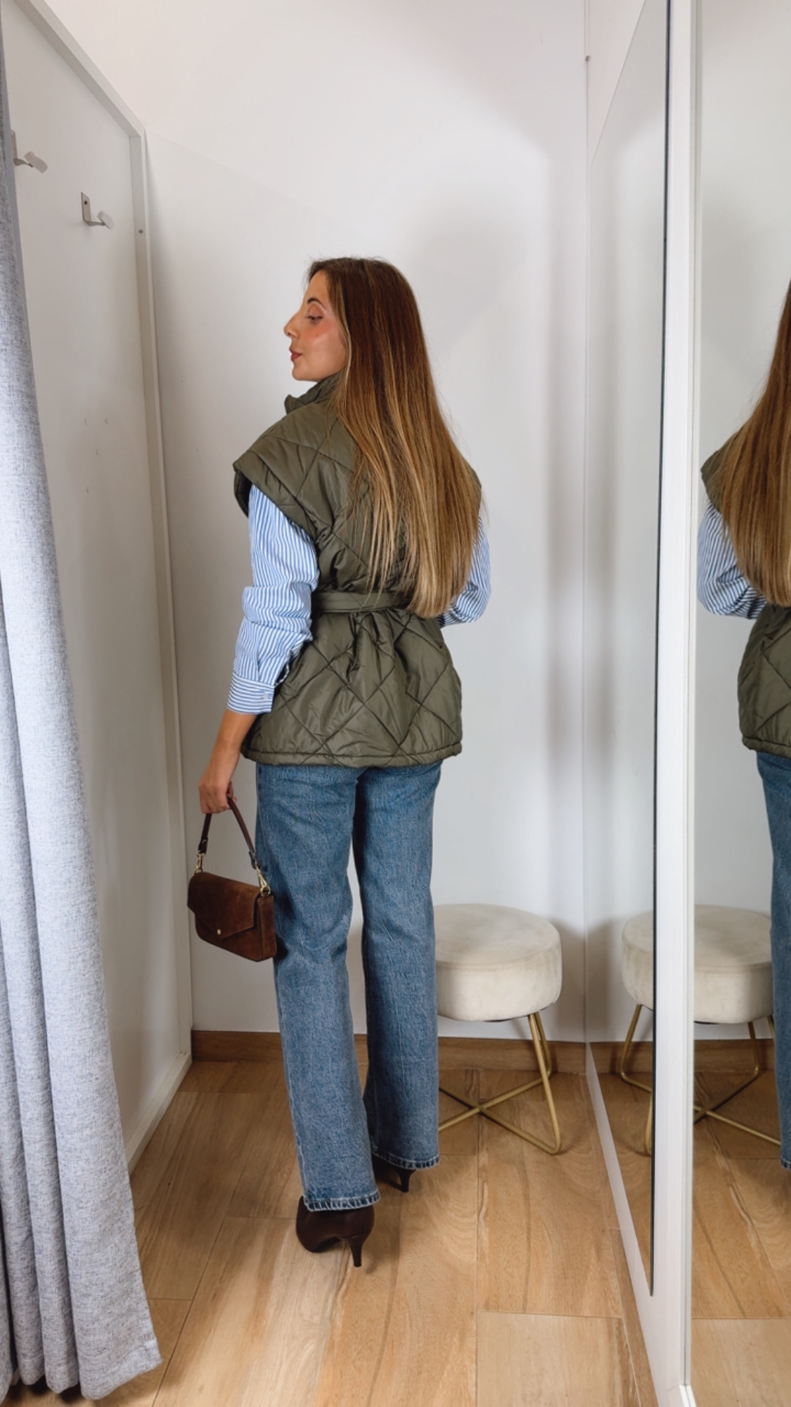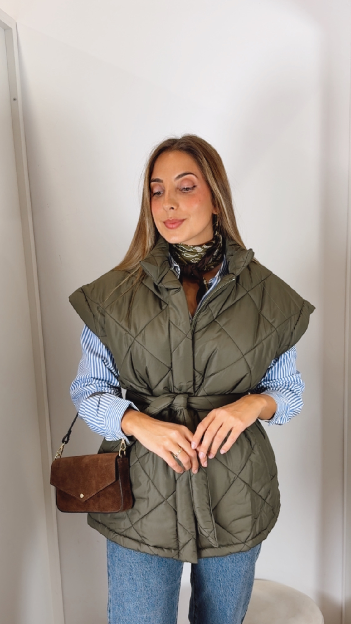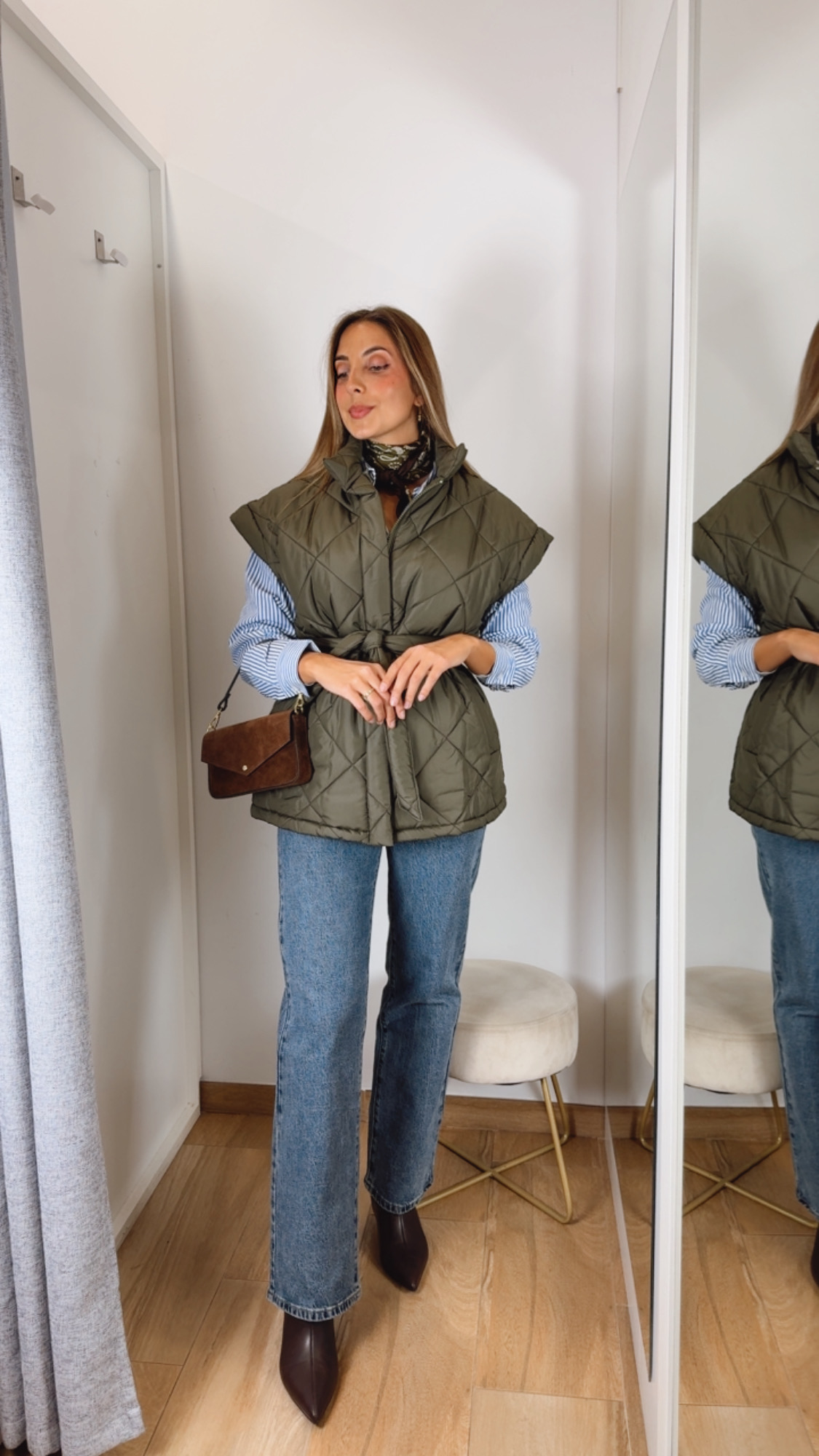 Chaleco verde acolchado , lleva cremallera para cerrar bolsillos verdaderos y el cinturón del mismo tejido que el chaleco.Totalmente forrado .