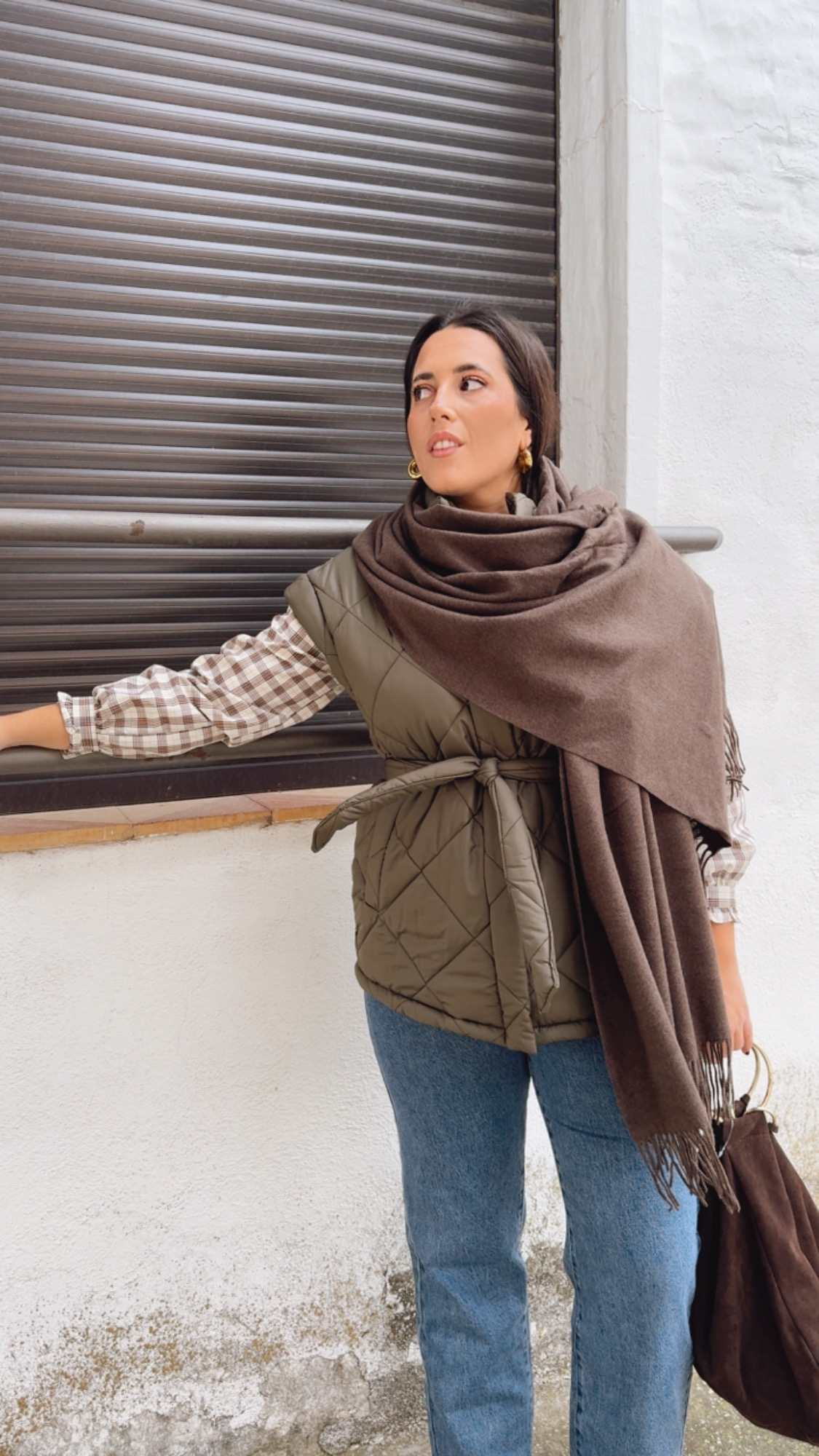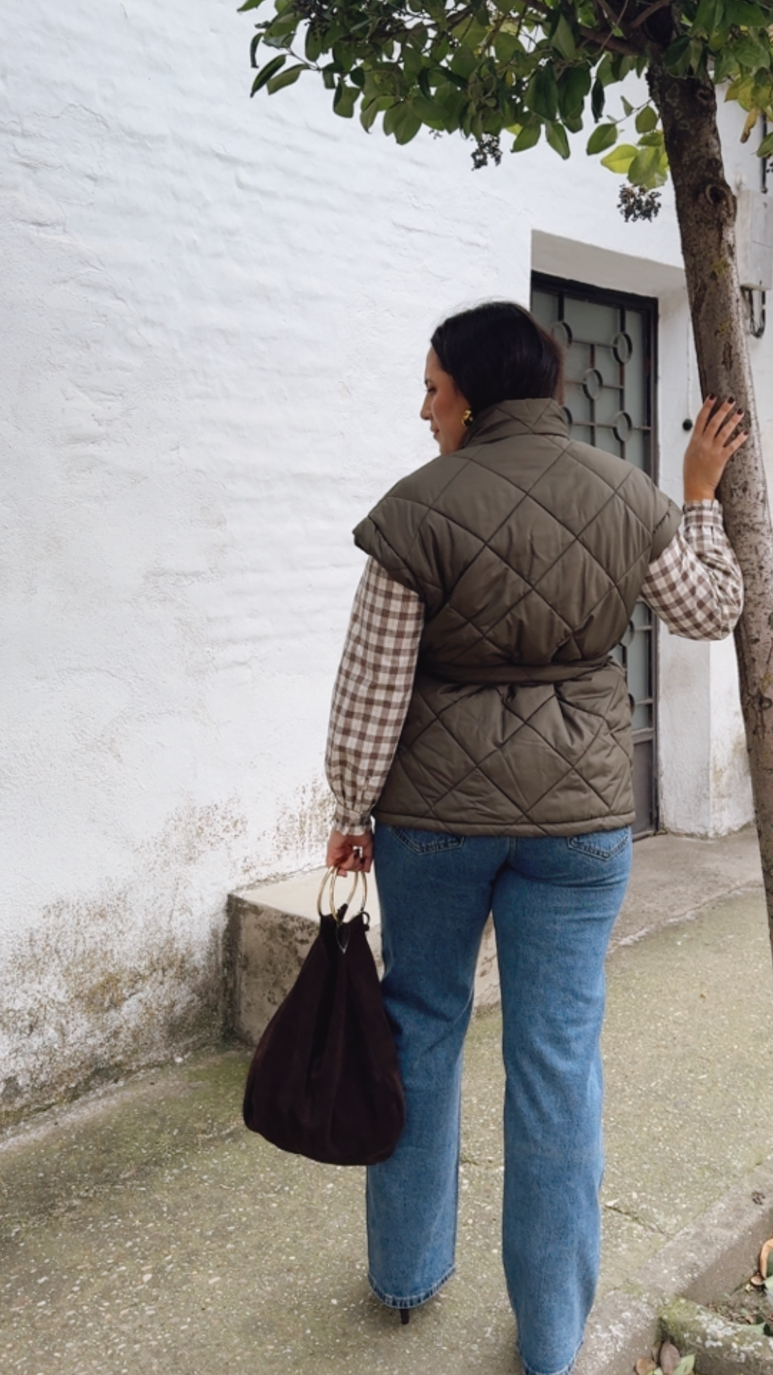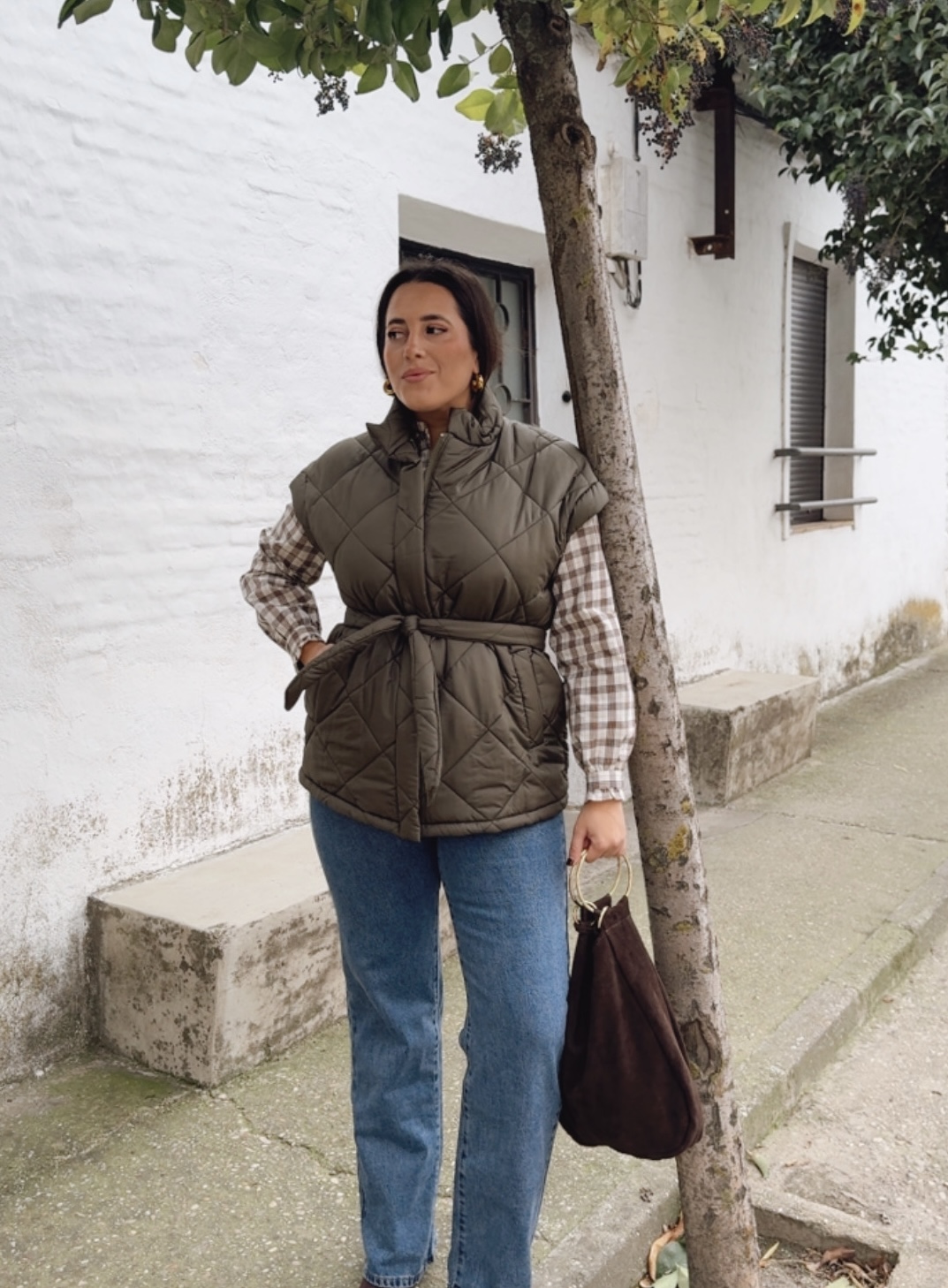 Chaleco verde acolchado , lleva cremallera para cerrar bolsillos verdaderos y el cinturón del mismo tejido que el chaleco.Totalmente forrado .