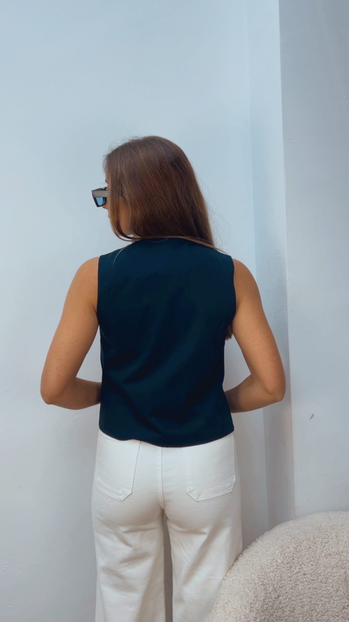 Chaleco sastre en color azul marino, totalmente forrado. Se abrocha con botones.