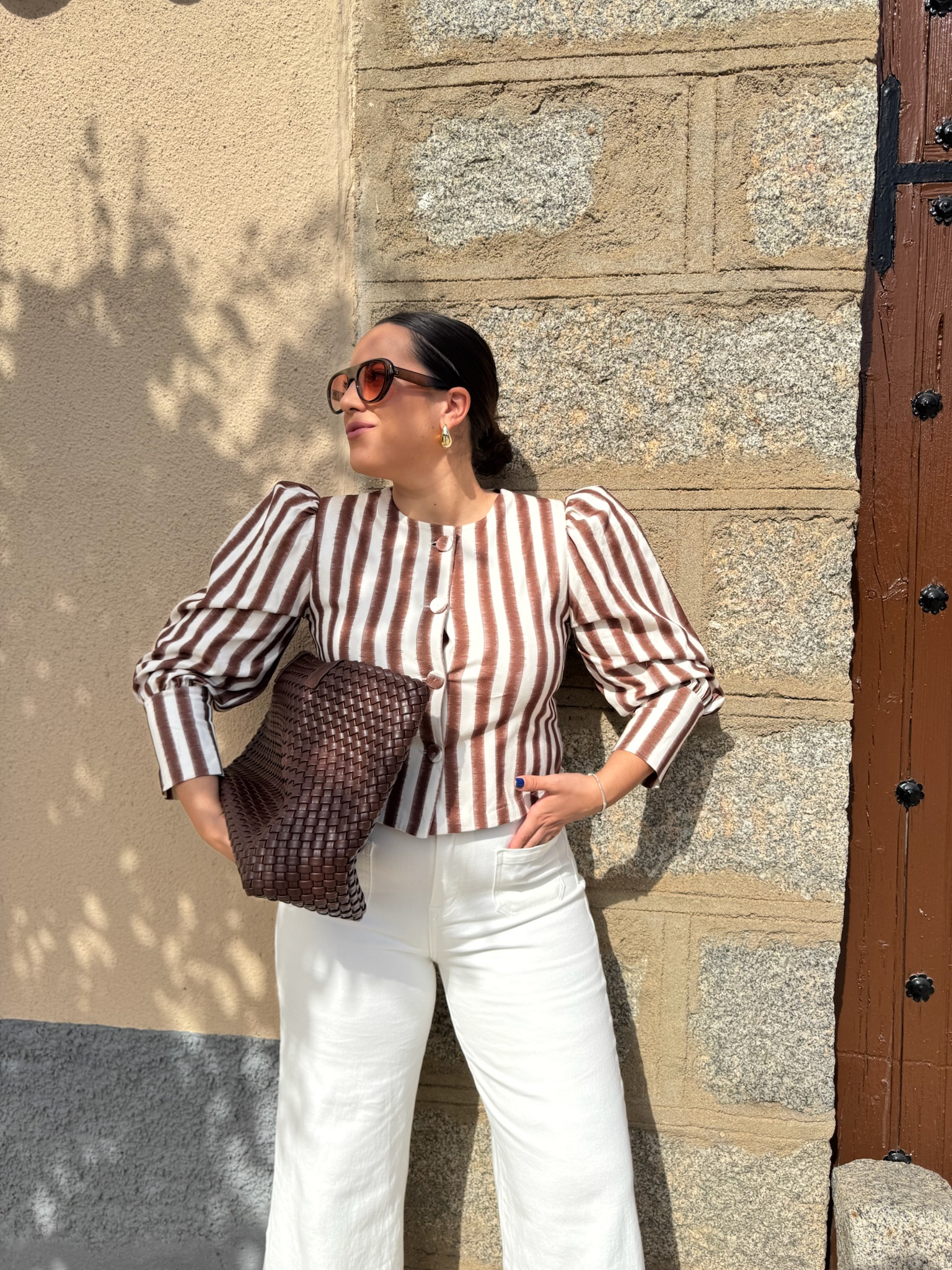 Preciosa chaqueta marrón chocolate de cuello redondo, abotonada hasta abajo y con manga ligeramente abullonada con detalle en el puño, que le aporta un toque especial y femenino.