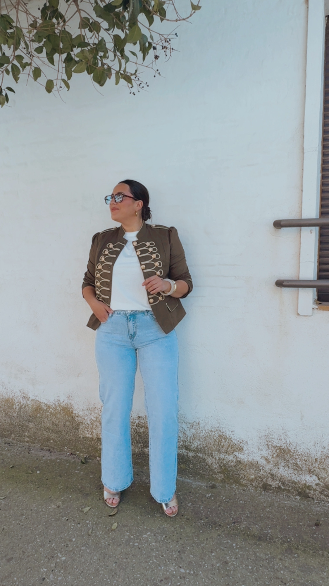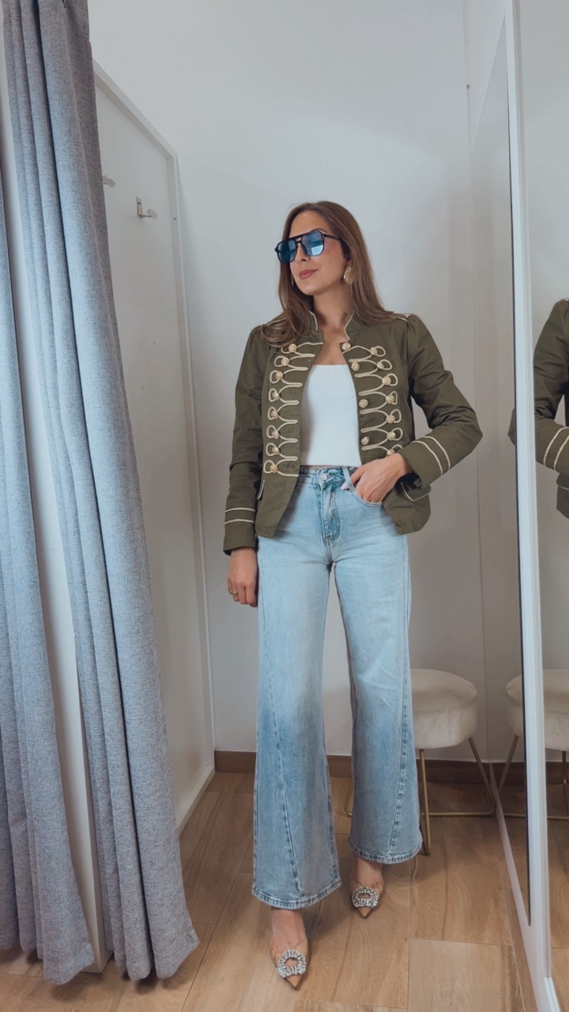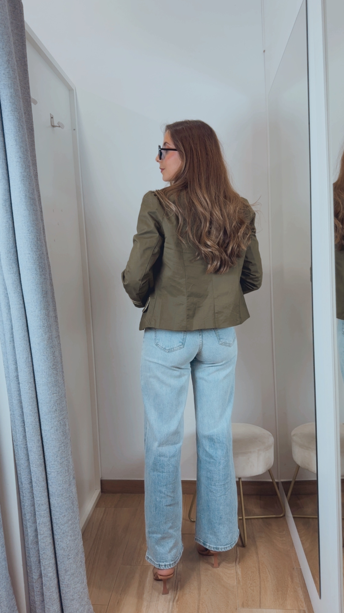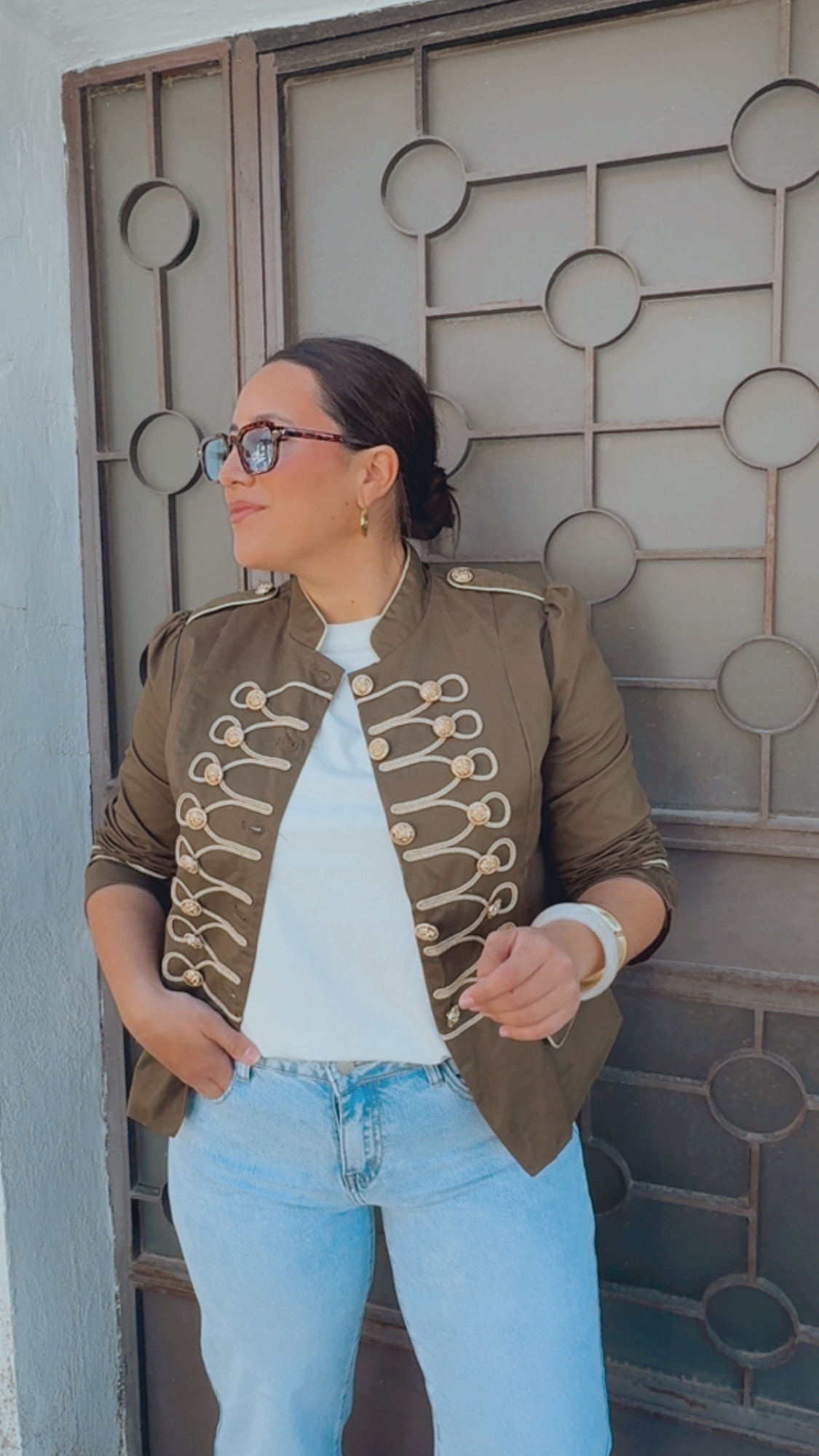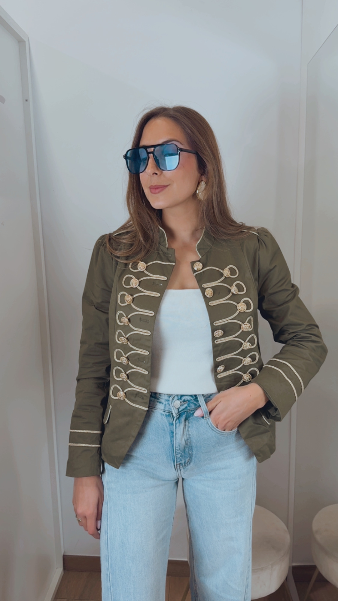 Chaqueta en color khaki. Con los detalles en dorado e ínterior totalmente forrada.