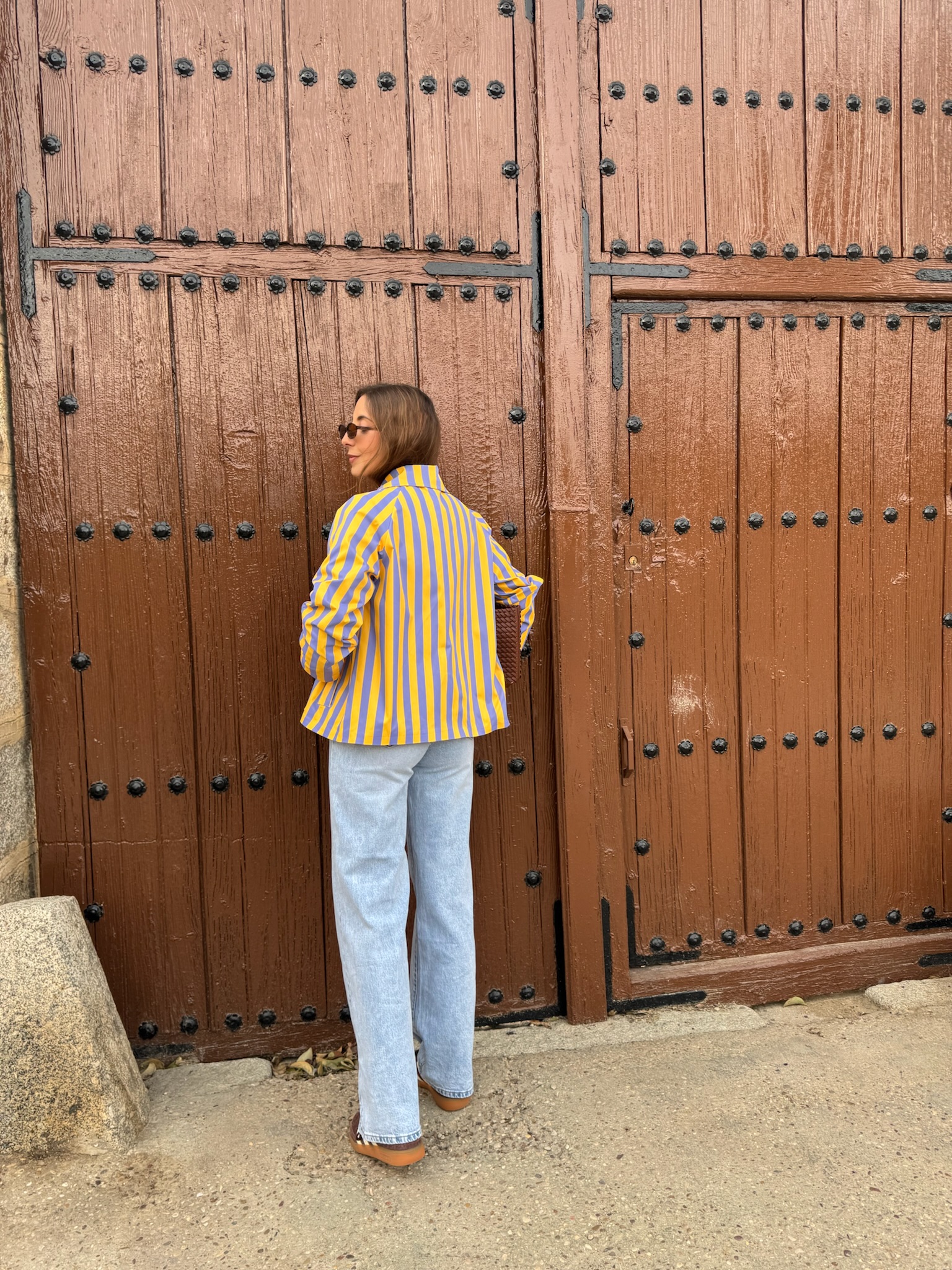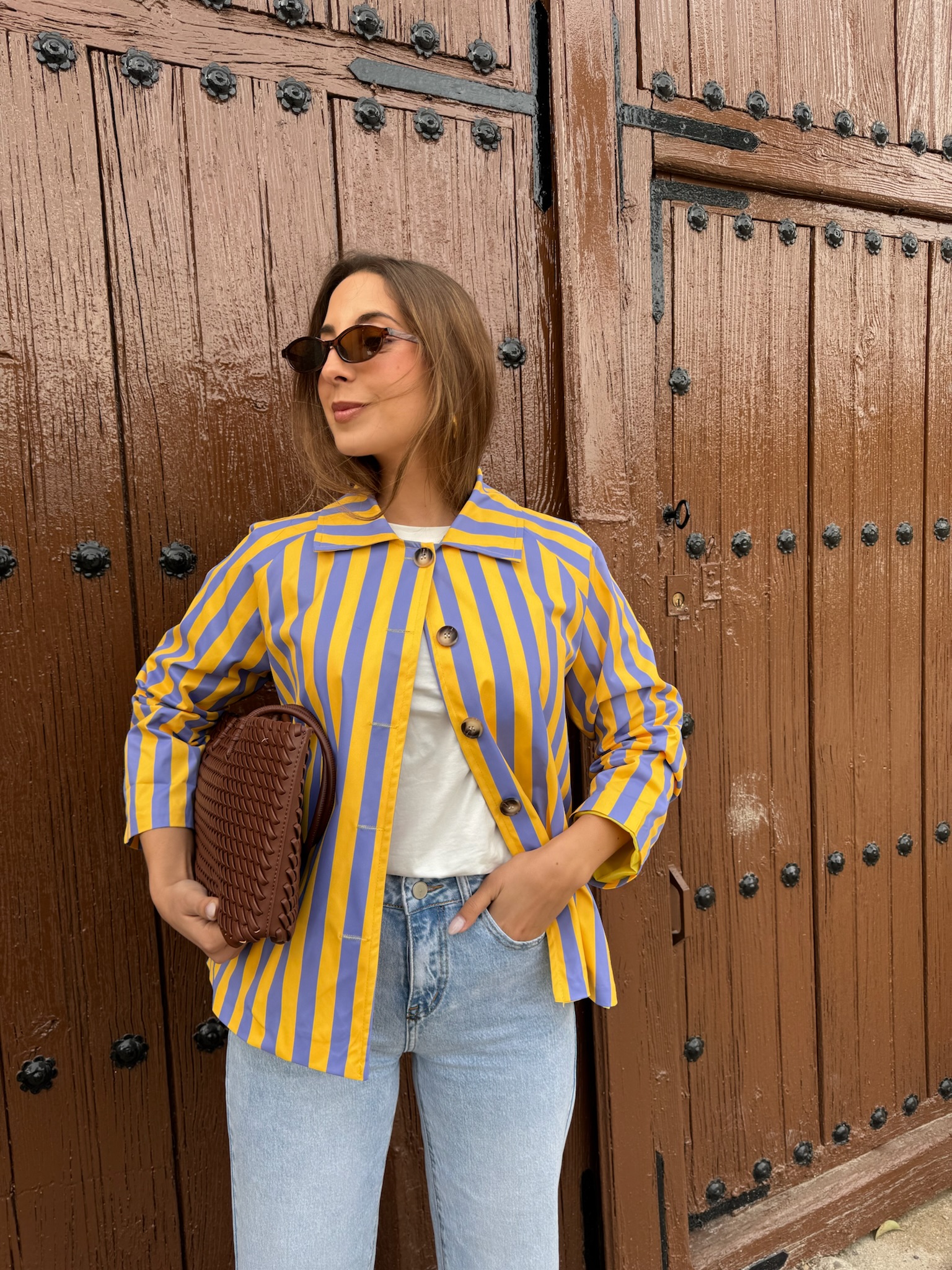 Chaqueta de rayas, en tono amarillo y morado. Es un espectáculo de Chaqueta, imprescindible en nuestro armario esa temporada abotonada hasta abajo interior, totalmente forrada lleva bolsillos y manga rangla.