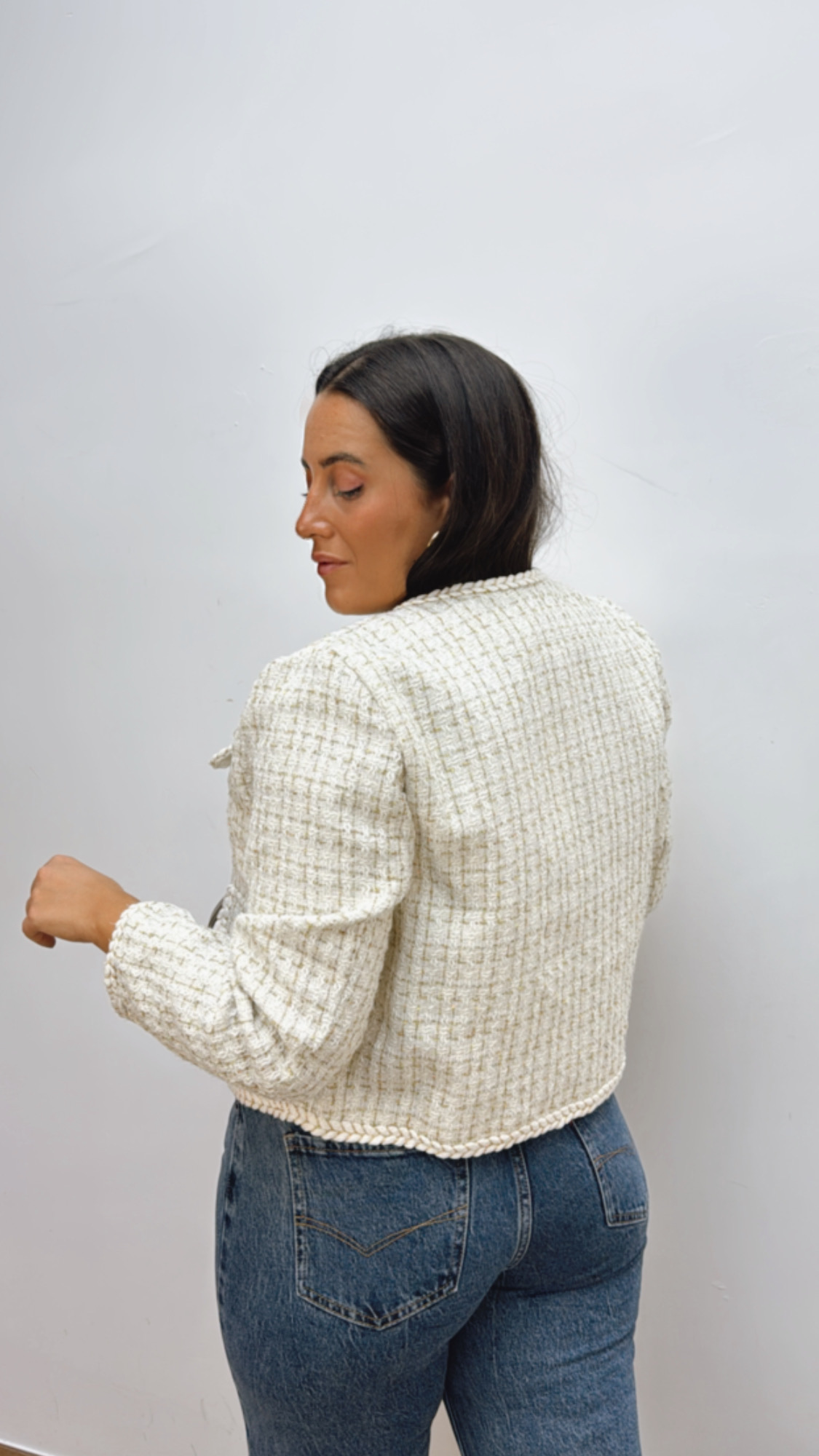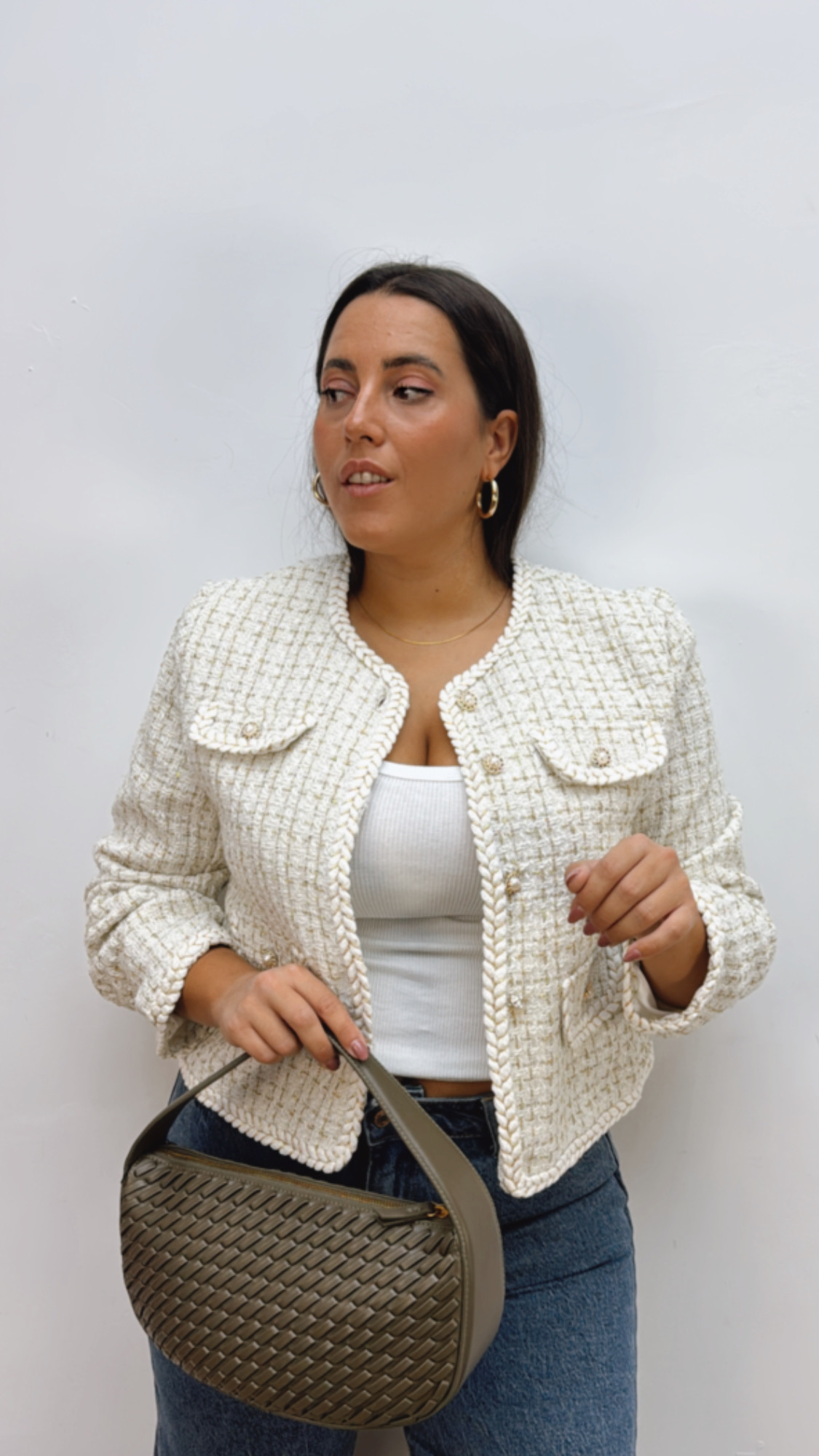 Chaqueta tejido tweet en color crudo con detalles en tono más claros y hilo dorado. Con cuello redondo, bolsillos en el pecho y falsos en la cadera, y forro interior para mayor comodidad. Es un básico imprescindible para esta temporada.