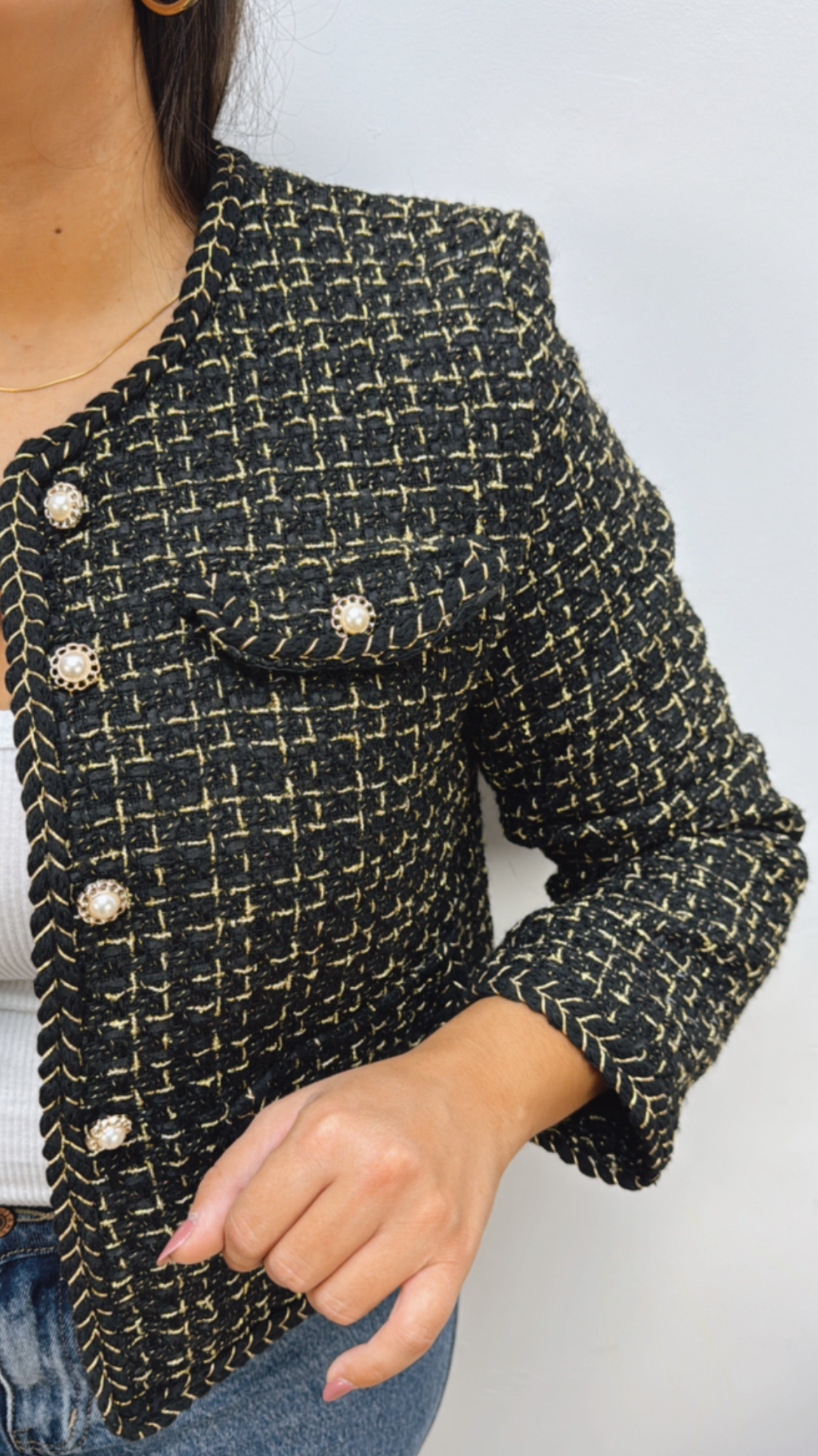 Chaqueta tejido tweet en color negro con detalles en negro y hilo dorado. Con cuello redondo, bolsillos en el pecho y falsos en la cadera, y forro interior para mayor comodidad. Es un básico imprescindible para esta temporada.