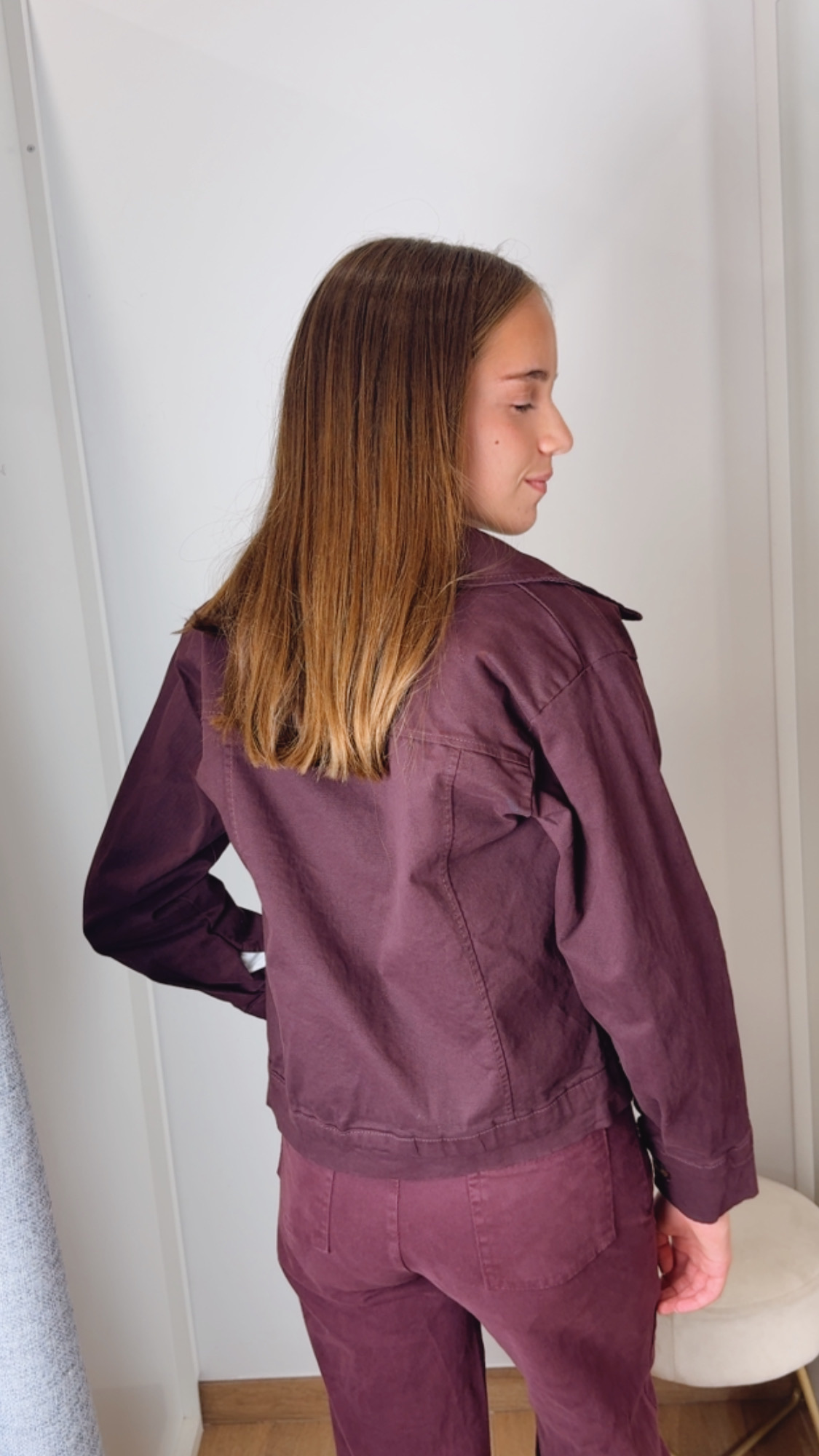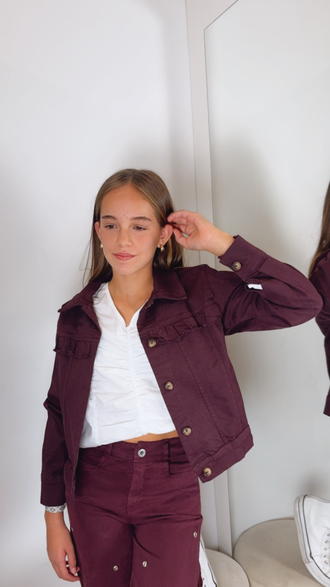 Chaqueta en tejido similar al Denim en color burdeos con detalle de volante en la parte del pecho. Los botones se abrochan y también lleva botones al final de la manga.