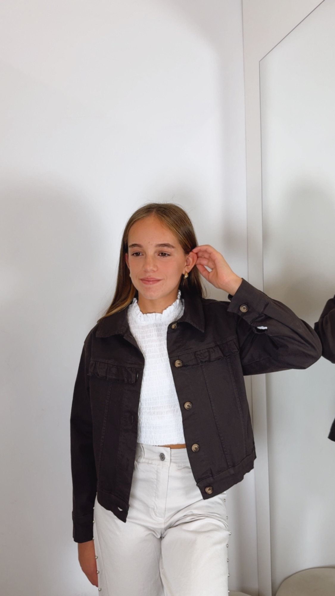 Chaqueta en tejido similar al Denim en color marrón chocolate con detalle de volante en la parte del pecho. Los botones se abrochan y también lleva botones al final de la manga.
