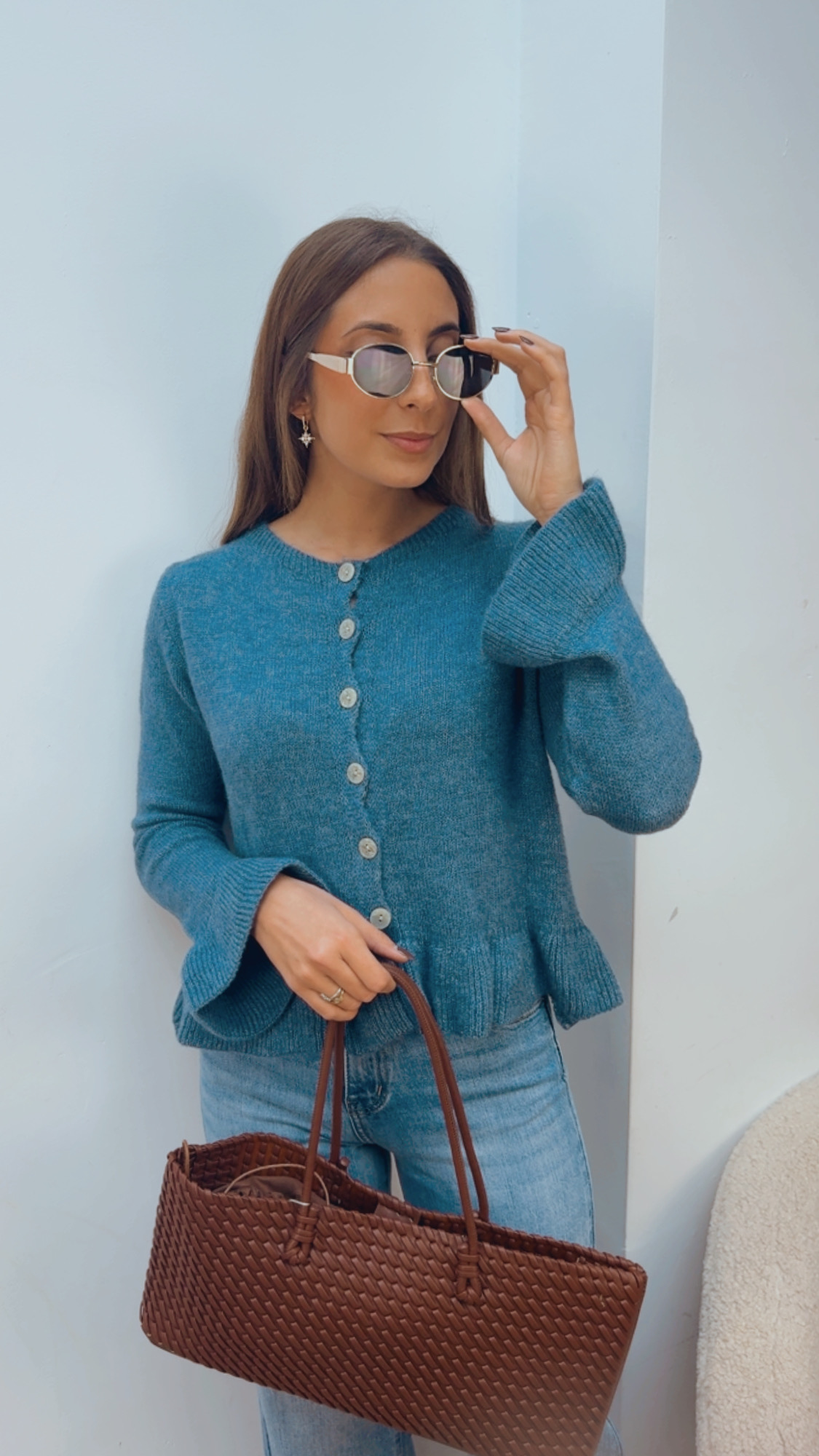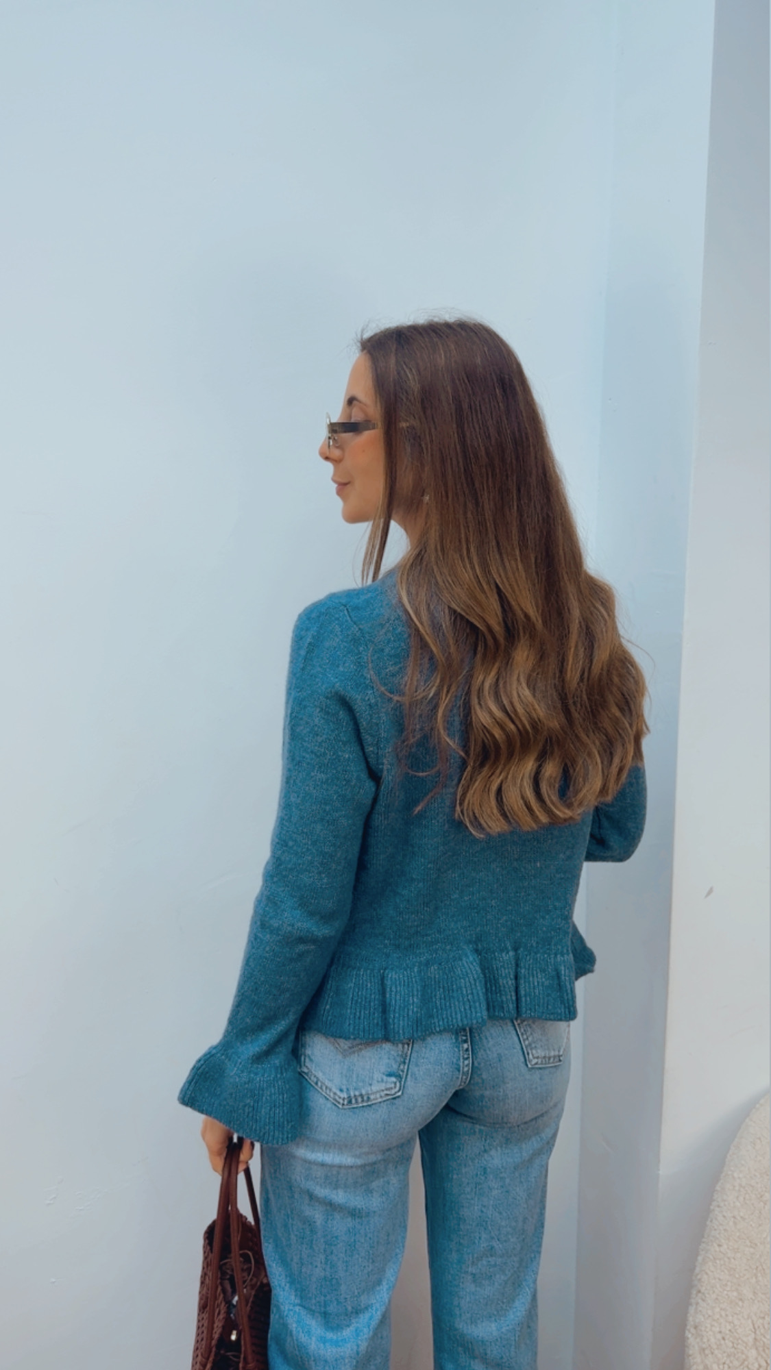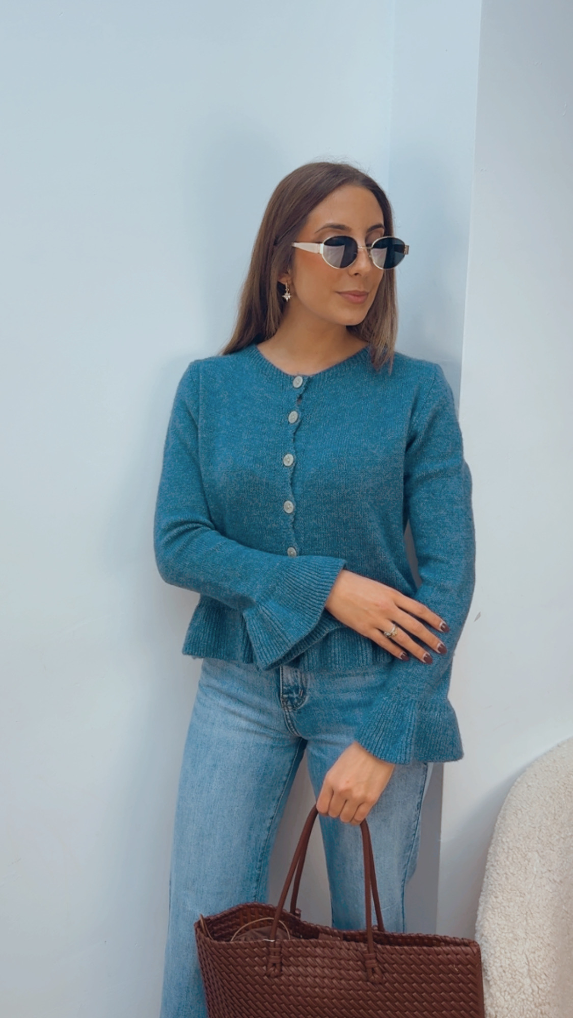 Chaqueta de punto manga larga abotonada hasta abajo con el detalle de volante en el final de la chaqueta y de las mangas. Nos solucionará cualquier look!!