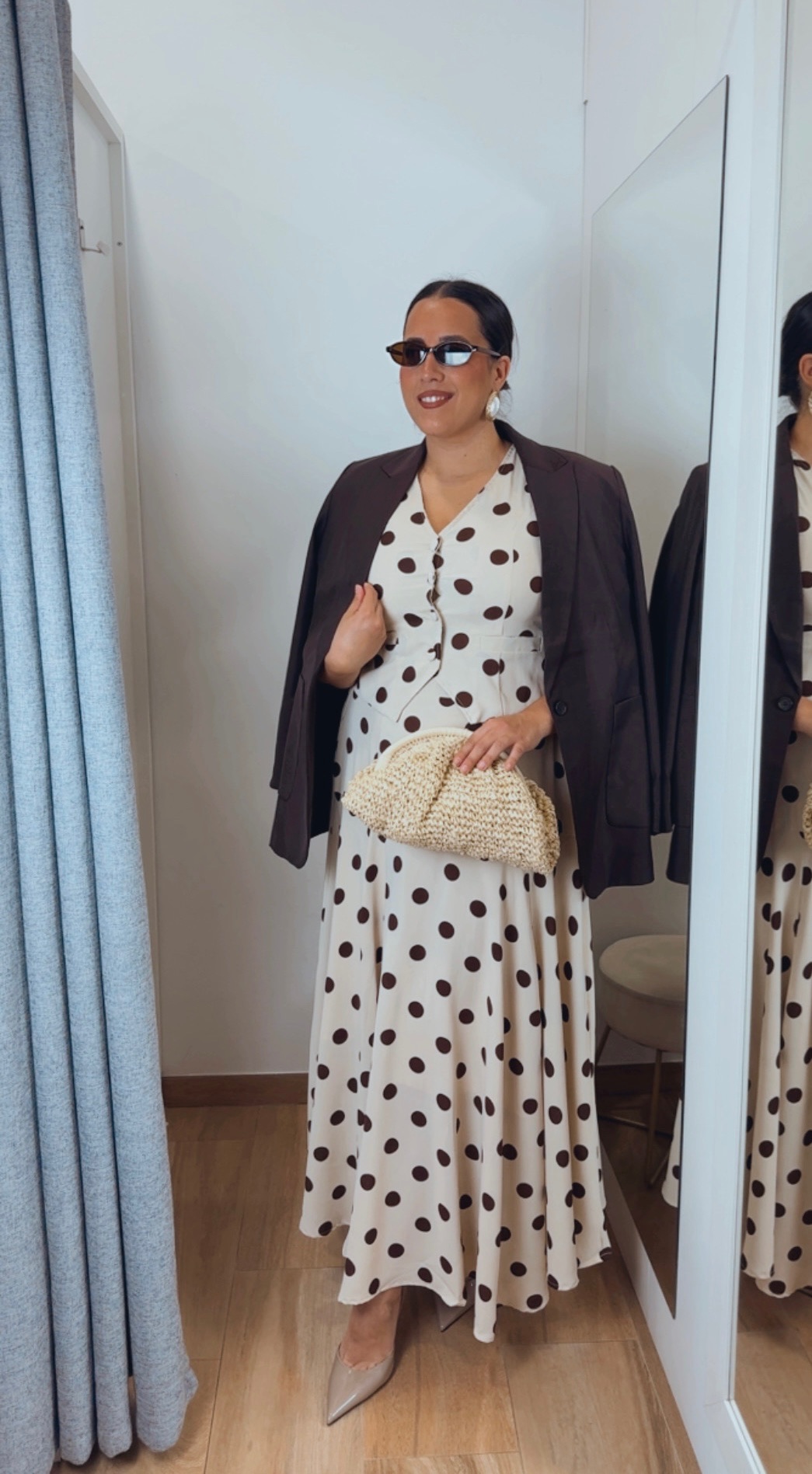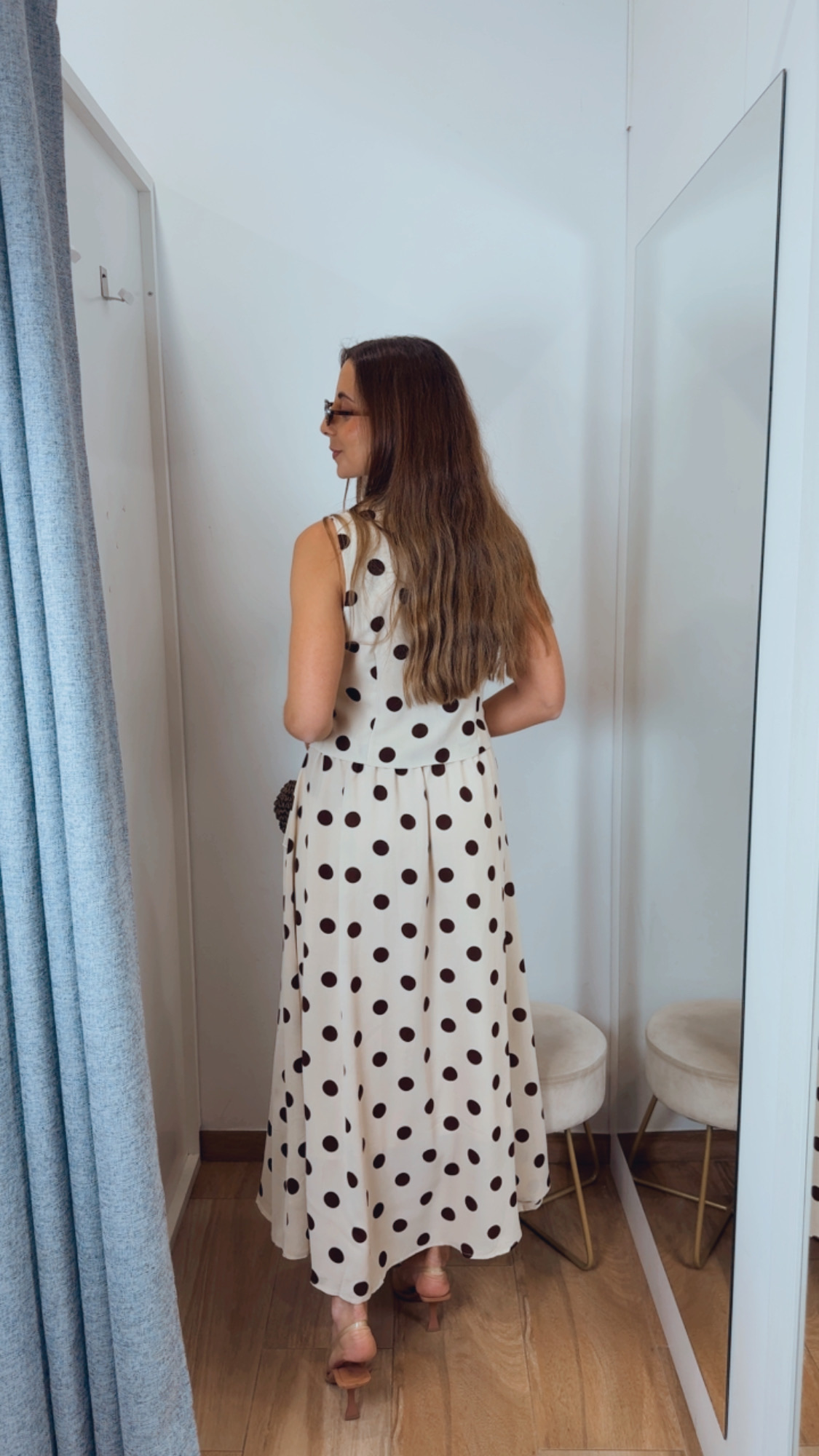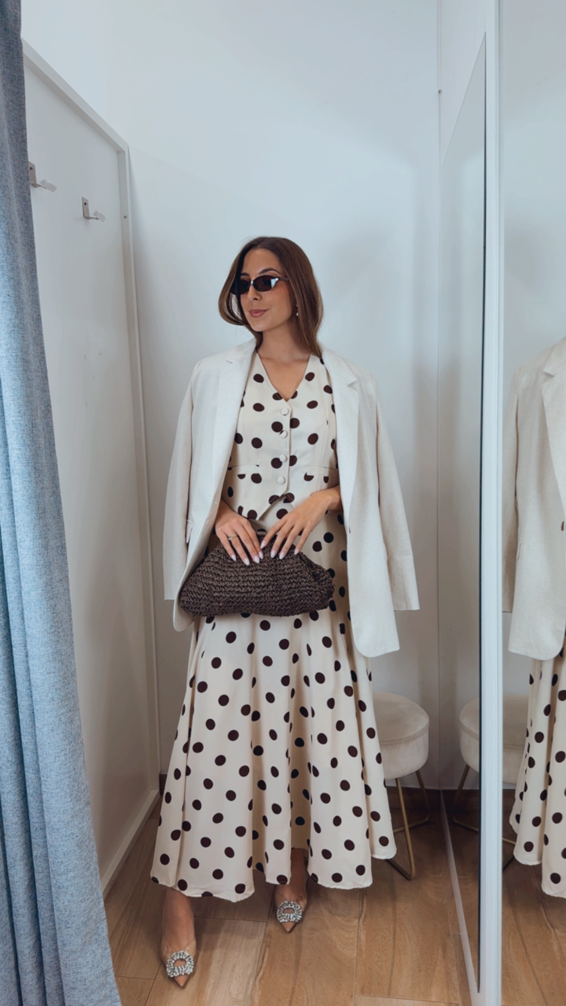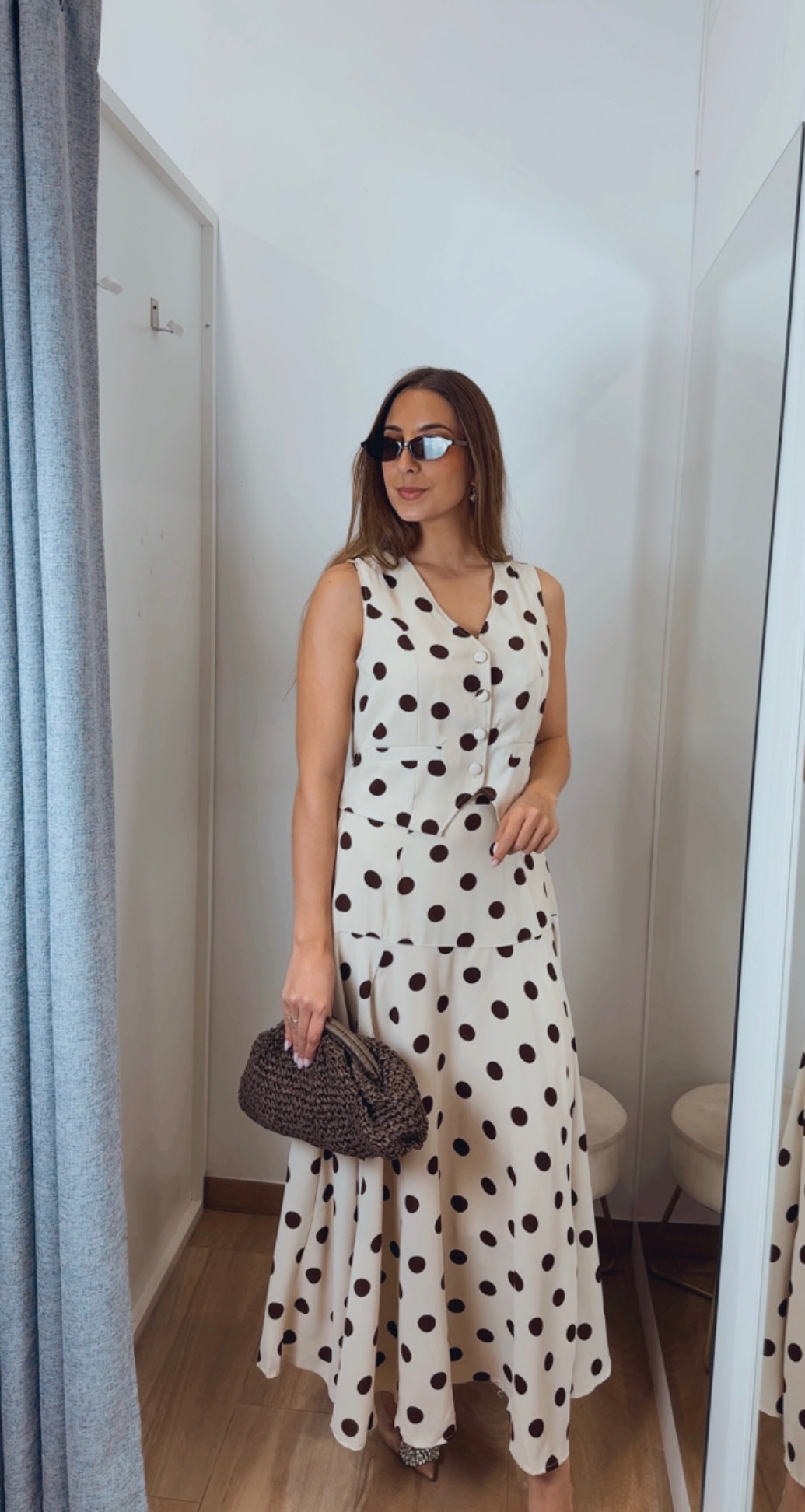 Conjunto de chaleco y falda en color beige con lunares en marrón chocolate, un look elegante y muy especial. El chaleco va abotonado con botones forrados y tiene interior forrado, aportando un acabado impecable.