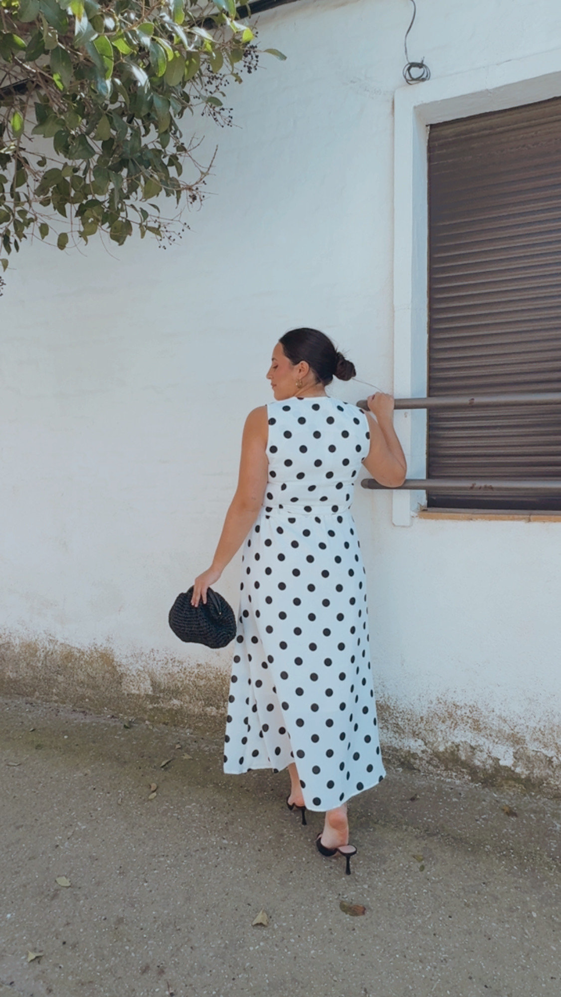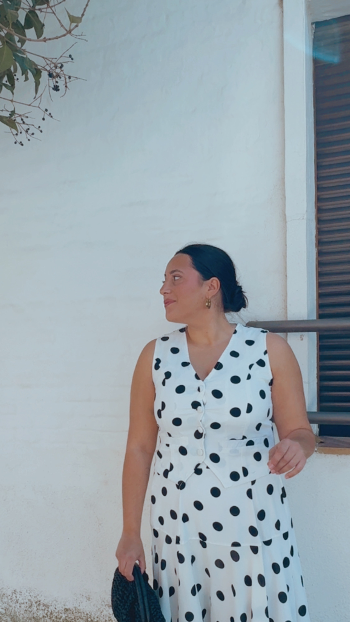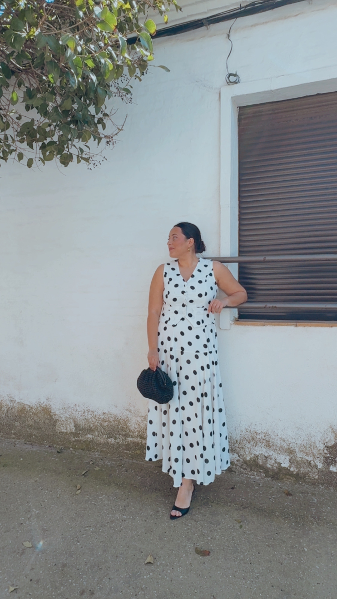 Conjunto de chaleco y falda en color blanco con lunares en negro , un look elegante y muy especial. El chaleco va abotonado con botones forrados y tiene interior forrado, aportando un acabado impecable.