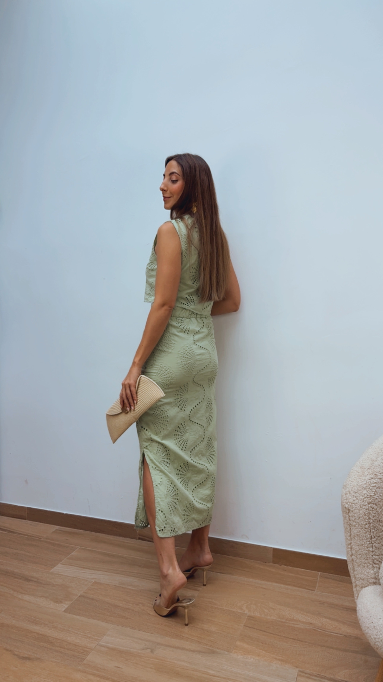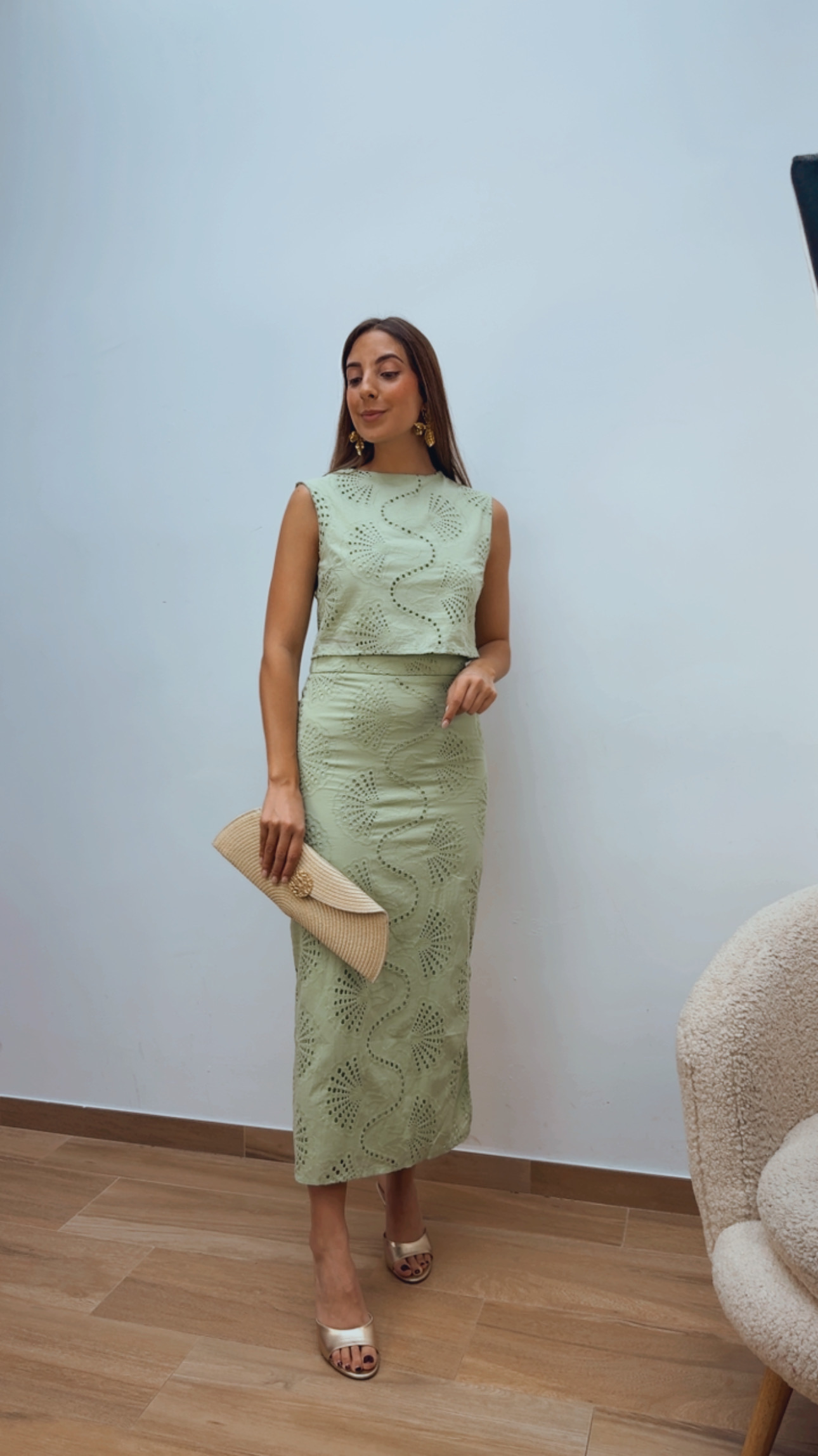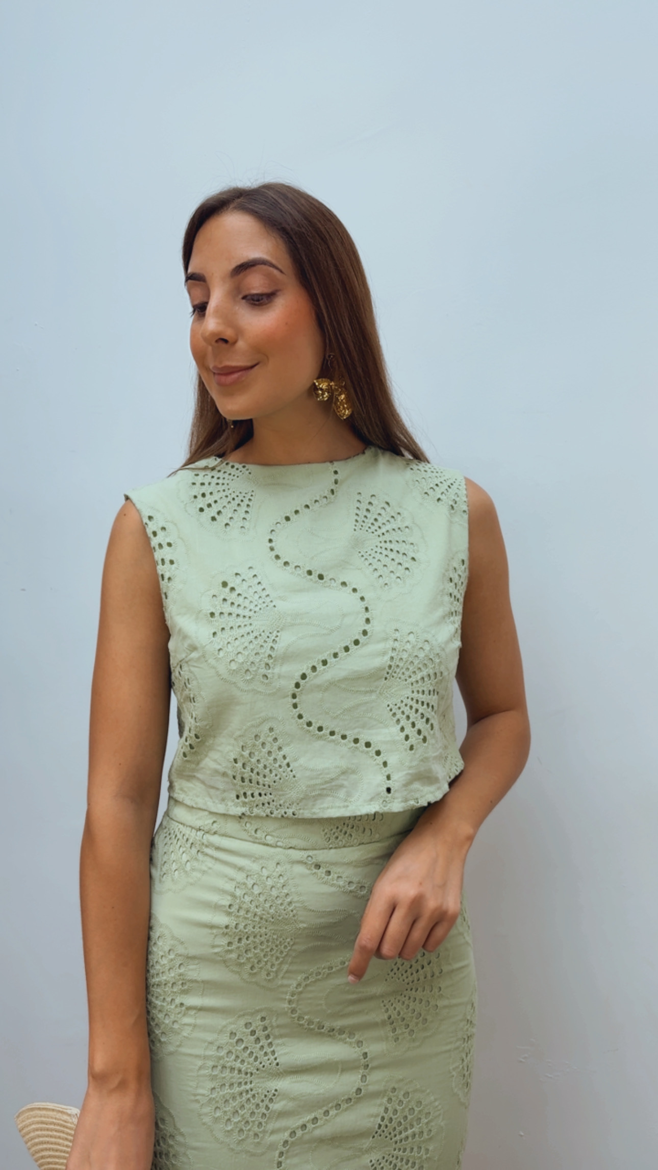 Conjunto de dos piezas en verde agua, con tejido perforado tanto en el top como en la falda, ambos forrados para mayor comodidad.