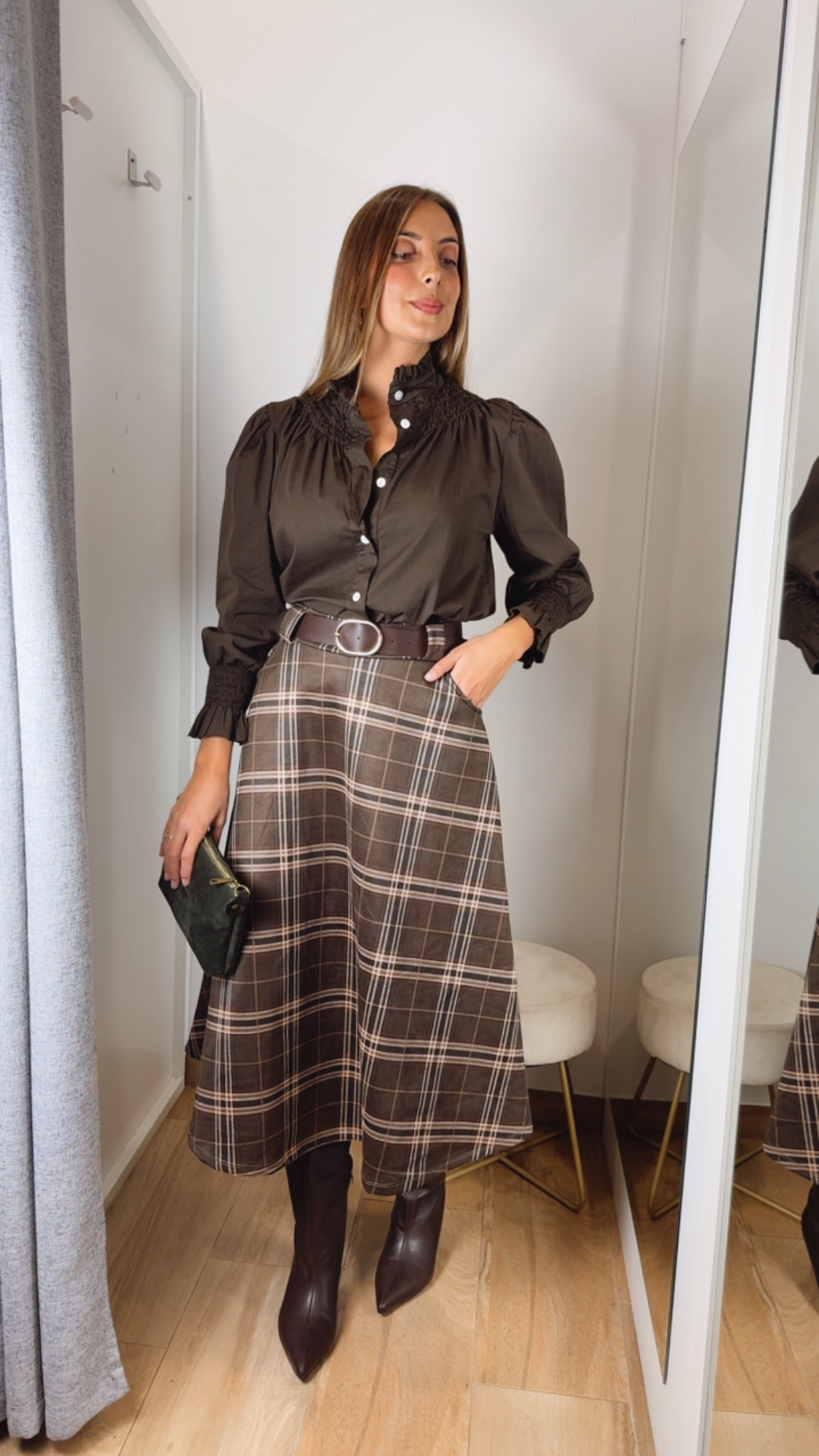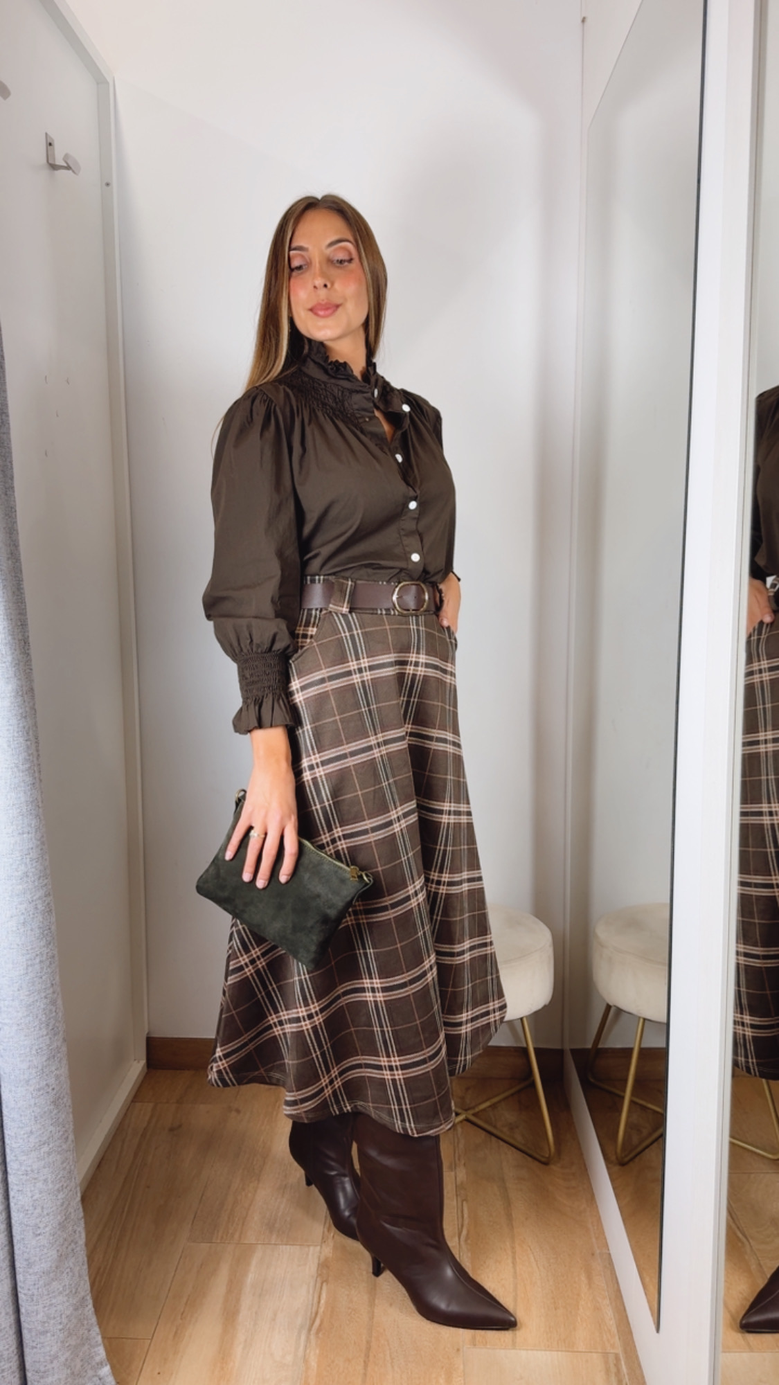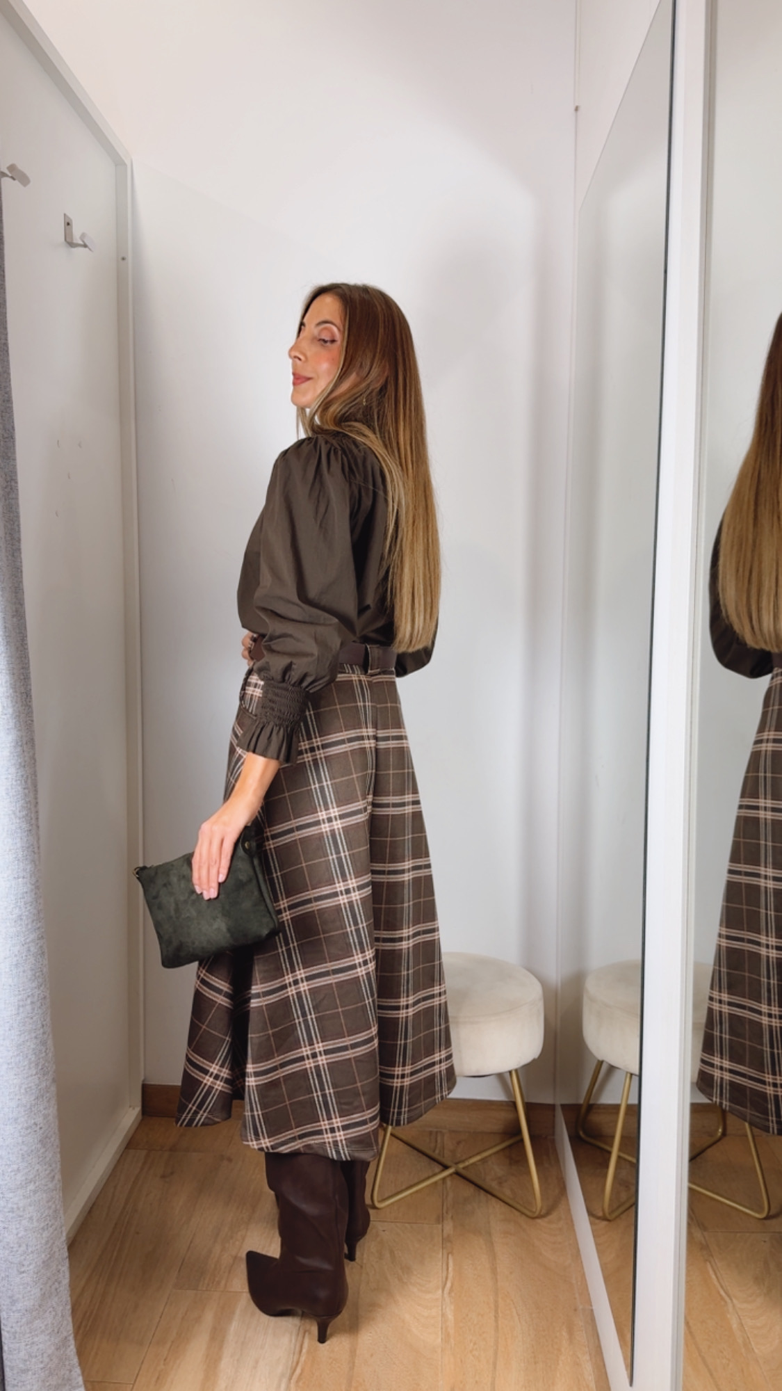 Falda de corte evasé con fondo en color marrón chocolate y detalle de cuadros en camel y beige. Lleva bolsillos y goma en la parte de la cintura para que se adapte mejor.