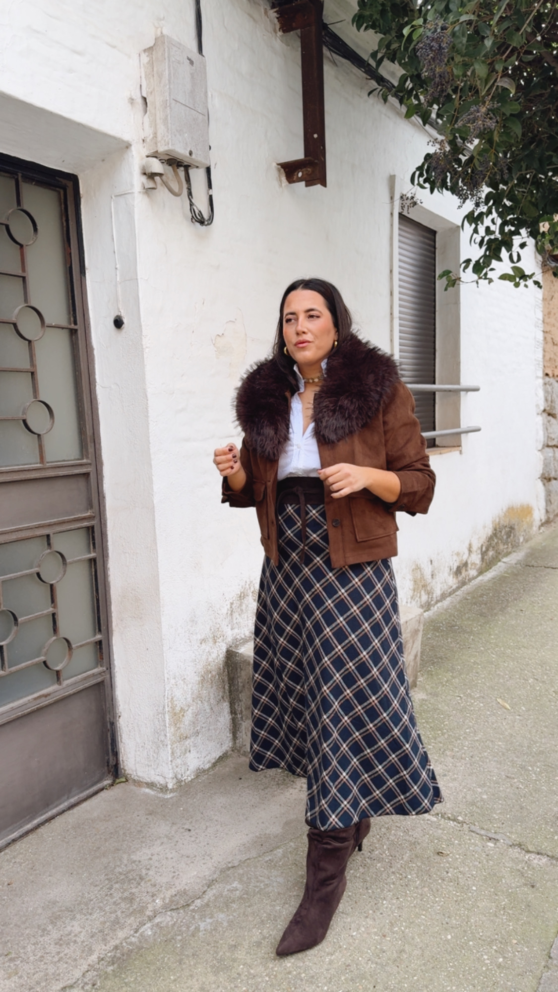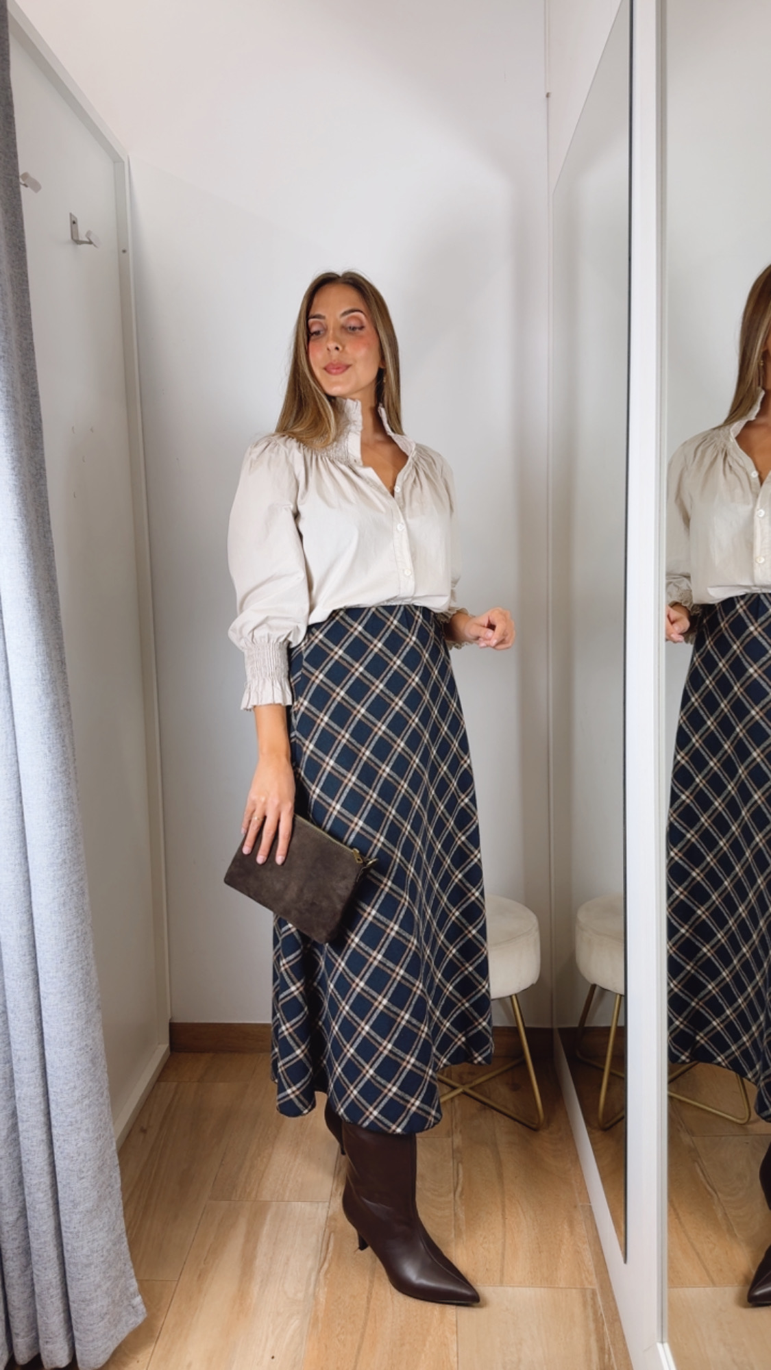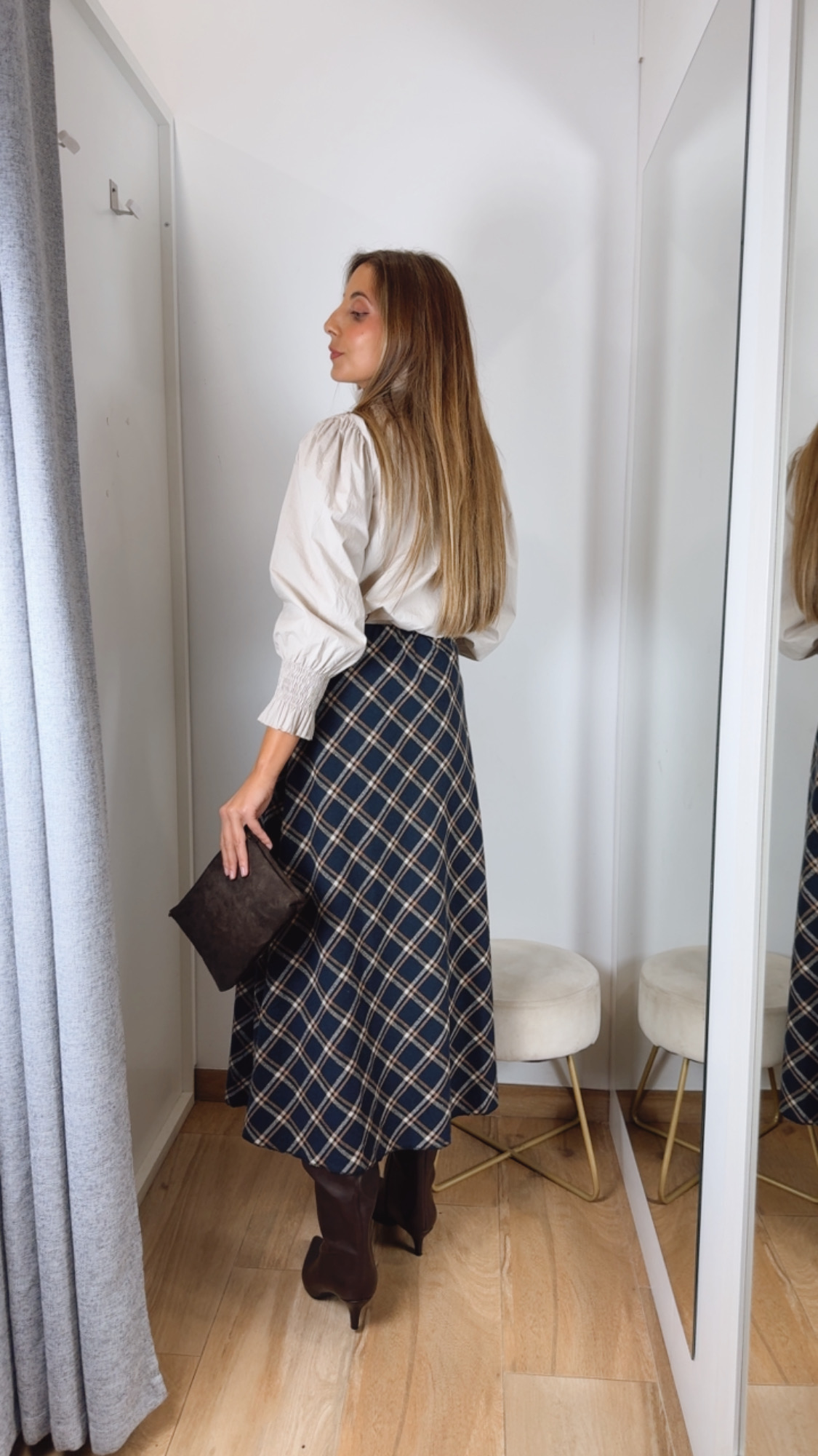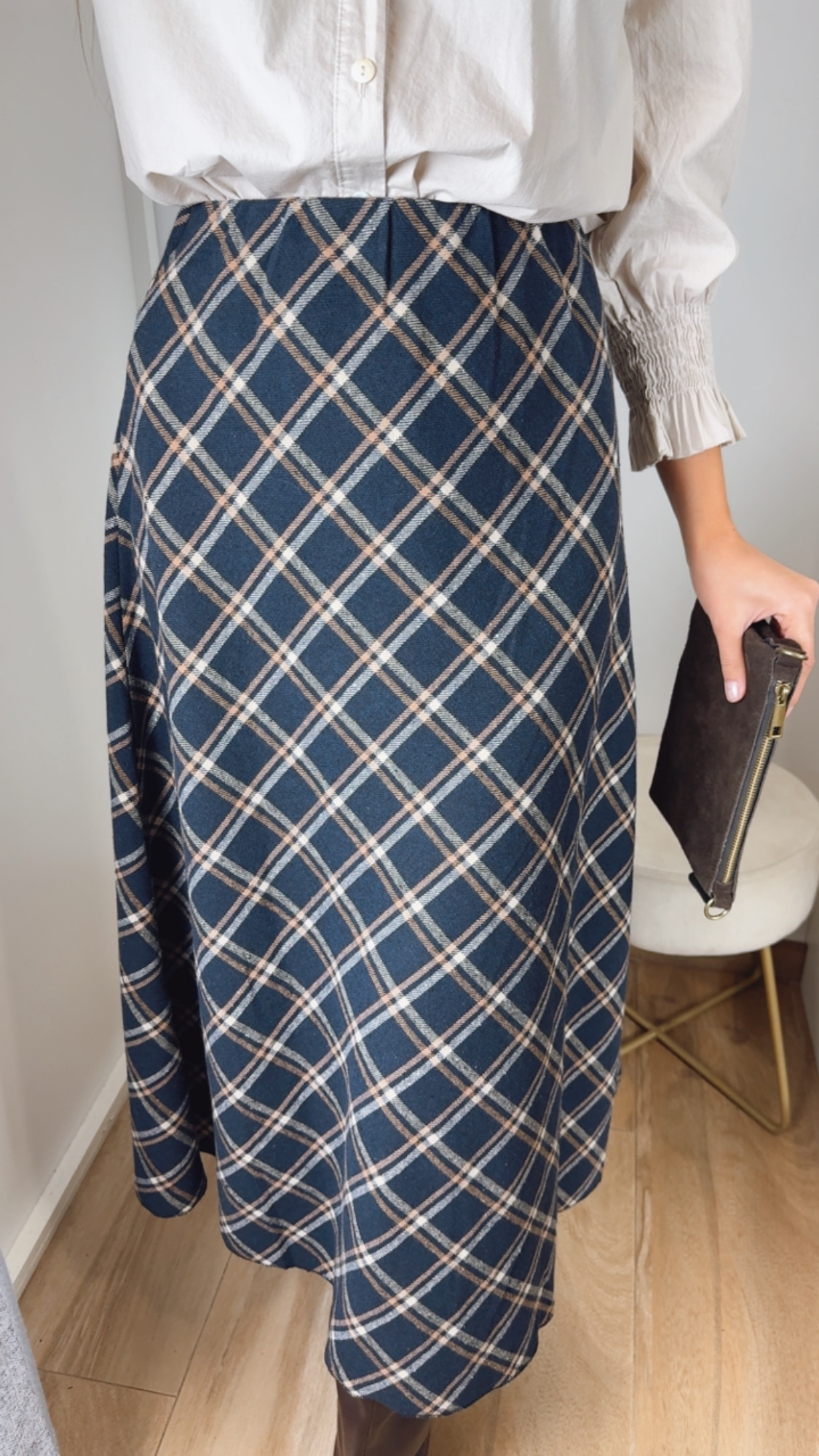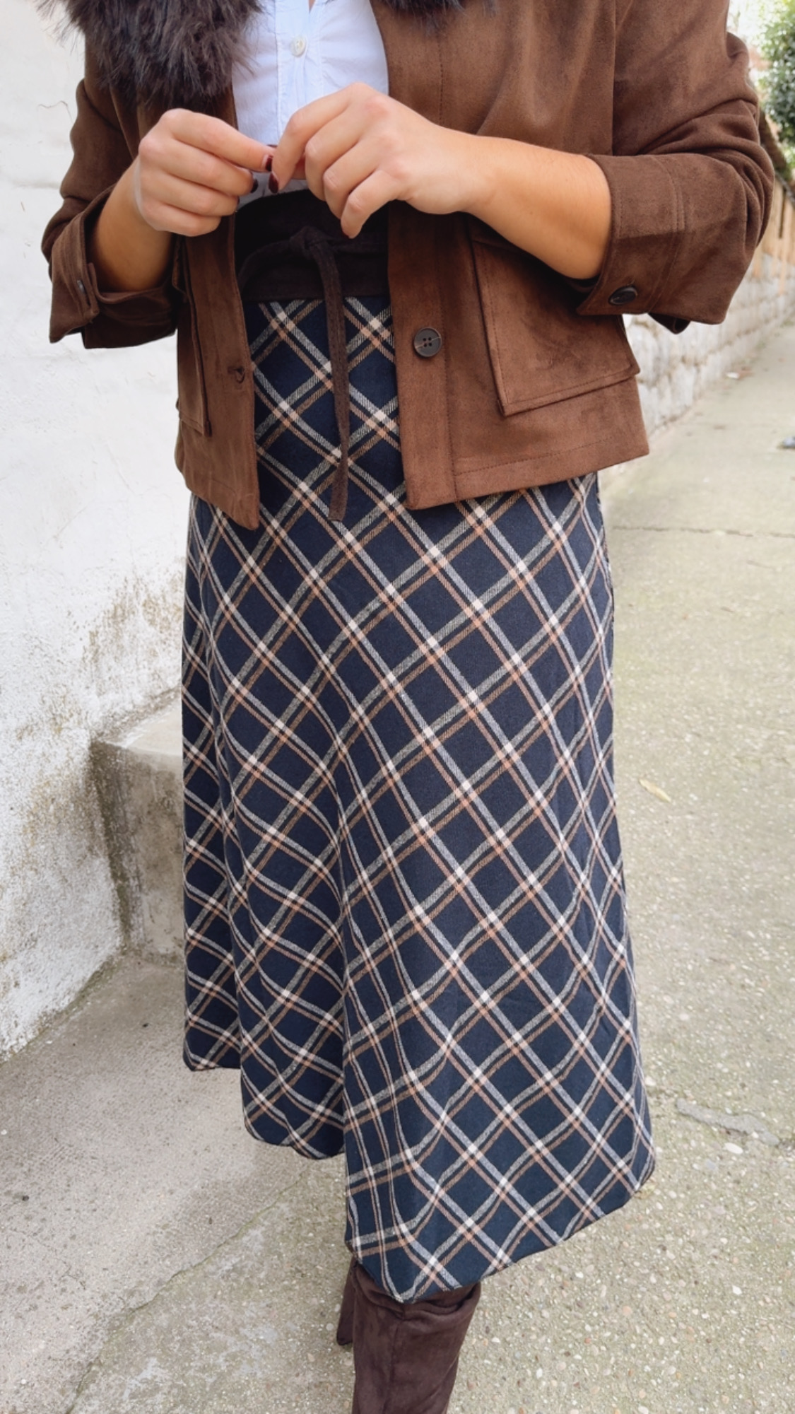 Falda de cuadros , fondo azul marino cuál es el detalle de los cuadros en color beige y camel de corte evasé ,con goma en la cintura sienta espectacular y el tejido de pañito .