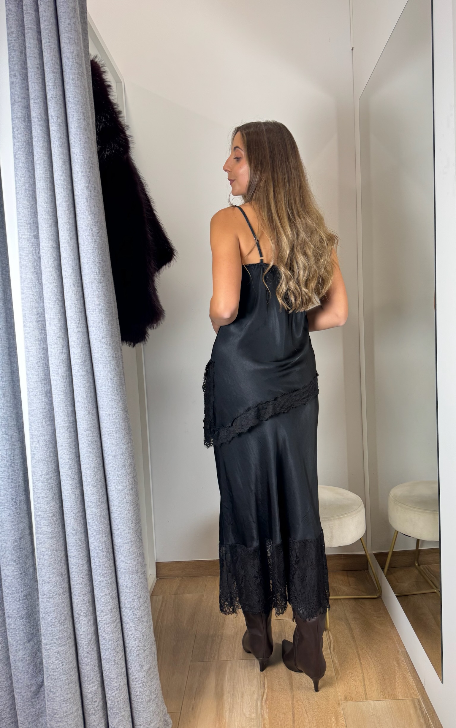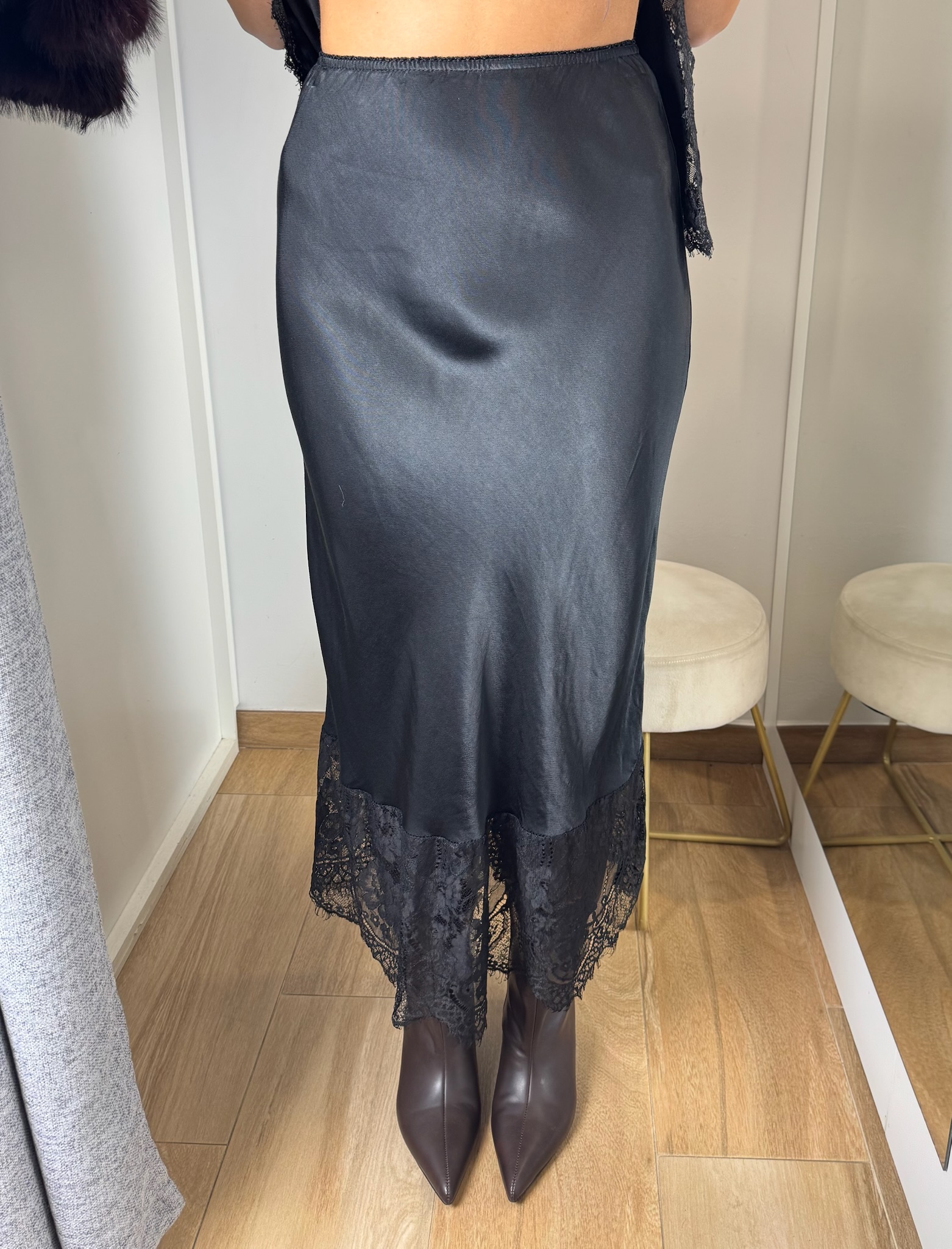 Falda satinada con detalle de puntilla en la parte final. Lleva goma en la cintura, lo que hace que se adapte super bien y sienta genial!
