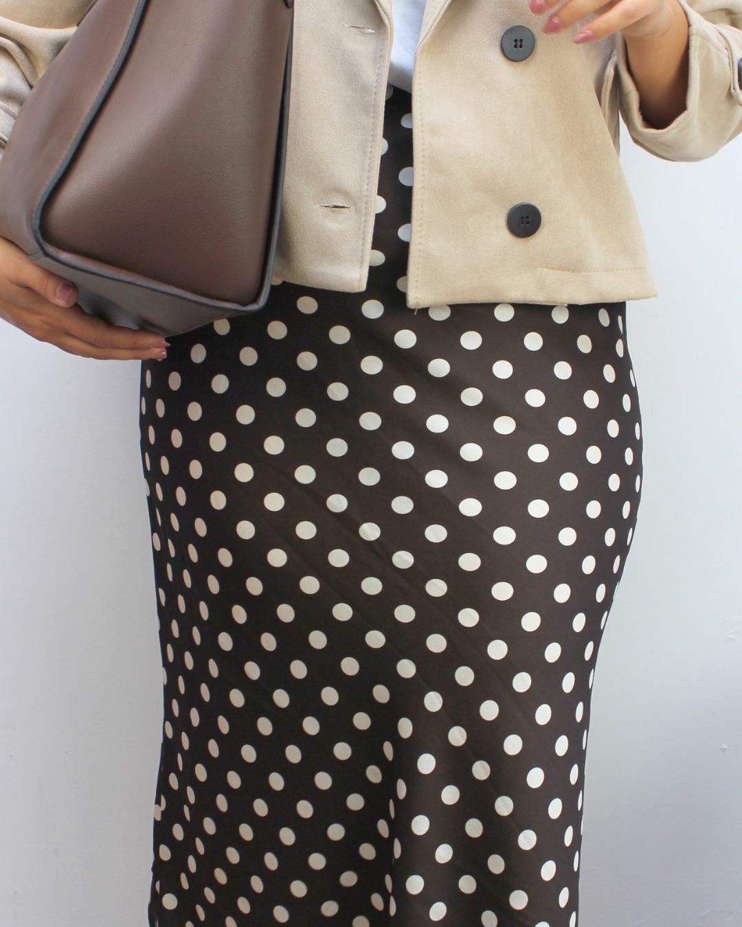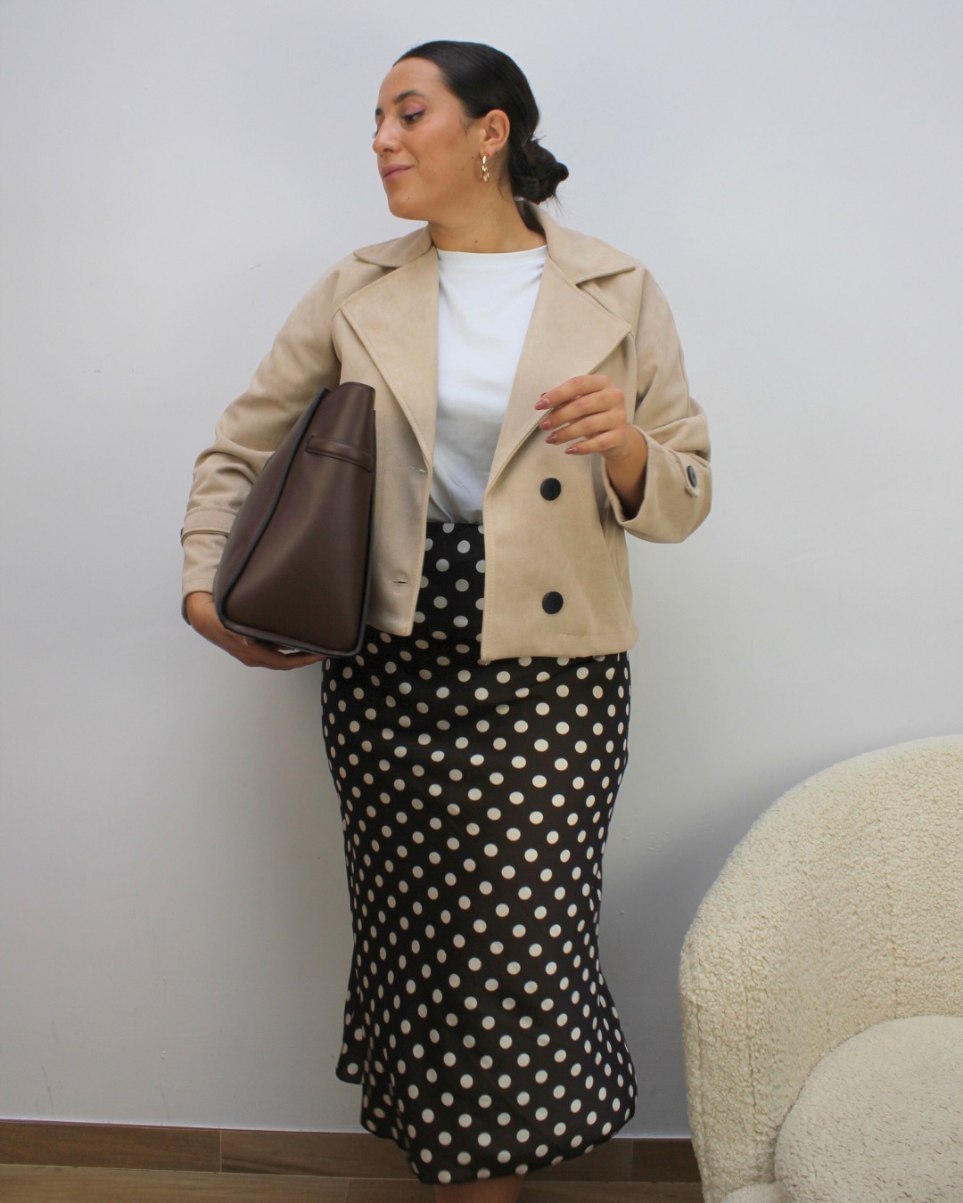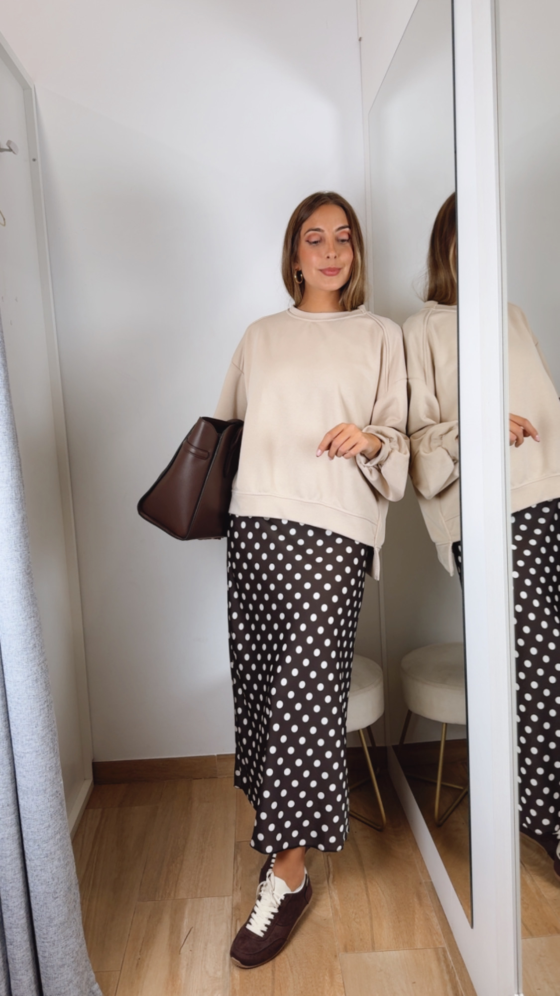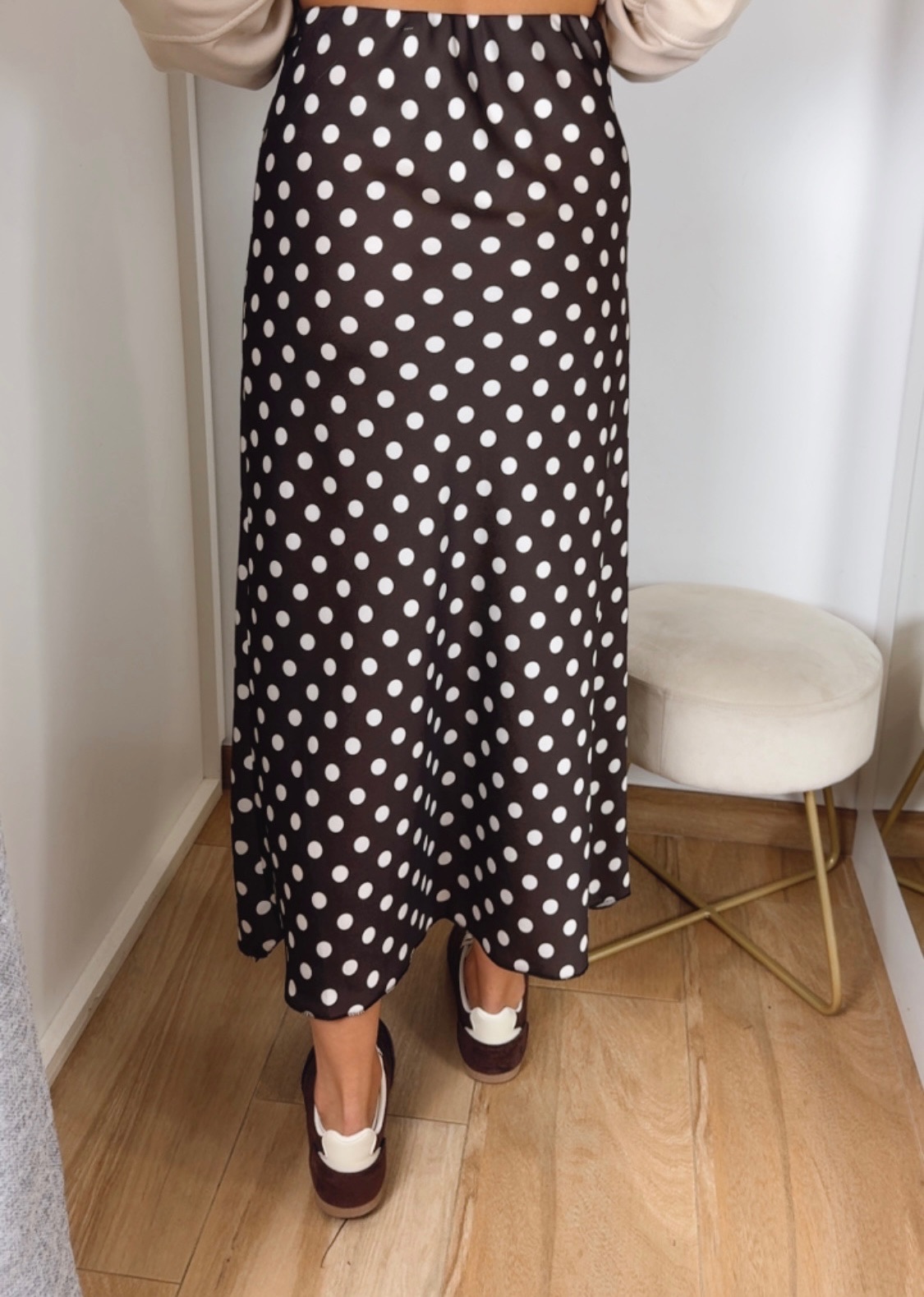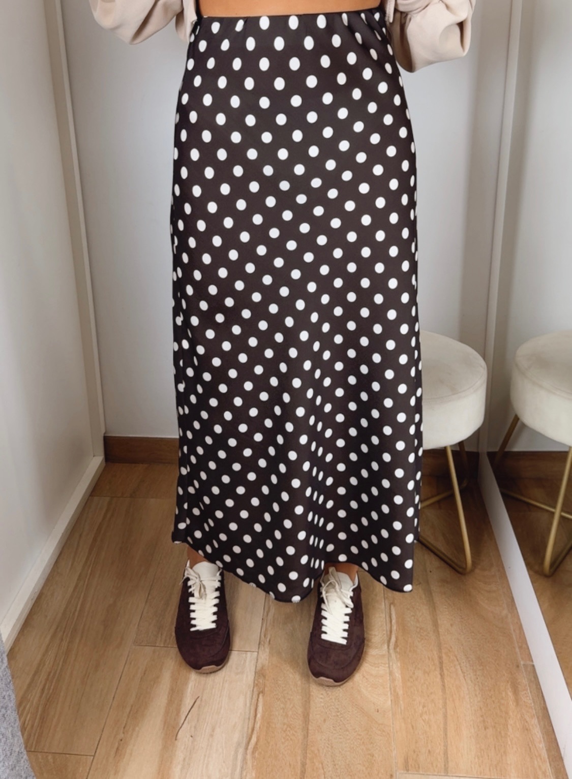 Falda de topos con fondo marrón chocolate y topos en beige. Tiene un tejido ideal y esta en super tendencia!