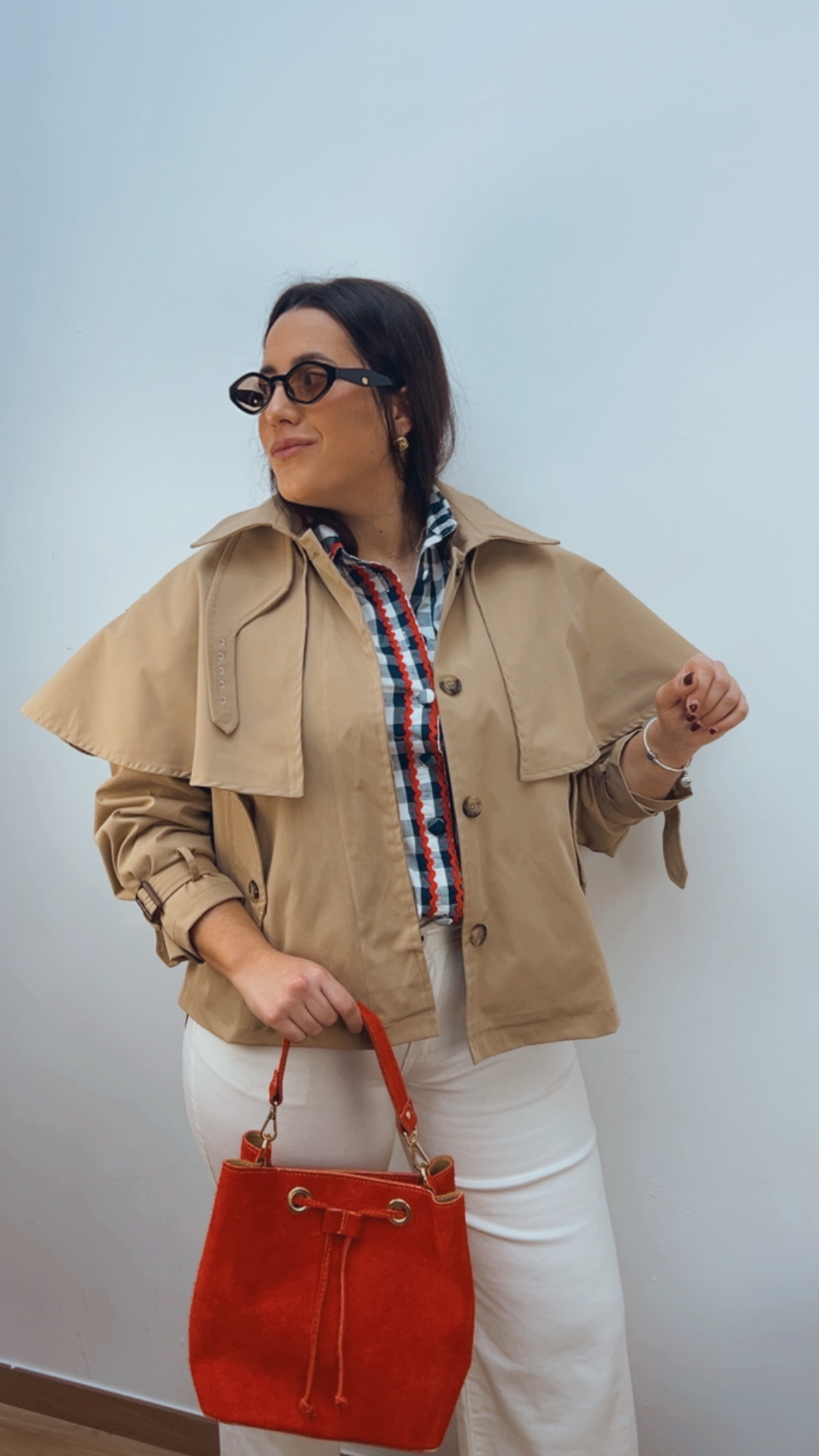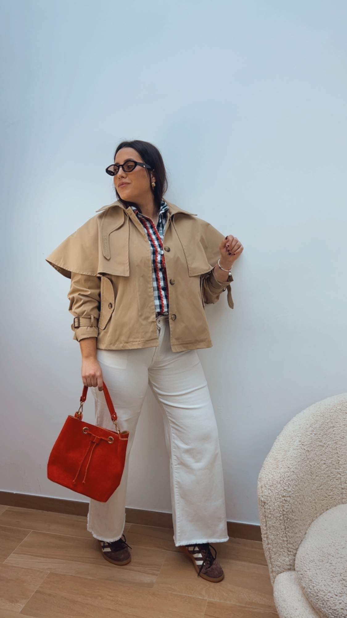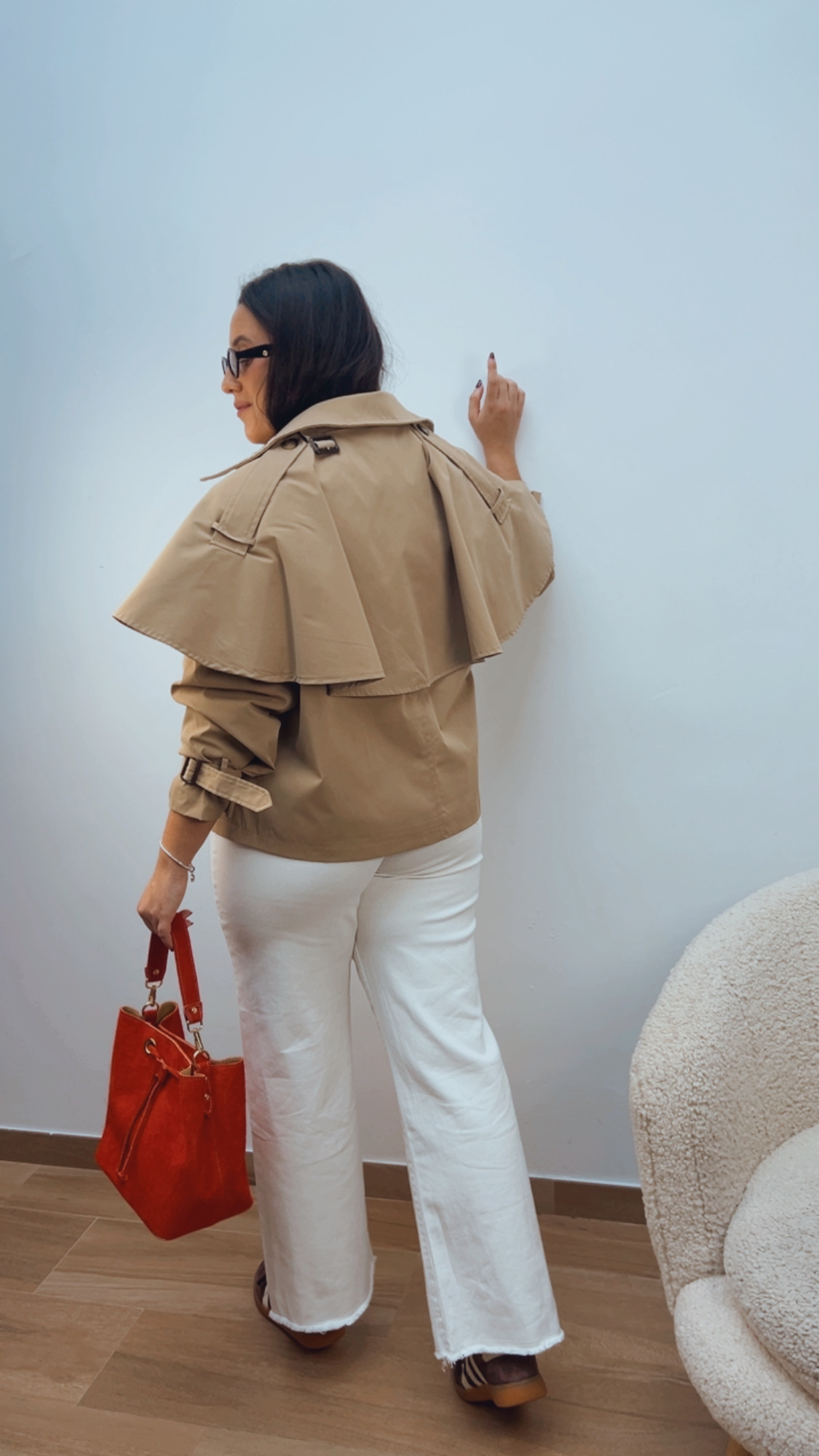 Gabardina corta con detalle de la capa que es desmontable. Los botones van por debajo del cuello por lo que cuando desmontan la capa no se ven y se queda una gabardina normal, va totalmente forrada.