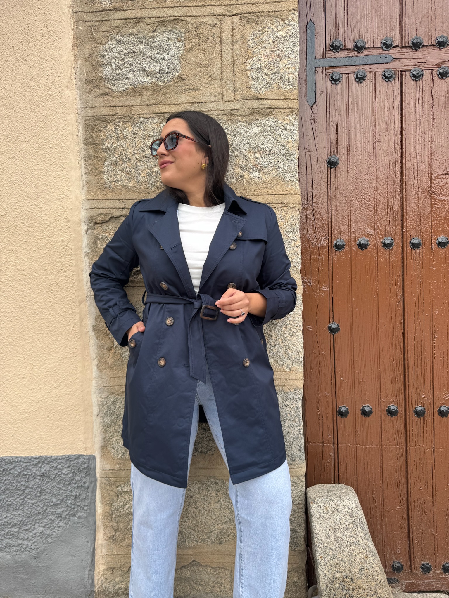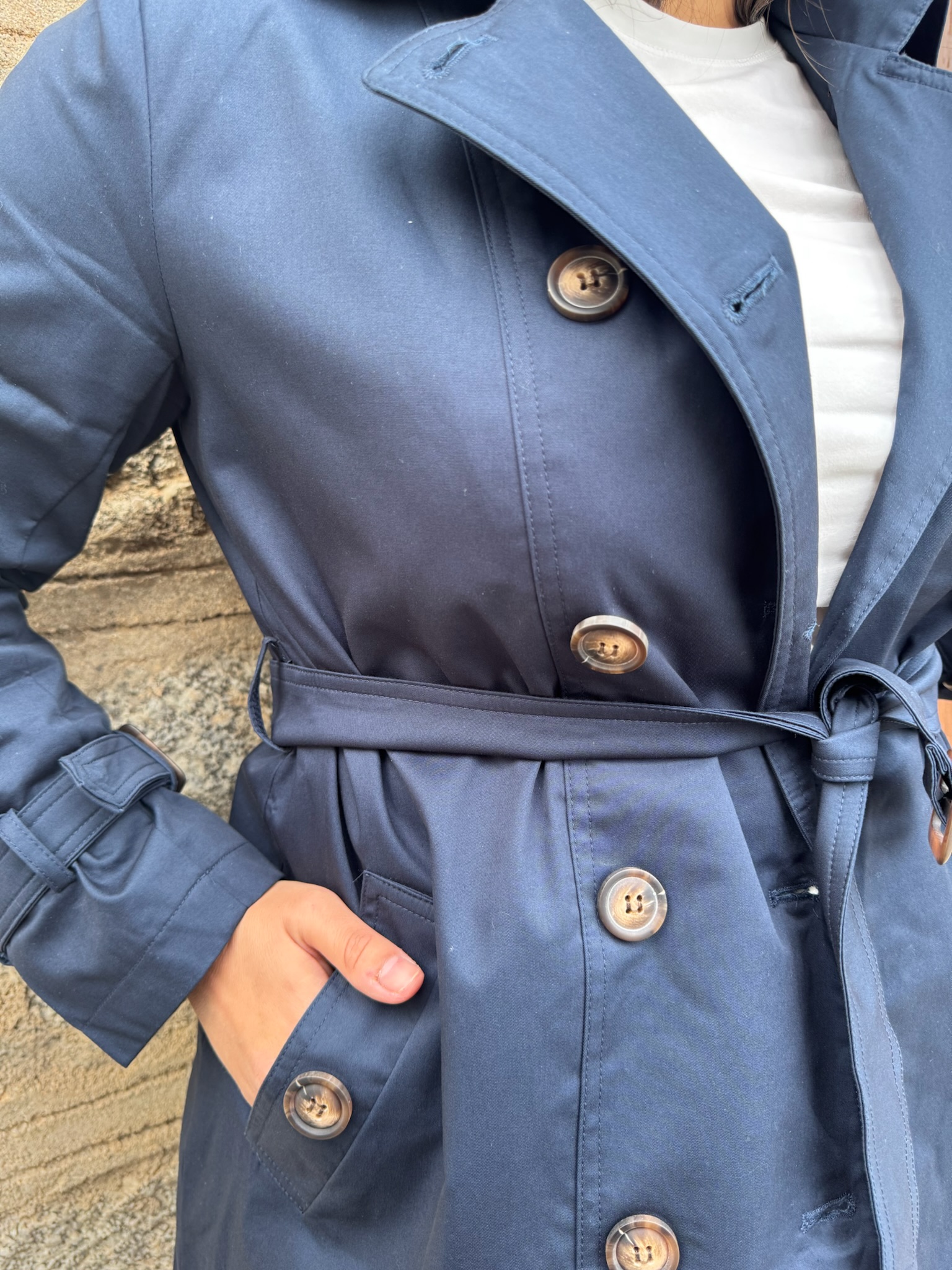 Clásica y elegante gabardina en color azul marino, una prenda atemporal imprescindible en cualquier armario. De manga larga y totalmente forrada, ofrece comodidad y un acabado impecable.